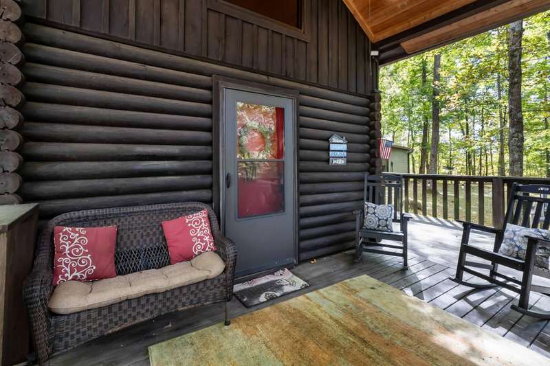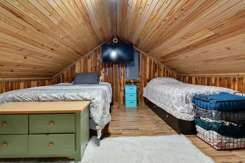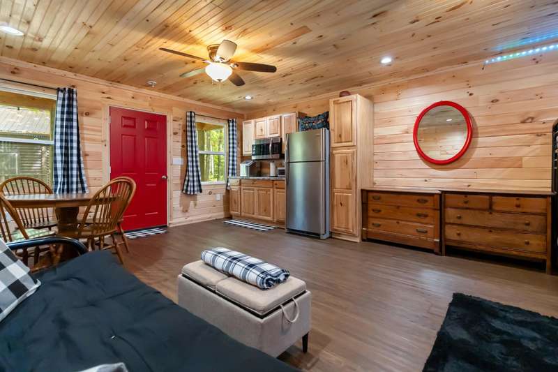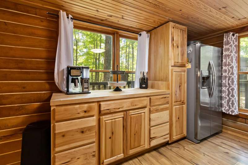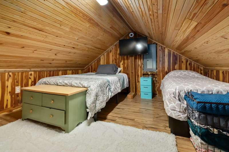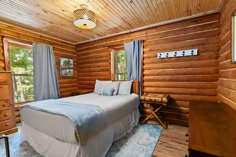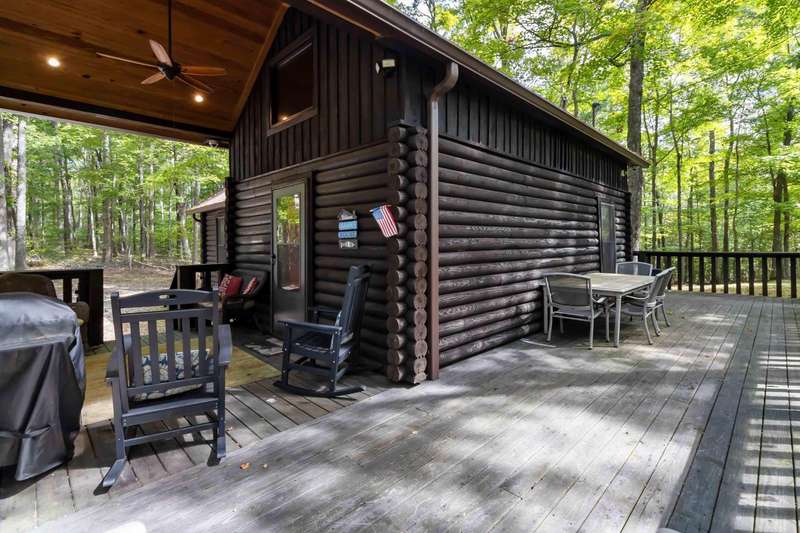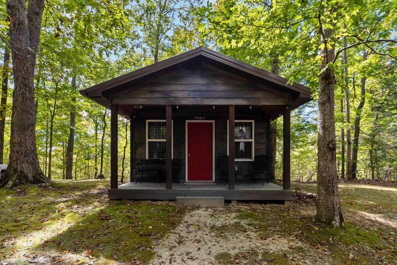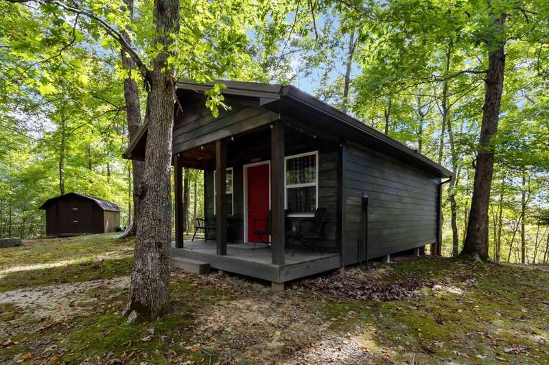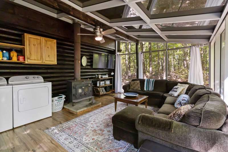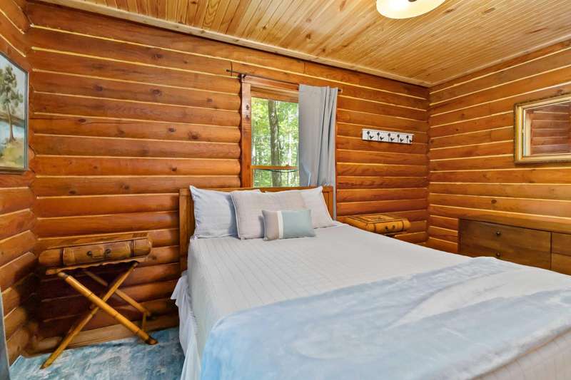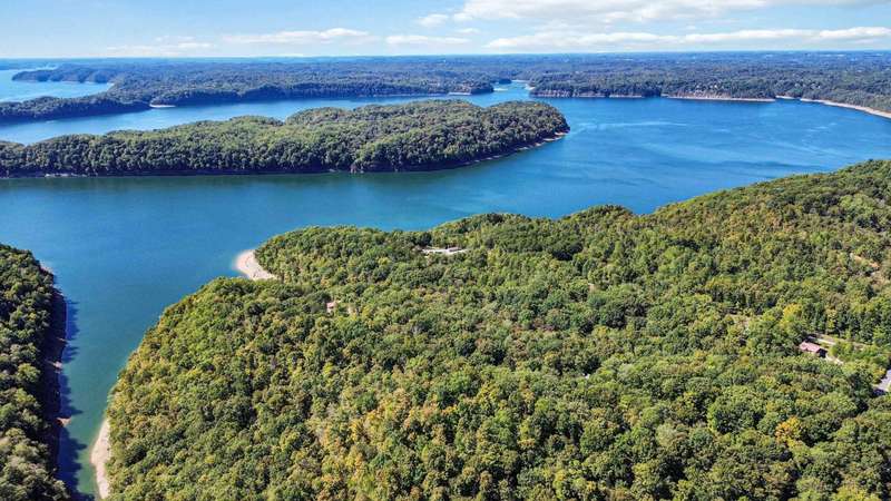 Nestled on nearly an acre of wooded land, this charming log cabin offers the perfect blend of rustic character and modern updates! Sitting on two lots totaling approx. 0.99 acre, the cabin is nicely perched above the road and tucked into the trees for privacy. Inside you'll find 1 designated bedroom plus a loft currently used as an additional sleeping area with 2 beds-altogether sleeping 5-6 people. The cabin is equipped with central heat and air, and the current owners have thoughtfully updated the kitchen and bathroom, refreshed the walls and ceilings with tongue-and-groove, upgraded the service panel, added spray foam insulation under the sunroom, gutters, and built a welcoming covered deck and porch. In 2022, they also constructed a 12x24 guest house that sleeps 6-7 with bunk beds (twin over fulls). The guest house is finished with tongue-and-groove walls and ceilings, LVP flooring, a Hardiboard exterior with metal roof, and a charming front porch. It includes a fridge, microwave, toaster oven, two TVs, and a dining table, all kept comfortable with a PTAC-style heating and cooling unit. While there is no water line to the guest house, it's the ideal setup for overflow guests, family, or friends. Best of all-this property is low maintenance with no grass to mow! Located just 2 miles to Wolf Creek Marina and close to multiple boat ramps on Lake Cumberland, you'll enjoy easy access to boating, fishing, and lake adventures. Whether you're looking for a private getaway, a short-term rental opportunity, or a unique lake-area retreat, this property has it all.