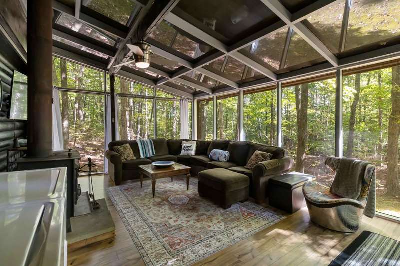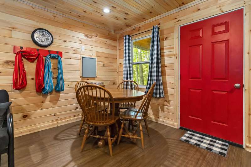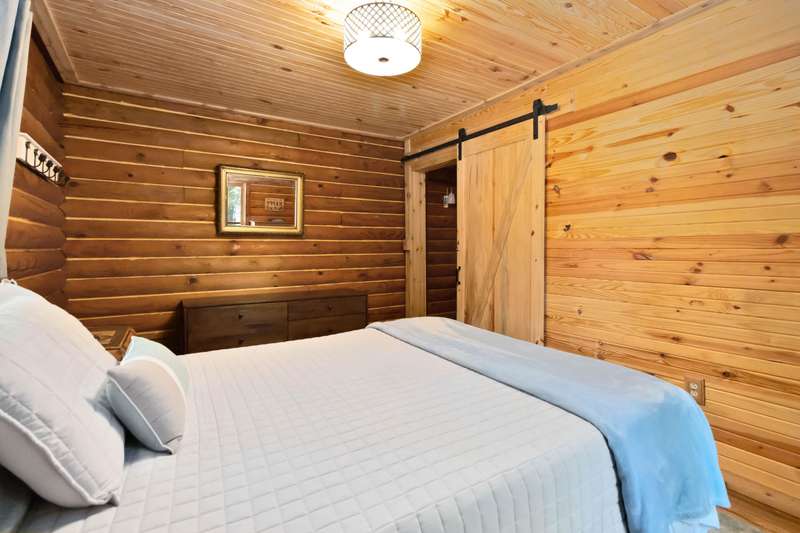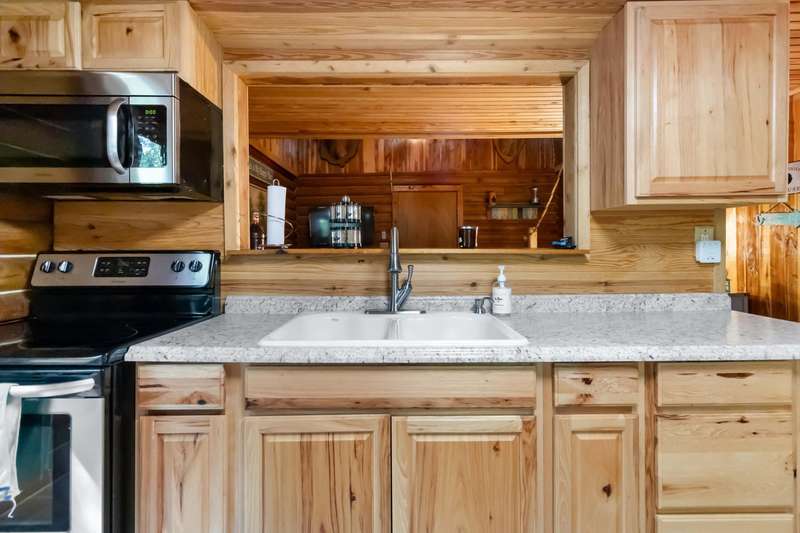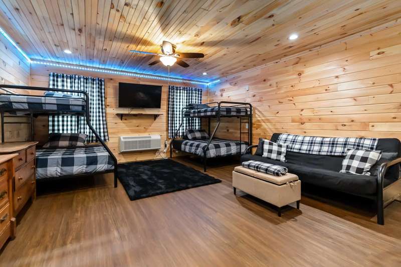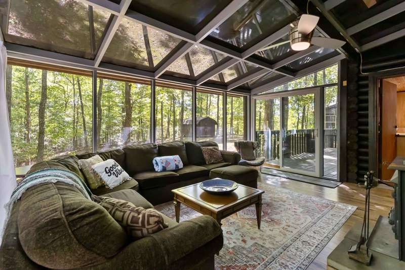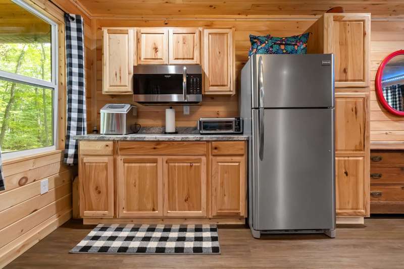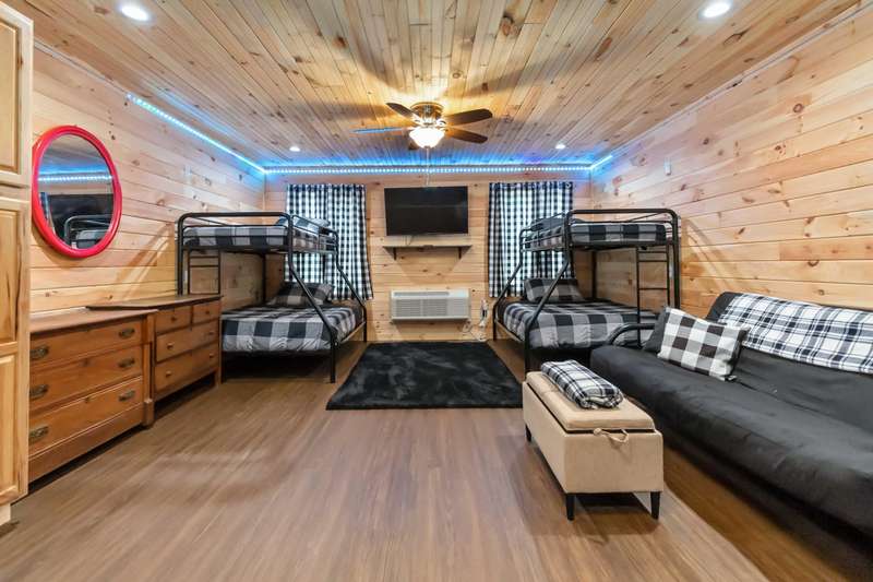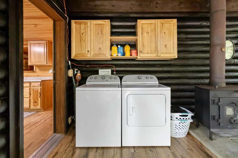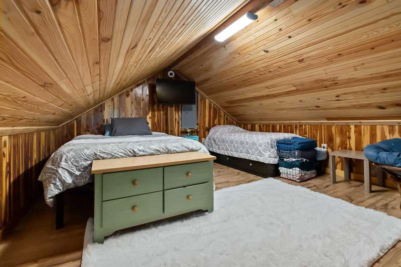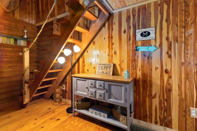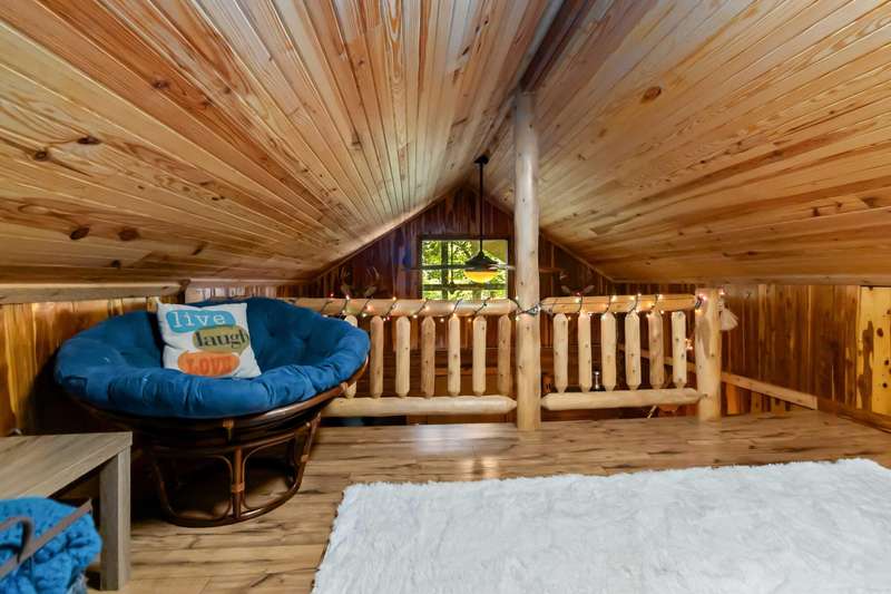 Nestled on nearly an acre of wooded land, this charming log cabin offers the perfect blend of rustic character and modern updates! Sitting on two lots totaling approx. 0.99 acre, the cabin is nicely perched above the road and tucked into the trees for privacy. Inside you'll find 1 designated bedroom plus a loft currently used as an additional sleeping area with 2 beds-altogether sleeping 5-6 people. The cabin is equipped with central heat and air, and the current owners have thoughtfully updated the kitchen and bathroom, refreshed the walls and ceilings with tongue-and-groove, upgraded the service panel, added spray foam insulation under the sunroom, gutters, and built a welcoming covered deck and porch. In 2022, they also constructed a 12x24 guest house that sleeps 6-7 with bunk beds (twin over fulls). The guest house is finished with tongue-and-groove walls and ceilings, LVP flooring, a Hardiboard exterior with metal roof, and a charming front porch. It includes a fridge, microwave, toaster oven, two TVs, and a dining table, all kept comfortable with a PTAC-style heating and cooling unit. While there is no water line to the guest house, it's the ideal setup for overflow guests, family, or friends. Best of all-this property is low maintenance with no grass to mow! Located just 2 miles to Wolf Creek Marina and close to multiple boat ramps on Lake Cumberland, you'll enjoy easy access to boating, fishing, and lake adventures. Whether you're looking for a private getaway, a short-term rental opportunity, or a unique lake-area retreat, this property has it all.