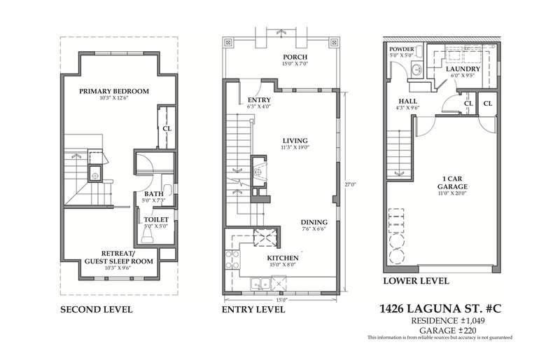 Welcome to one of the most exquisitely appointed homes in the highly sought after Laguna Court association. Built in 2005 with high quality and quintessential Craftsman style, this end unit enjoys a coveted location with exceptional natural light and a landscape buffer providing more privacy. The thoughtfully designed floor plan offers a primary suite on the top floor, with glimpses of the ocean and Channel Islands. The Retreat Room provides versatility as a guest room, home office, den, etc. Meticulous attention to detail is evident in the recently renovated kitchen and primary bathroom. Stay cool with (2) AC mini splits. Store the car and beach toys in the private garage and stroll to world class restaurants, shopping, and entertainment in the heart of Downtown Santa Barbara! Conveniently located less than a mile to the Santa Barbara Mission and Rose Garden, Alice Keck Park, the ARTS District, and the Public Market. Enjoy the ultimate lock and leave lifestyle in Santa Barbara's Bungalow Haven!