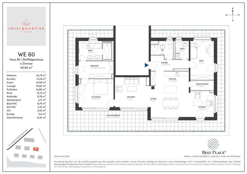 Penthouse living on a new level: move into your TOP-equipped new-build penthouse in the Inselquartier Eiswerder soon. This light-flooded penthouse apartment impresses with its exquisite furnishings and timeless elegance. The heart of the apartment is the open-plan living area: it offers enough space for a dining table where you can get together with family and friends for a delicious dinner and for a cozy seating area where you can relax at the end of the day. The penthouse also has a device for a fireplace. Floor-to-ceiling windows open up a spectacular view of the water, providing fascinating impressions at any time of day. Another highlight is the wrap-around terrace: here you can enjoy breakfast with the family with breathtaking views or treat yourself to a glass of wine while watching picturesque sunsets and enjoying life to the full. In the two spacious bathrooms, you will find high-quality brand-name products, a rain shower and a bathtub that promises pure wellness. An elevator takes you conveniently to your apartment door, and the penthouse also has an underground parking space. Here you can live in an exclusive and peaceful environment while enjoying the amenities of the Berlin metropolis. An ideal retreat for couples and families!