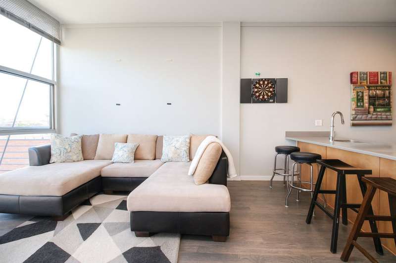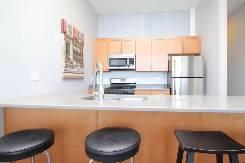 Top floor condo quality unit available in West DePaul's sleek luxury rental development. Elevator building with unit featuring floor to ceiling windows, 10' ceilings, stainless steel appliances, Quartz counters, hardwood floors, central A/C, en-suite primary bedroom, 14x6 private balcony with great views and massive front load Washer/Dryer in unit. Building has a great fitness center and common roof deck. Close to shops, restaurants, parks, nightlife & public transportation. Heated Garage Parking available for additional $200/month. Utility BURPS Fee: 2BD: $130/month (1 GBPS internet, gas, water, trash, recycling)