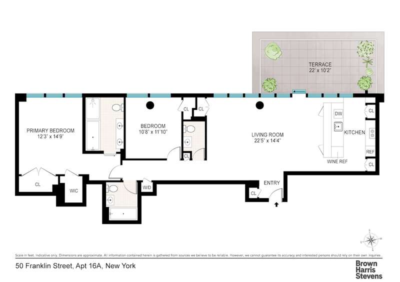 Welcome to Apartment 16A at 50 Franklin Street-a rare, light-filled 2-bedroom, 2.5-bathroom home featuring a generously sized private terrace that truly sets this residence apart. With soaring 9-foot ceilings, floor-to-ceiling windows, and an open, modern layout, this home offers a seamless blend of sophistication, comfort, and functionality.