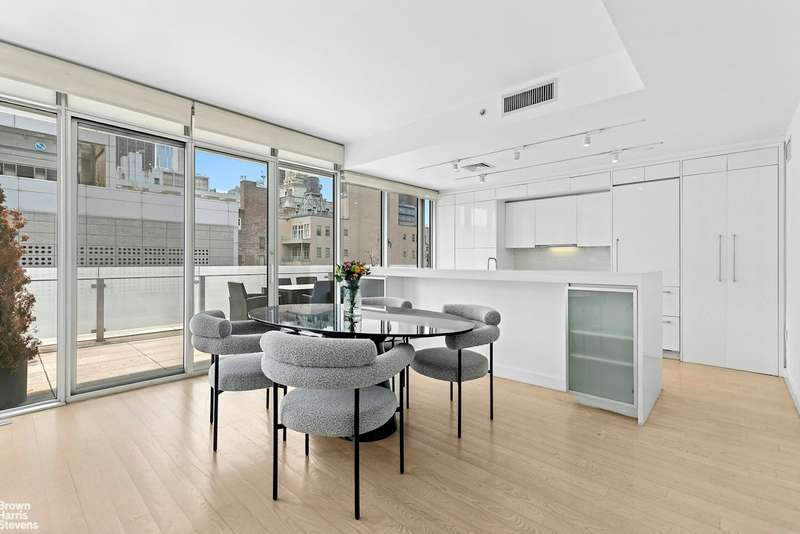 A spacious great room easily accommodates both living and dining areas, flowing effortlessly into the sleek, renovated open kitchen-perfect for entertaining. The kitchen is outfitted with full-sized appliances, bar seating, and a wine fridge, with direct access to the terrace-ideal for al fresco dining or relaxing in the sun. The south-facing exposure floods the apartment with beautiful natural light throughout the day.