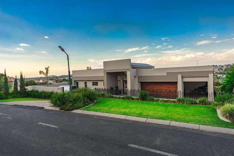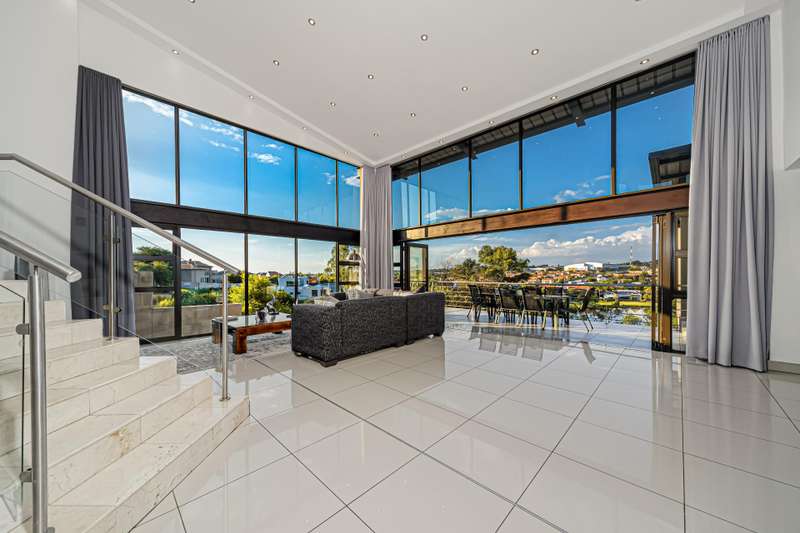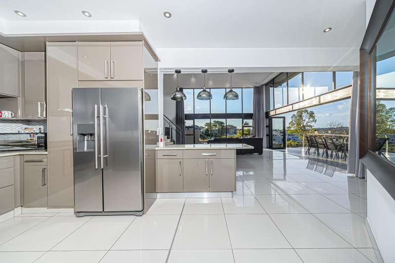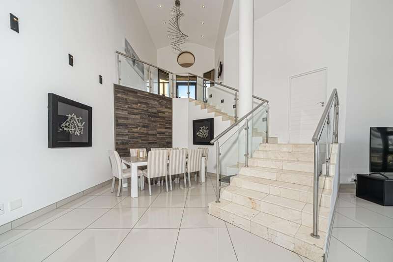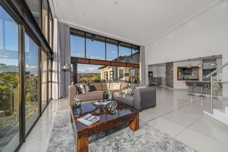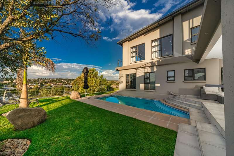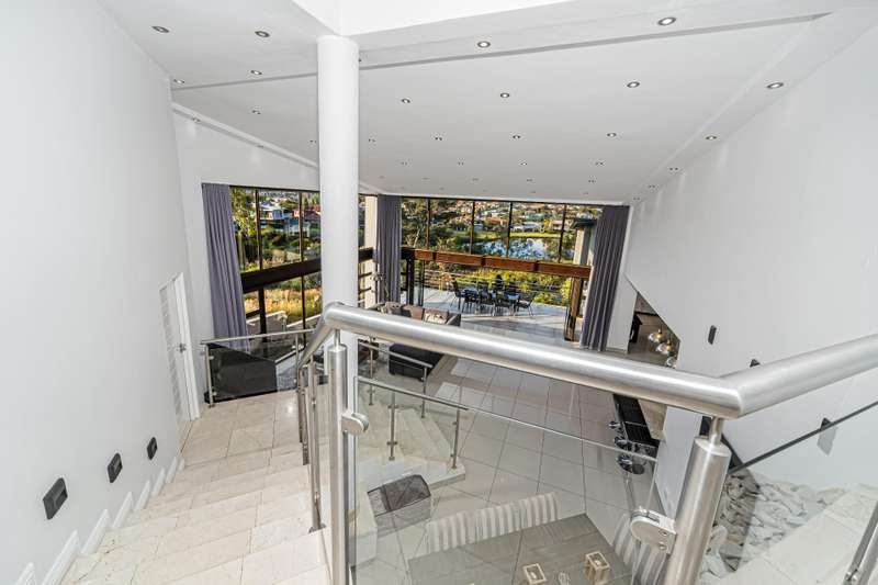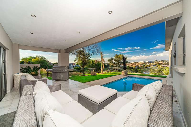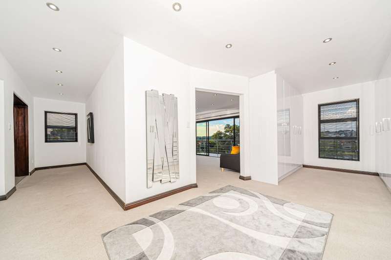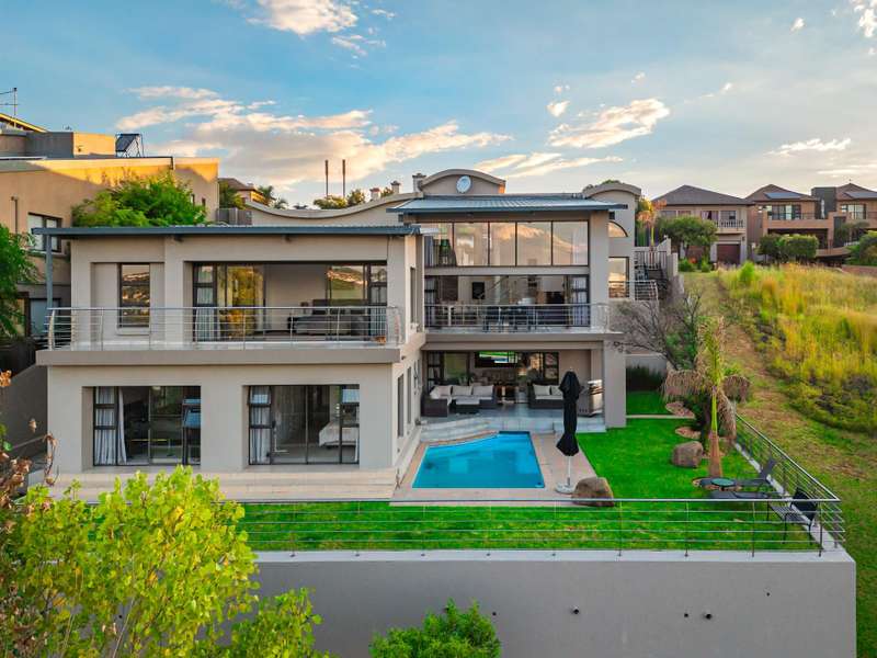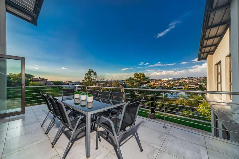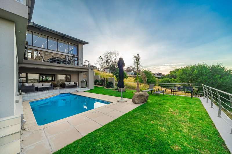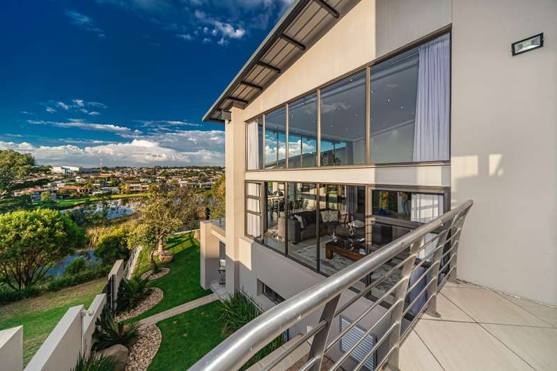 Positioned on the golf course, it offers spectacular views of the golf course and surrounding lakes. A magnificent home is set apart from the rest. This North facing home is situated in a quiet part of the Estate, next to a greenbelt area offering you tranquillity and privacy. There is a guest suite on the upper level. There is also a study on this level The double volume main living area include an open plan with lounge, dining room and gourmet kitchen that all open up with stacking doors. The lower level has a sunning entertainment area. A spacious lounge that opens onto a covered patio and pool area. There is a separate entertainment room with built-in bar. There are 4 enormous bedrooms all en-suite, and all have gorgeous views of the golf course and fishing dams. There are 3 garages with plenty of off road parking. Staff accommodation and a large area that could be used as second study or extra bedroom.