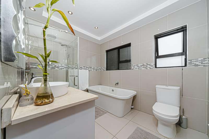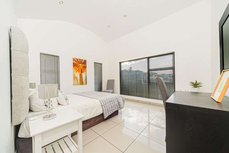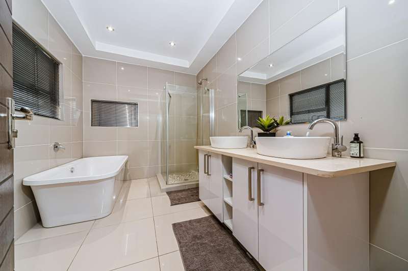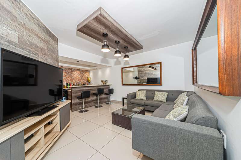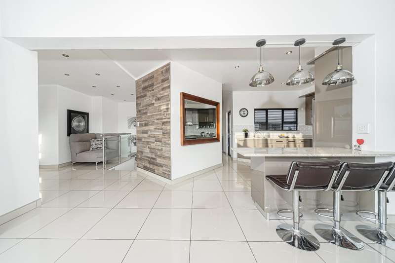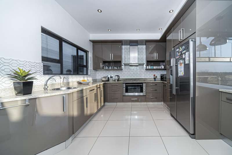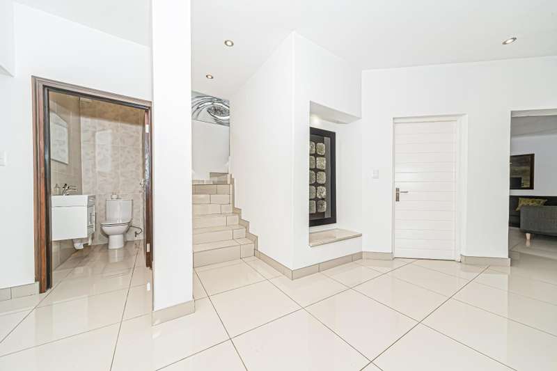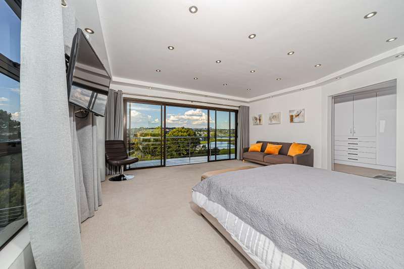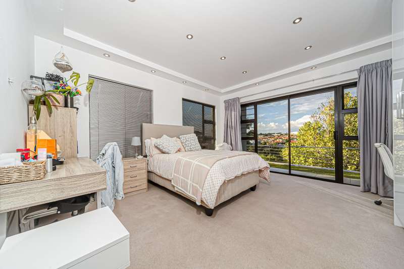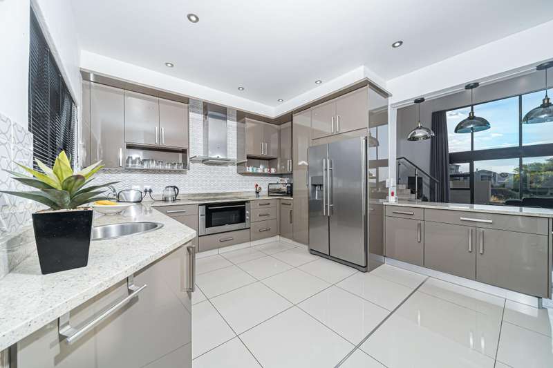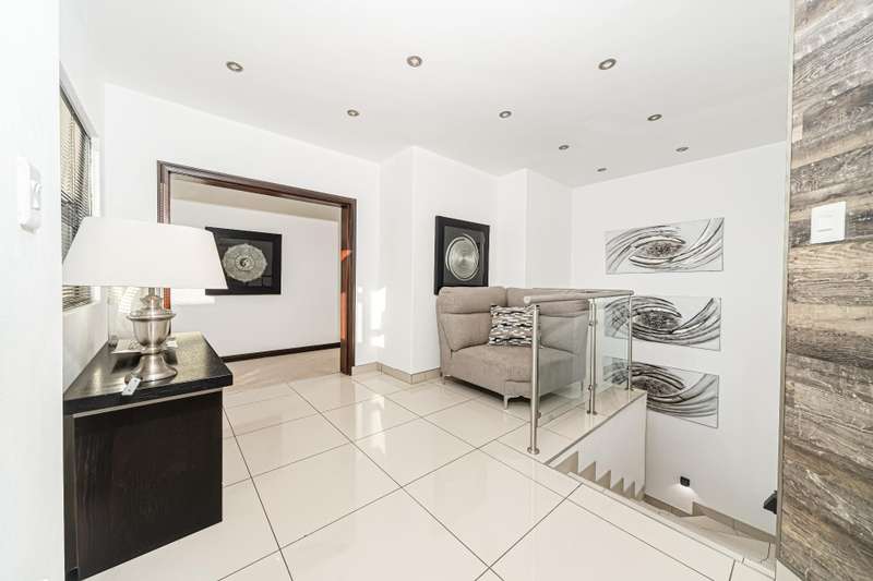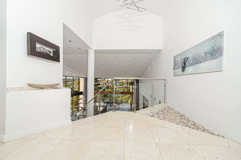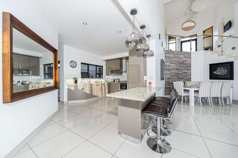 Positioned on the golf course, it offers spectacular views of the golf course and surrounding lakes. A magnificent home is set apart from the rest. This North facing home is situated in a quiet part of the Estate, next to a greenbelt area offering you tranquillity and privacy. There is a guest suite on the upper level. There is also a study on this level The double volume main living area include an open plan with lounge, dining room and gourmet kitchen that all open up with stacking doors. The lower level has a sunning entertainment area. A spacious lounge that opens onto a covered patio and pool area. There is a separate entertainment room with built-in bar. There are 4 enormous bedrooms all en-suite, and all have gorgeous views of the golf course and fishing dams. There are 3 garages with plenty of off road parking. Staff accommodation and a large area that could be used as second study or extra bedroom.