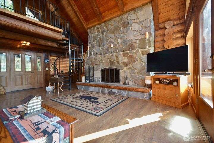 Life in your own lodge. Of matchless construction & appearance this stunning 2,498sf Swedish-cut log home sits on 4.6 private acres. Dramatic 17ft high shiplap ceilings, solid beams & a fabulous stone fireplace. Beautiful chef's kitchen w/island & large dining area - perfect for entertaining. The beautiful main bedroom boasts a fireplace & ensuite bath - 2 other bedrooms share 2 additional bathrooms. So much more: concrete roof, suspended loft, walk in pantries, storage rms, new heat pump, new well pump, large outbuilding, huge carport, gazebo, etc. Close to amenities & JBLM. Call for Special Features list & be impressed!
