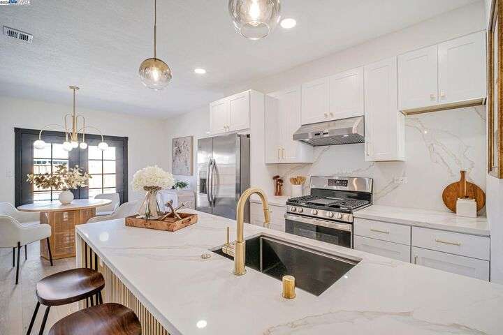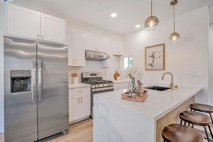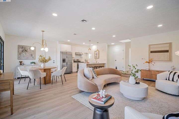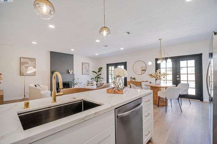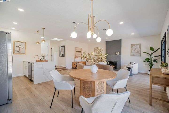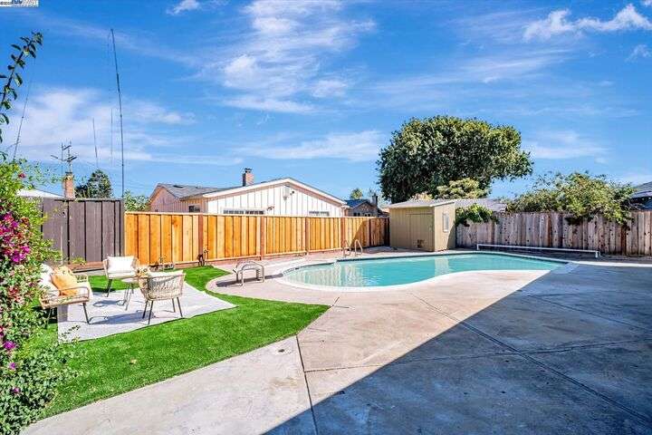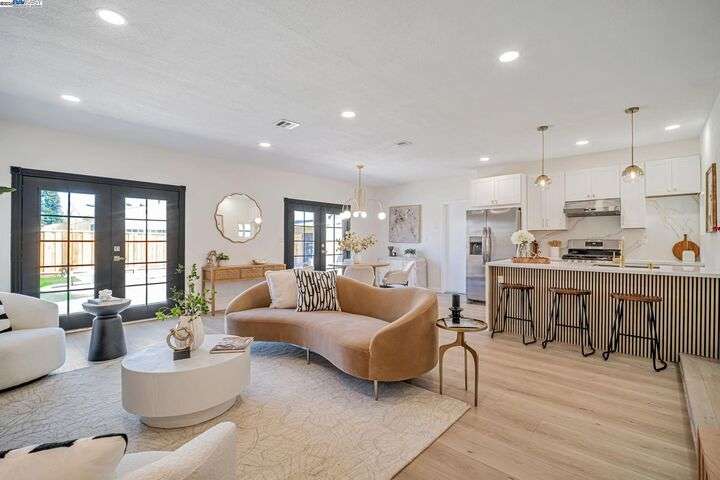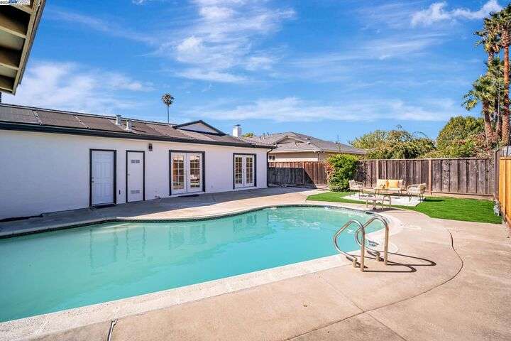 Welcome to this beautifully remodeled home in the City of Newark. This 3-bedroom, 2-bath residence has been fully updated, offering modern style, comfort, and functionality. The open floor plan with fresh interior and exterior paint, creating a bright and inviting atmosphere. New recessed lighting enhances the space with modern illumination. Durable SPC flooring offers both style and functionality. Two beautiful French doors open to the swimming pool, providing easy access and a seamless indoor-outdoor connection.The designer kitchen is equipped with brand-new stainless-steel appliances, quartz countertops, and a waterfall island, ideal for both cooking and entertaining. Both bathrooms have been tastefully renovated with new vanities, modern fixtures, and designer tile finishes. The exterior offers a newly landscaped yard, a new concrete driveway, and a swimming pool with refreshed landscaping. Conveniently located near Costco, 99 Ranch Market, Safeway, NewPark Mall, local restaurants, and parks, with easy access to Highways 880 and 84, this property also provides a short commute to major tech employers such as Meta, Google, and Apple. This turn-key home is truly a must-see.