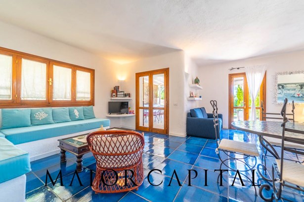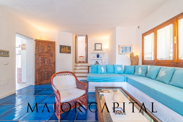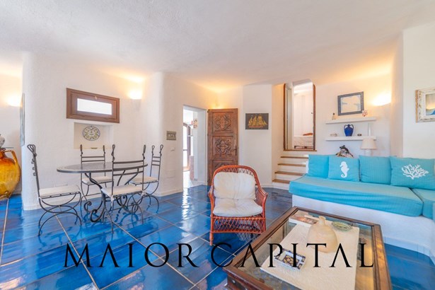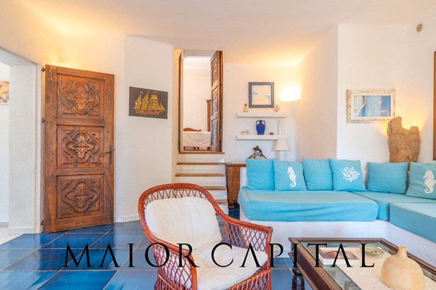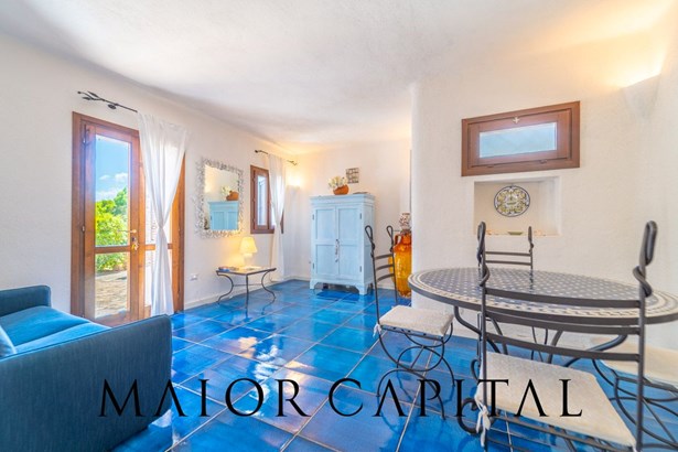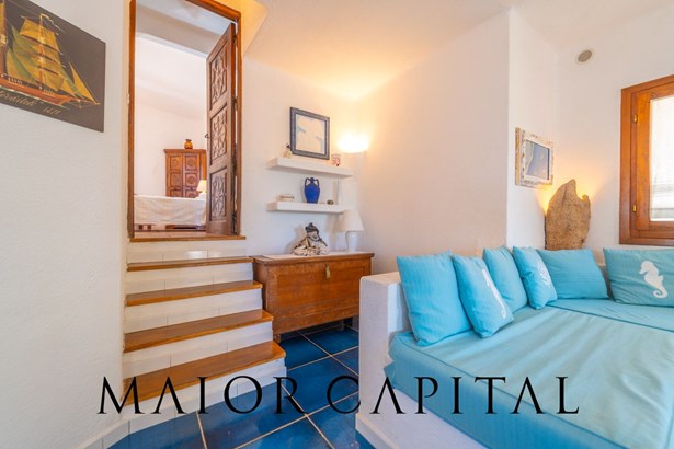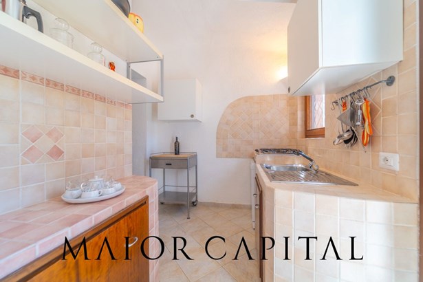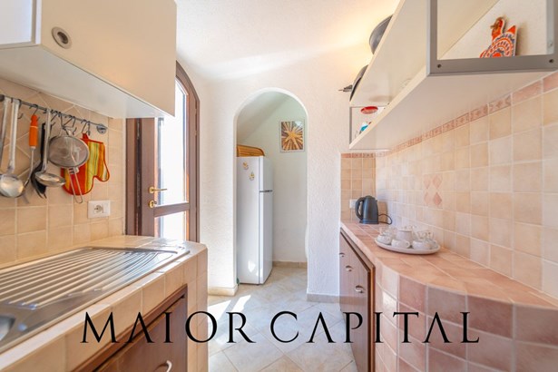 In the main building, the living room welcomes with warmth and brightness: the light-coloured walls and the blue-glazed Cera Sarda floor blend in a harmony that recalls the reflections of the sea. The kitchen, reserved and functional, is tiled with handcrafted tiles in earthy colours and has a masonry top. A graceful arched opening leads to a small space to be used as a pantry or small service area.