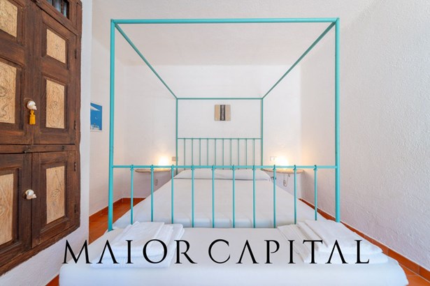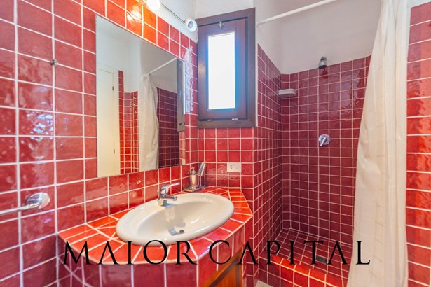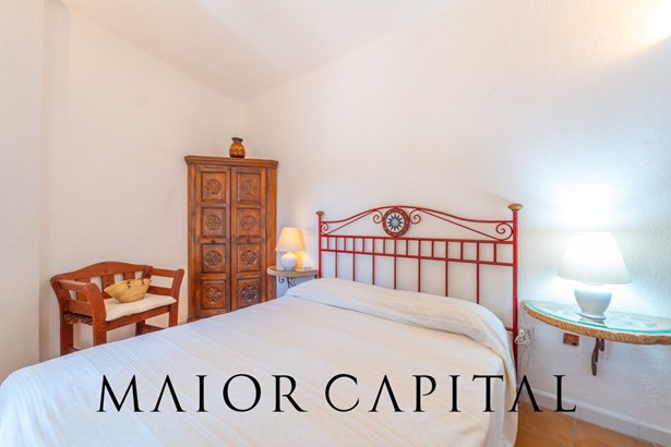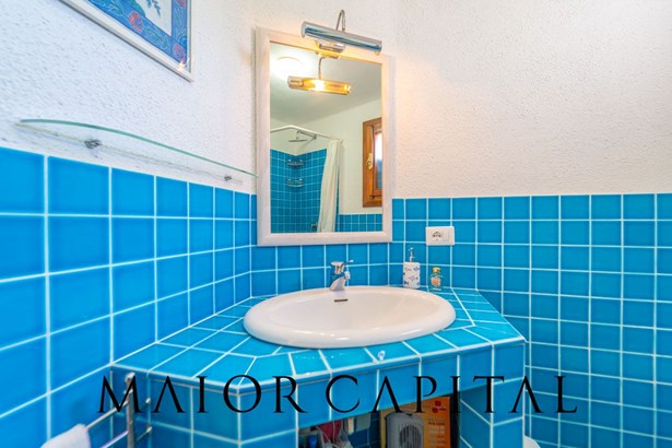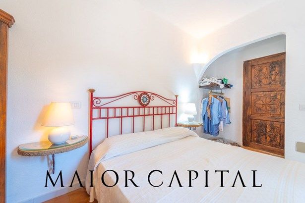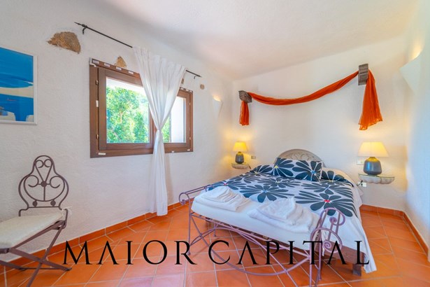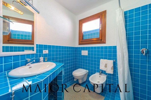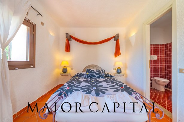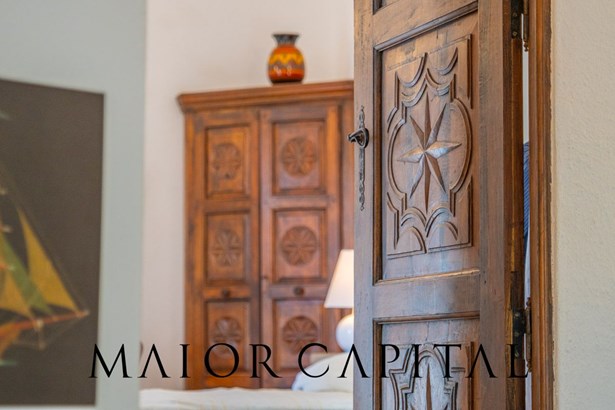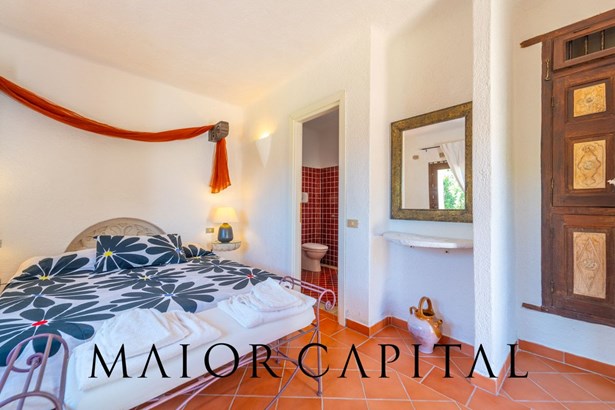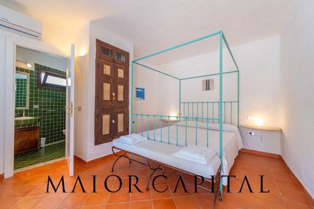 The master bedroom is a small masterpiece of local art: custom-made furniture made by Sardinian master craftsmen, carved wooden headboards, hand-crafted fixtures and details that create an intimate and authentic atmosphere. A bathroom in shades of blue completes the ambience, with refined finishes and a shower cubicle.