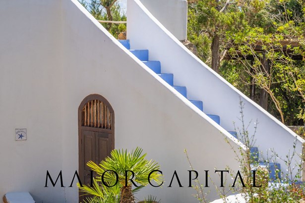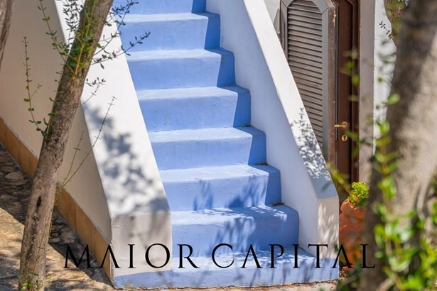A local stone walkway leads to the second unit of the villa, completely independent, where the sleeping area is developed, consisting of three elegant bedrooms, each with en suite bathroom. This environment, a natural extension of the main building, is designed to offer high-level hospitality, with true private suites, refined and equipped with every comfort. Finally, a staircase in shades of the sea leads to two panoramic terraces.
