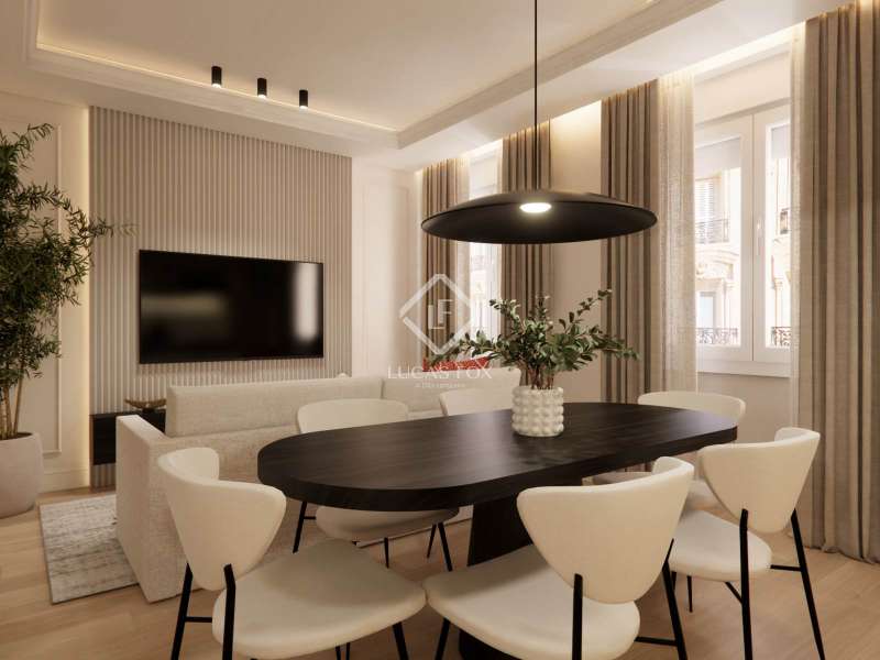 Lucas Fox presents this bright and elegant apartment on the third floor of a stately building with an elevator. It is located in one of the most sought-after areas of the Salamanca district, known for its classic architecture, exclusivity, and urban lifestyle. The property, with 101 m² of cadastral land, has been completely renovated with a modern and functional design that combines style and comfort. Every detail has been carefully considered to create a sophisticated property with high-quality finishes and a welcoming atmosphere. The interior layout has been optimized to offer spaciousness and comfort. It features three bedrooms, two of them with private bathroom, all with excellent natural light and built-in wardrobes. There is also a third bathroom. The day area consists of a bright living-dining room with access to an exterior balcony and a fully equipped modern kitchen with integrated appliances . The apartment comes fully furnished with designer furniture and equipped with air conditioning, individual heating, and high-efficiency woodwork, making it an ideal option for both immediate move-in and investment. Thanks to its strategic location, the property enjoys tranquility while still being close to all the amenities and connections of Madrid.