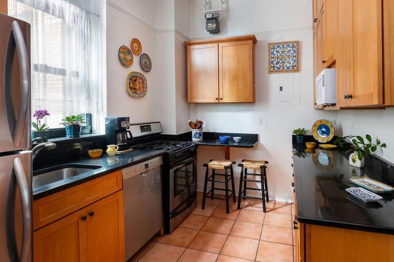 The apartment has been lovingly maintained with tasteful updates, including new windows throughout. It retains many extraordinary prewar details. The 22 x18 LR has elaborate plasterwork moldings including a ceiling medallion, original oak parquet floors with varying beautiful marquetry, and a decorative fireplace. The 12x 18 dining room gets superb eastern light (and can easily serve as a fourth bedroom). The large 19x 16 primary corner bedroom is sun flooded with two exposure open city views, and a spacious renovated bathroom with open east views. The second bedroom also has two exposures and gets terrific light. There is a central bathroom which has the original decorative tiles, deep cast iron tub, pedestal sink and an impressive separate multi-head shower stall with the original chromed cage water pipes enclosure and porcelain floor. These are museum caliber remnants! There is a large maid's room which has been used as office and third bedroom with its sleeping loft. The original maid's half bathroom hous es a washer/dryer, but can be restored if so desired. Lastly, the kitchen has been updated with new cabinets and granite counters.
