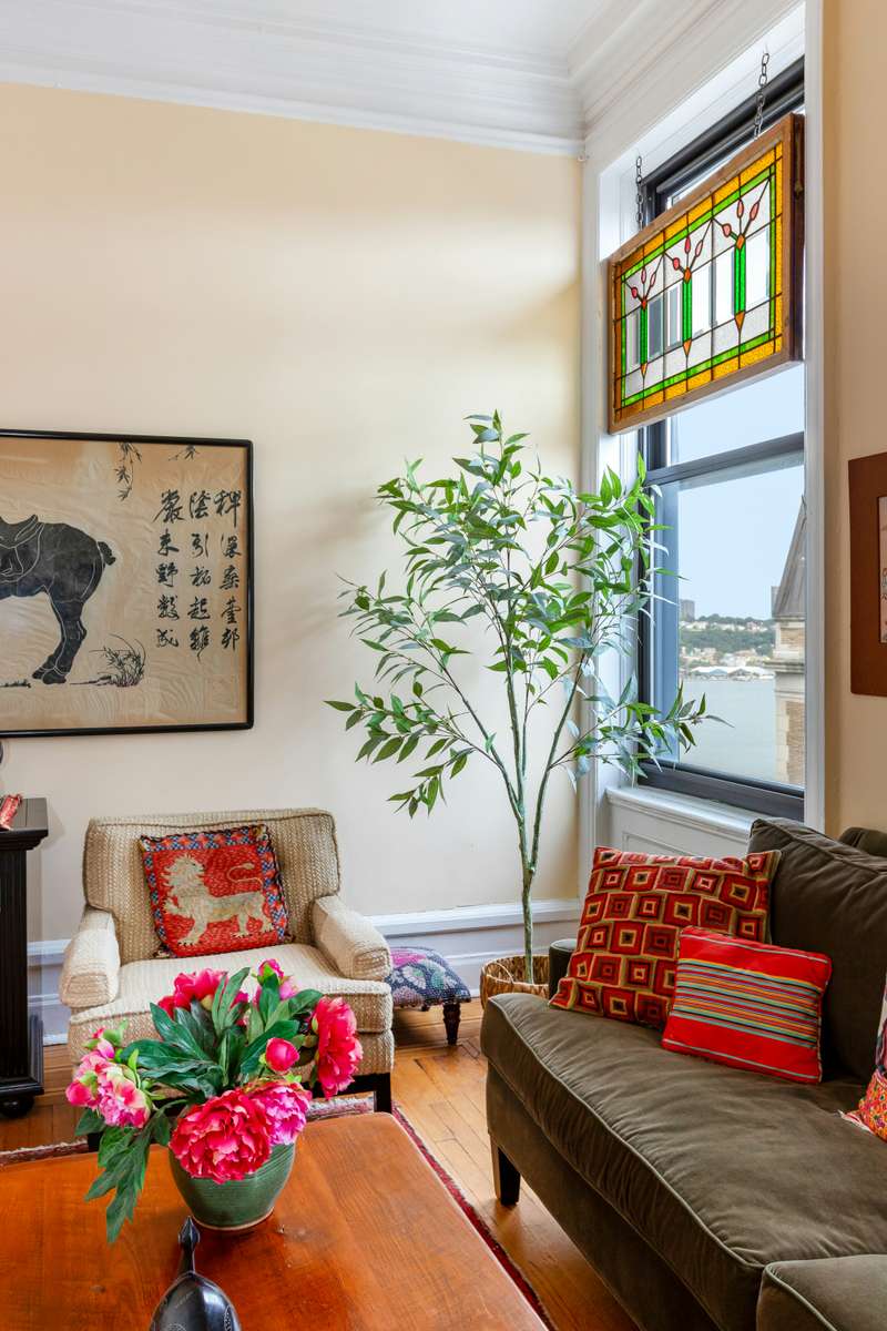 You know you are in a special home as soon as you walk in. The gracious hallway off the entry foyer is filled with light. Upon entering, you are struck by the space, scale, original detail and elegant proportions of light-filled rooms with soaring ceilings and beautiful partial river and open city views.
