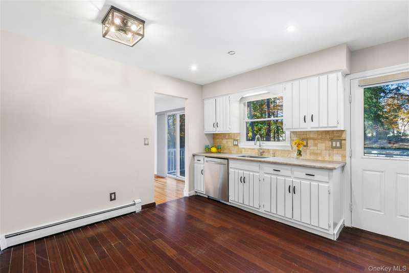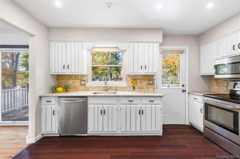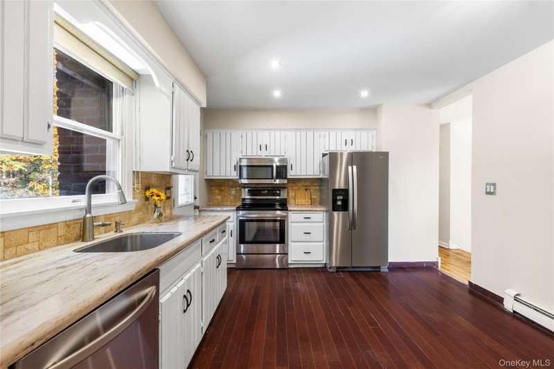 Welcome to this inviting raised ranch in the heart of Yorktown Heights! The main living area features beautiful hardwood floors and a cozy wood-burning fireplace that sits between the living and dining rooms perfect for relaxing or gathering with family and friends. The kitchen has been nicely updated with stainless steel appliances, granite countertops, and direct access to the deck for easy outdoor dining or morning coffee. Sliders from the dining room also open to the deck, creating a great flow for indoor-outdoor living. Upstairs, you ll find three comfortable bedrooms, all with generous closet space, along with a full hall bath. The lower level includes a large recreation room that can be used as a family room, home office, gym, or play area, plus a bonus room to be used as a fourth bedroom or office, and another full bath ideal for guests or extended family. The expanded laundry room and direct access to the backyard and attached garage add extra convenience. The level backyard o