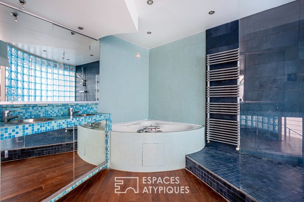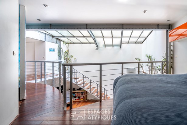 The large entrance opens onto a space bathed in light. This level accommodates a first bedroom, offering calm and privacy. The parquet flooring, in warm tones, extends to the mezzanine and its second open bedroom which overlooks the living space. The bathroom, equipped with a corner bathtub, stands out thanks to its glass tile wall which brings a unique and luminous touch to this space. A separate toilet completes this level. On the lower floor, the 50 sqm living room is organized into several spaces such as the living room, the dining room and the open kitchen. This ensemble, topped with a glass roof, the true soul of the loft, benefits from beautiful light and generous volumes. The harmonious blend of steel, glass and wood creates a perfect balance between modernity and comfort. A third bedroom, a shower room with WC and a laundry room complete this level.