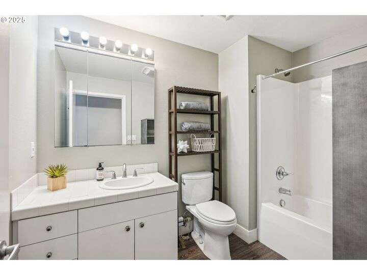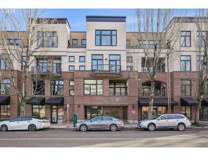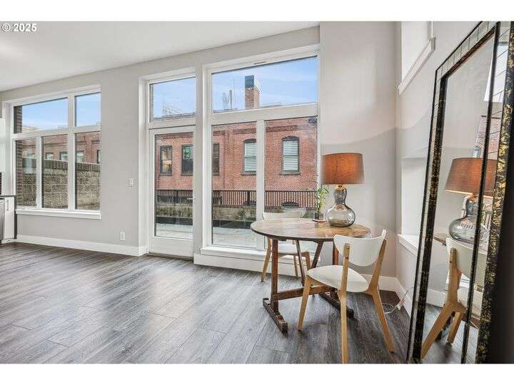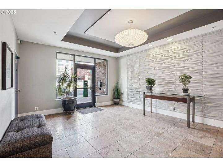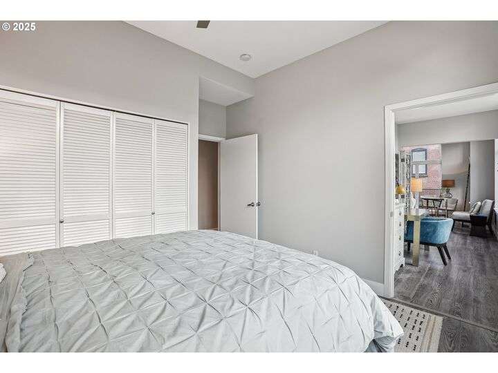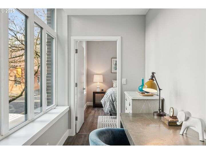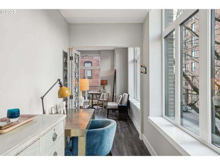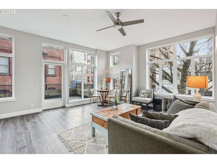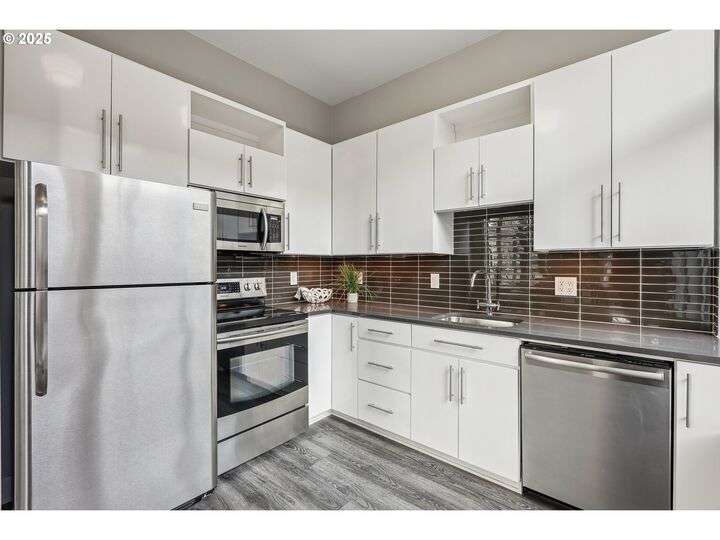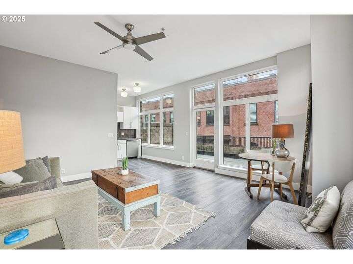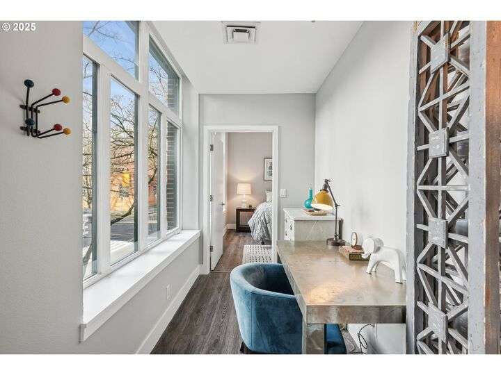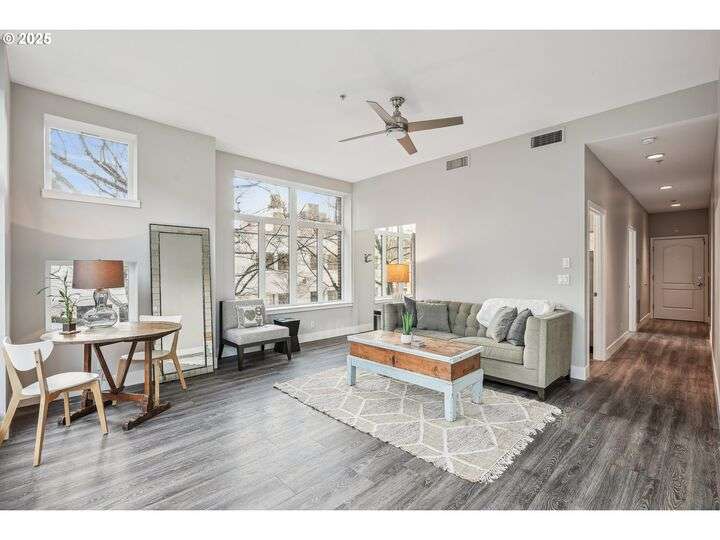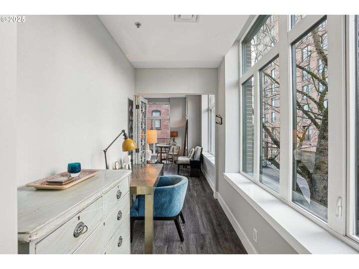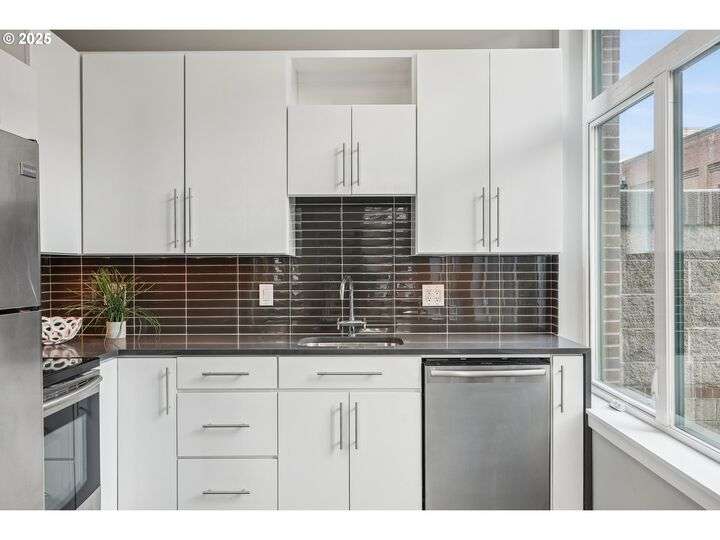 Light, bright corner with high ceilings and large windows along the east and south walls, sunny office or den area separating the living room and bedroom, and a huge deck ready to be made into your own private paradise. New heating and air-conditioning installed in 2025, fresh paint and recently updated kitchen with new stainless steel appliances, quartz counters, and full-height tile backsplash. Enjoy the benefits of recent building improvements completed in 2022, including new siding, windows, doors, deck surface & railings! Includes a garage parking space & storage cubby.