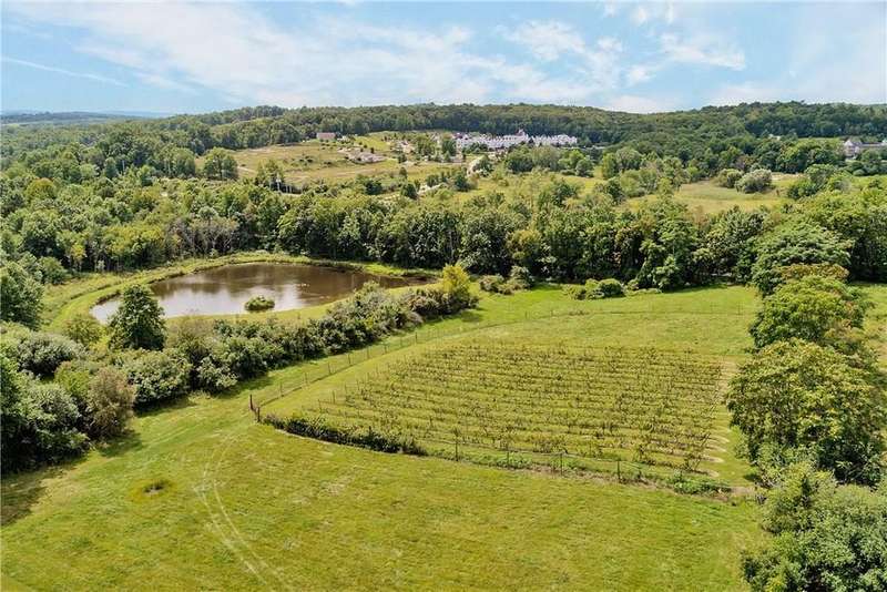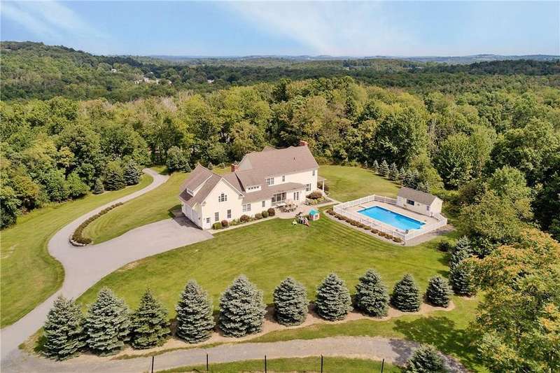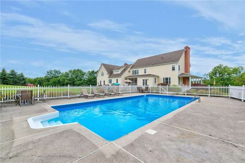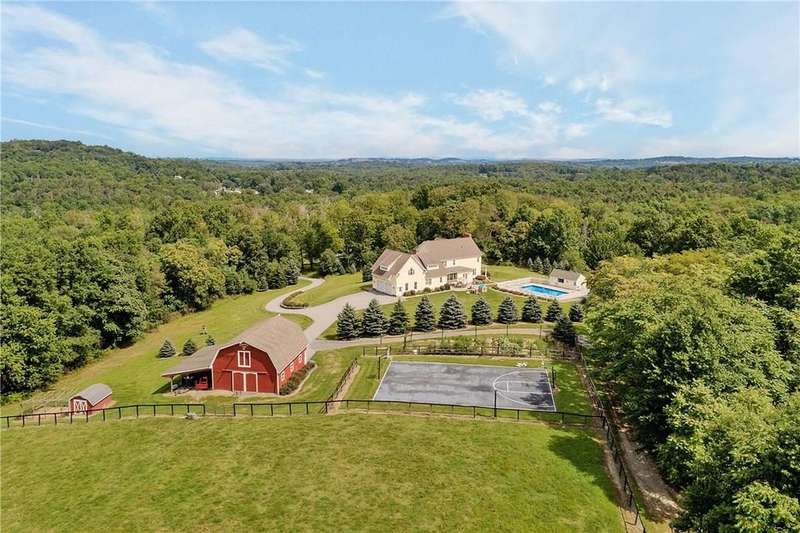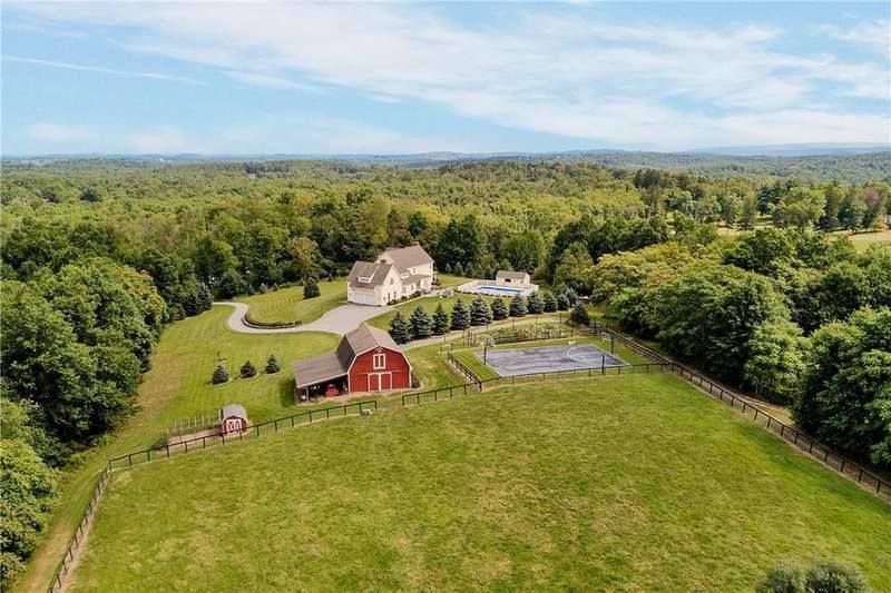Rare Treasure! Incomparable, private, extraordinary, 46+ acre mini estate. 14 room, 6 bedroom, 3 bath colonial with panoramic vistas, 2 stocked ponds, 5 stall barn with water and electric, guest cottage with a professional kitchen, paddocks, run in sheds, wine cellar, in ground salt water pool & cabana with lav., basketball & pickleball, trails, fields, nature, trees, wildlife and much more. Just minutes to historic Village of Goshen, Route 17, & access to Heritage hiking & running trail. Your own private paradise to experience the beauty of nature, farm, ride horses or a possible subdivision with municipal water, sewer & gas now available at beginning of driveway. Great for destination weddings, events, catering, and bed and breakfast. Quality craftsmanship abounds in this manor with formal moldings, hardwood floors, 3 brick fireplaces & chef's designer kitchen, in-law quarters & much more. Close to major shopping, Route 17, Legoland, historic Village of Goshen amenities in one of the county's hottest locations. One of a kind property that uplifts your spirits and has endless possibilities.
