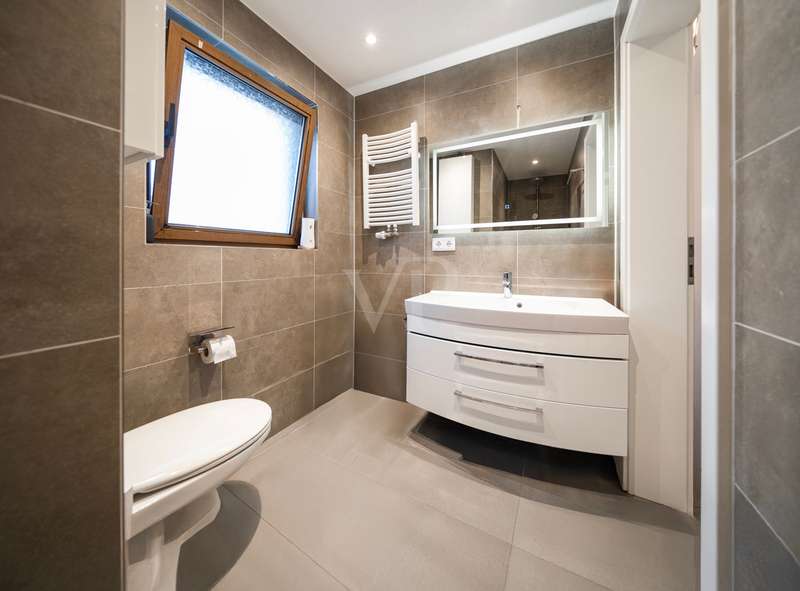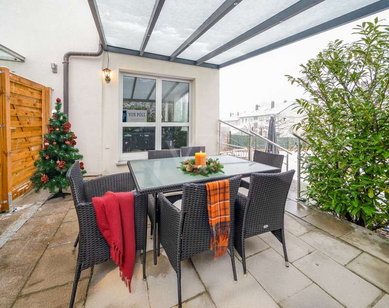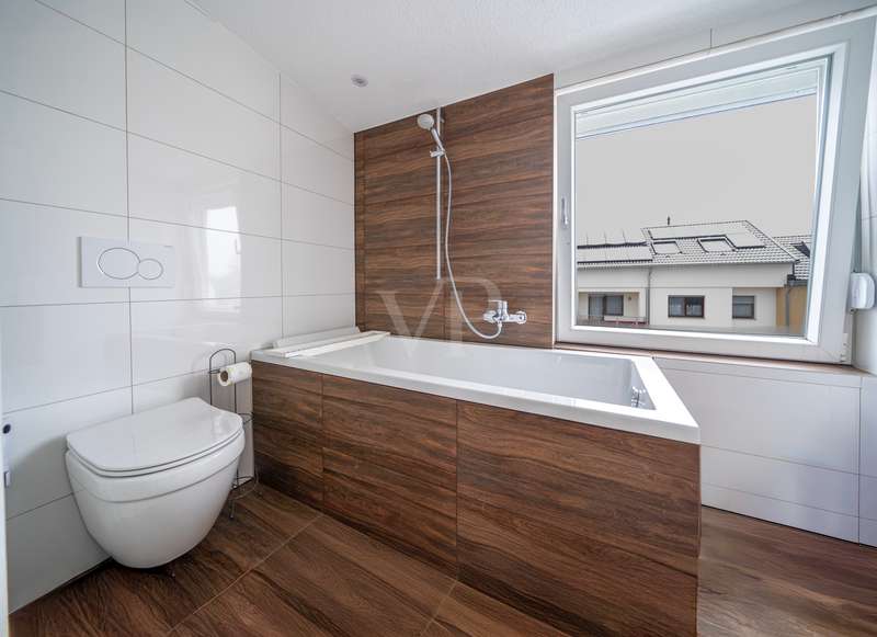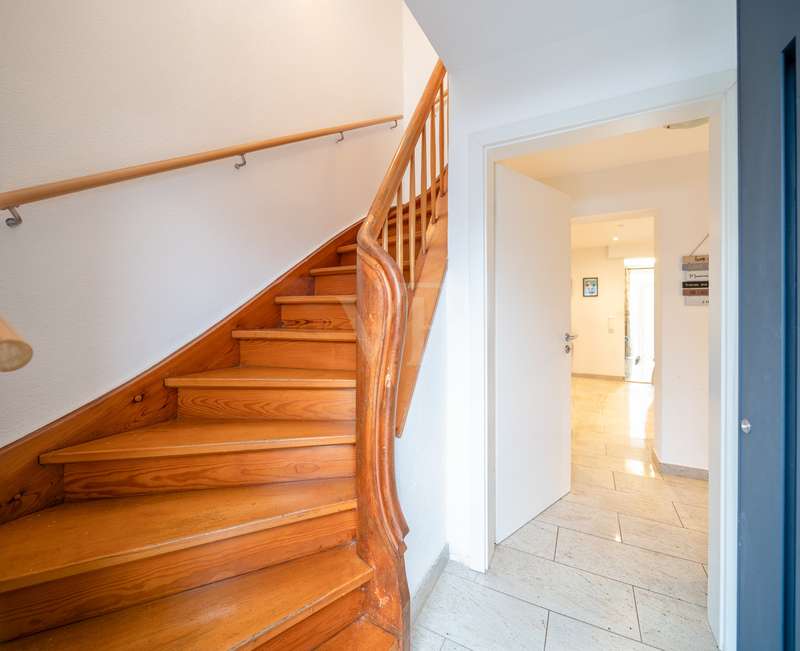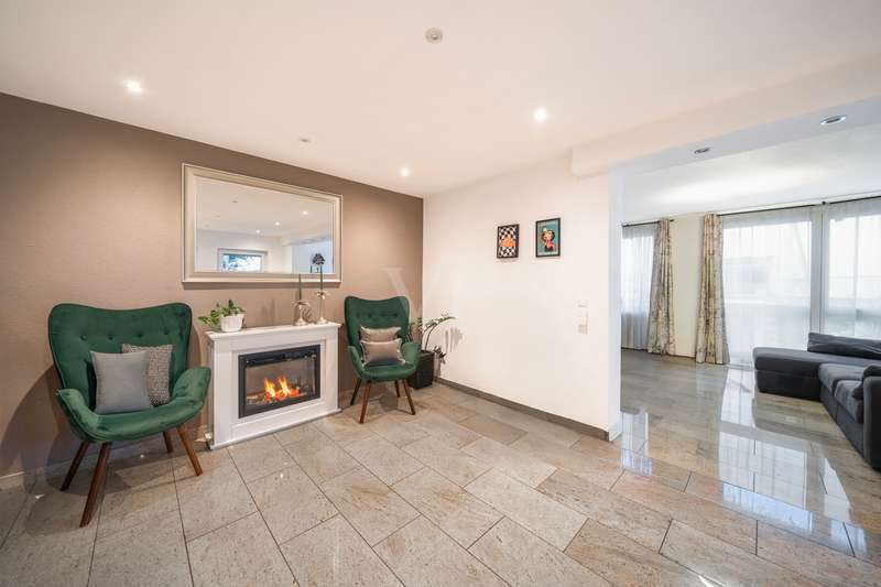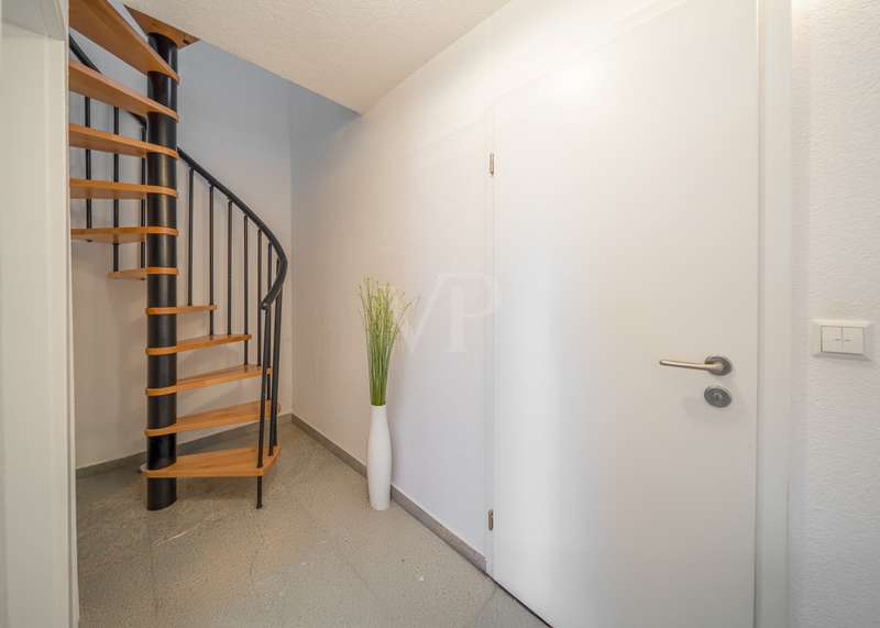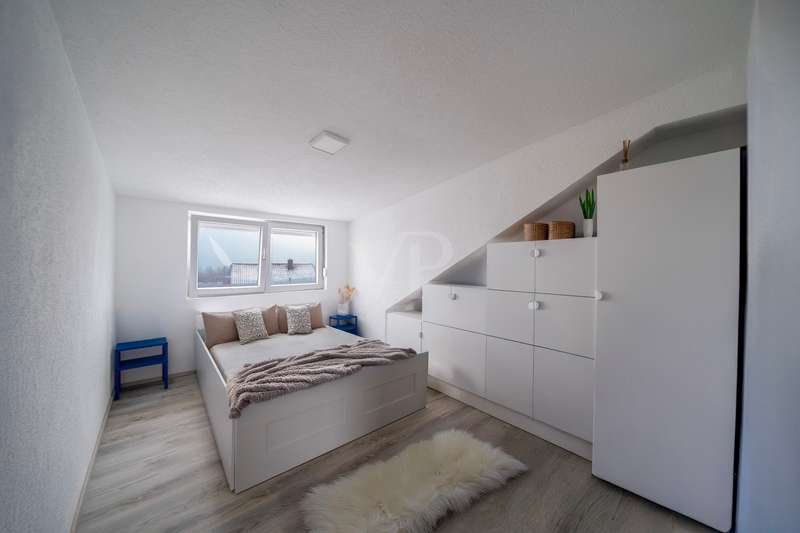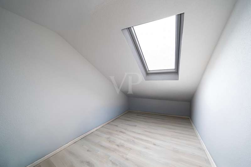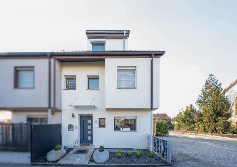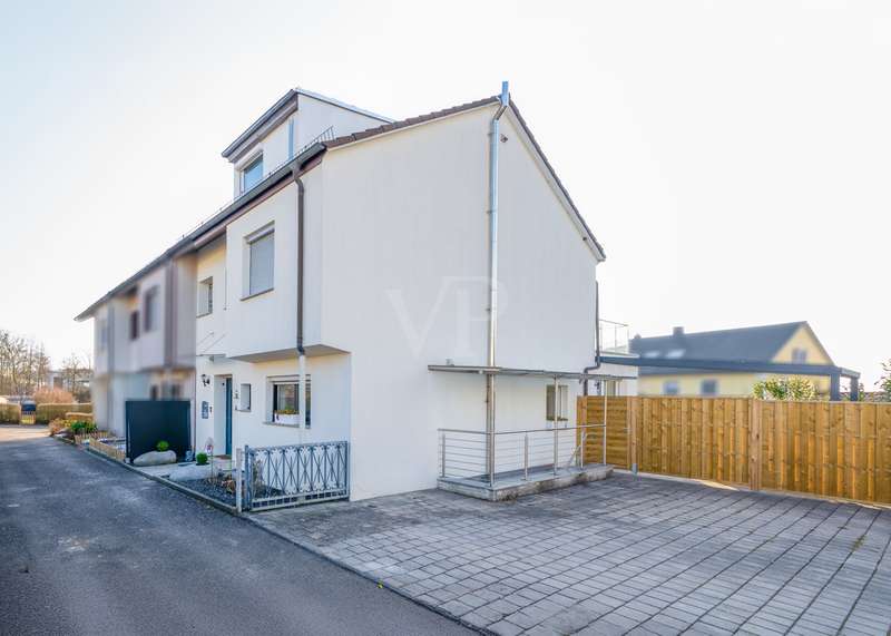 End terraced house with large garden and granny apartment This end terraced house offers many possibilities for large families and would also be suitable as a multi-generational home, as there is a granny apartment in the basement with a separate entrance from the side of the house. On the first floor you will find a large living room with adjoining open dining area, the kitchen, the guest WC and a small storage room. From the living room you can access the terrace, which is surrounded by a large garden with plenty of space for your children. In front of it you will find the four parking spaces in addition to the garage. Next you reach the upper floor with the master bedroom, two extra children's or guest bedrooms and a daylight bathroom with shower. The top floor was converted in 2022 and offers two further bedrooms with en-suite bathrooms. In the basement you will find the granny apartment with underfloor heating, which you enter through a separate entrance, with a living room, additional bedroom and a separate kitchen and bathroom. The windows allow plenty of light into the apartment. The furnishings of the house are as good as new due to the core renovation in 2011, during which a solar system for hot water was installed. Granite tiles with underfloor heating were laid on the first floor and the two apartments are each equipped with a fitted kitchen.