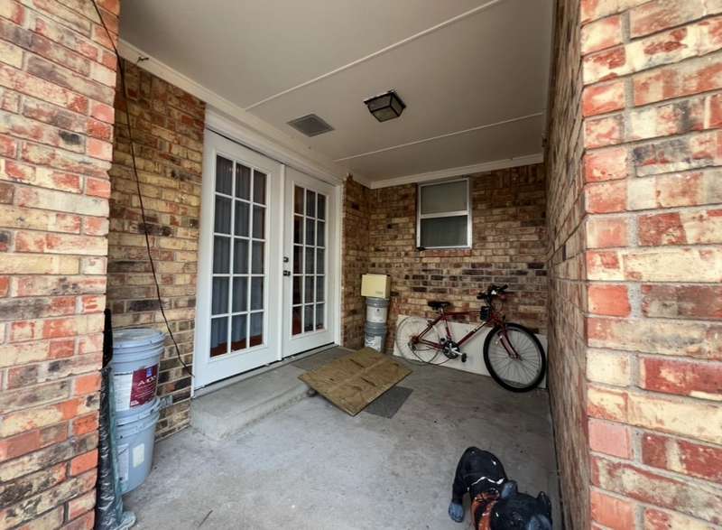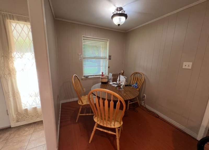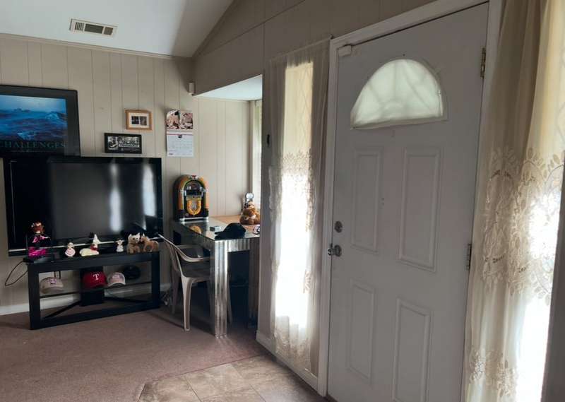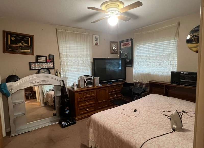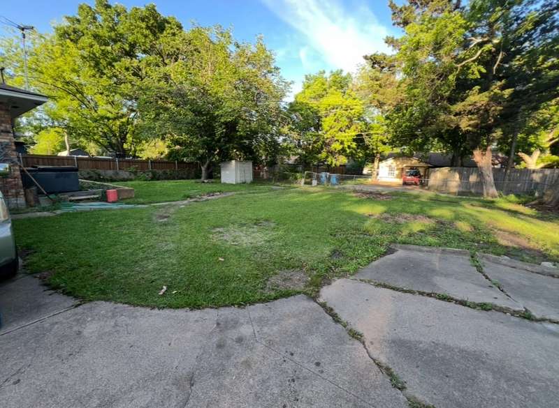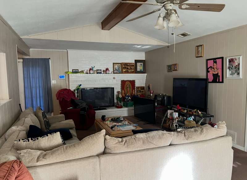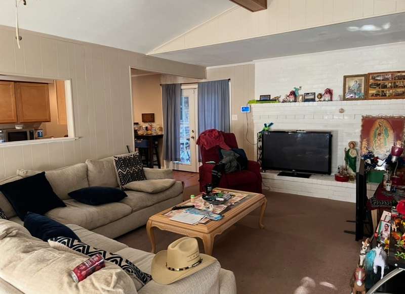 INVESTORS & HANDY PEOPLE: Spacious living area featuring vaulted ceilings, wood beam across, built-in desk and woodburning fireplace. Galley kitchen features a serving window into living area and includes stainless-steel gas stove, built-in microwave oven and dishwasher. Split bedroom layout. Primary bedroom has a walk-in closet, separate vanity area, linen closet, and ensuite ADA-friendly primary bathroom. Secondary bedroom comes with 2 closets. From the living area open the double French doors and step into a covered patio leading to your huge back yard.Laundry room has space for full-size washer & dryer and includes utility sink. Storage shed in back yard. You'll find plenty of parking for your cars and toys with the long driveway curving into the 2-car garage. Gorgeous curb appeal with mature trees and beautiful flower beds in front and side. Enjoy your morning coffee or tea in your front porch.The roof and foundation will need repair. Sold as-is. No repairs by sellers. No blind offers.