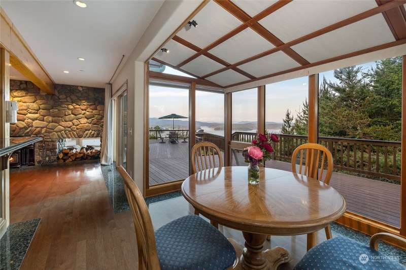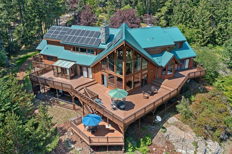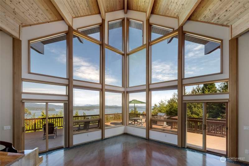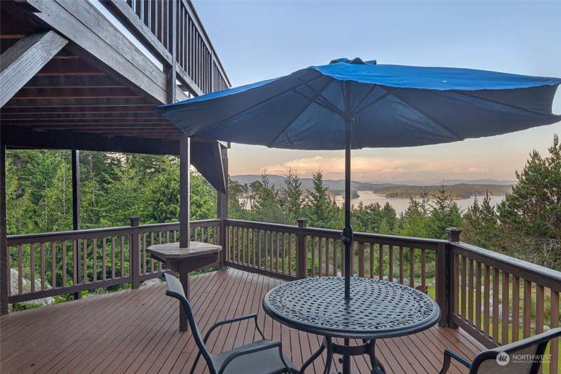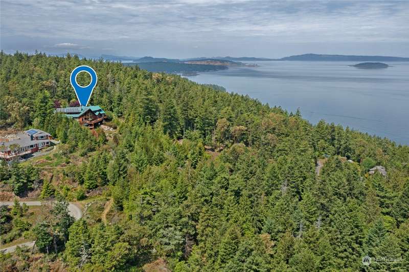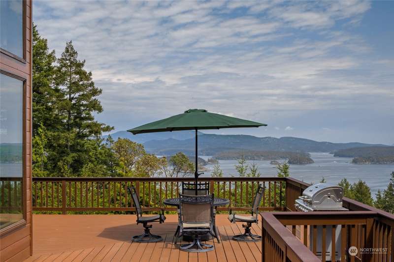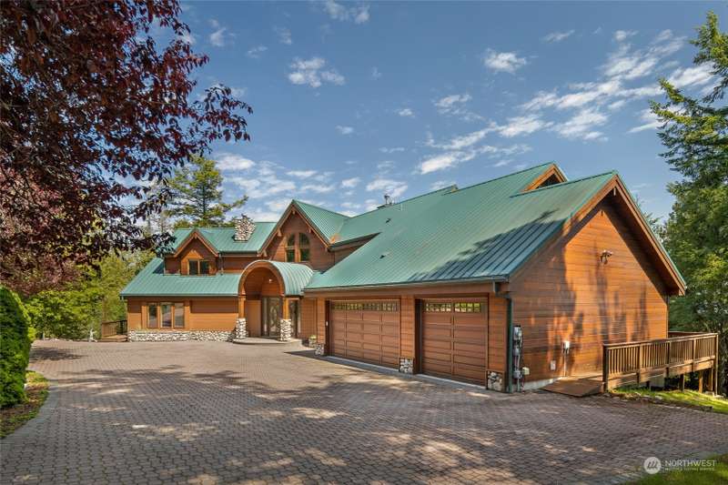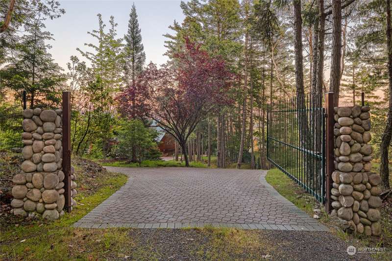 Experience a remarkable Northwest contemporary home with stunning views across the San Juan Channel to multiple islands...channels and bays...as well as Mt. Baker, and much of the Cascade Range. This 3975sf property boasts a grand foyer...stately office...living room with a 16ft vertical island fieldstone fireplace...dining area...and a gourmet kitchen. Two primary bedrooms...one on each level, offer privacy and comfort. Enjoy additional features like a large theater...sauna...metal roof...solar...water catchment...and ample dry storage beneath the home. This 4.48-acre property...with its gated entry...a bricked circular driveway...walking trails...enclosed garden...is truly a 'must-see' gem. Listed for $600K below assessed value.