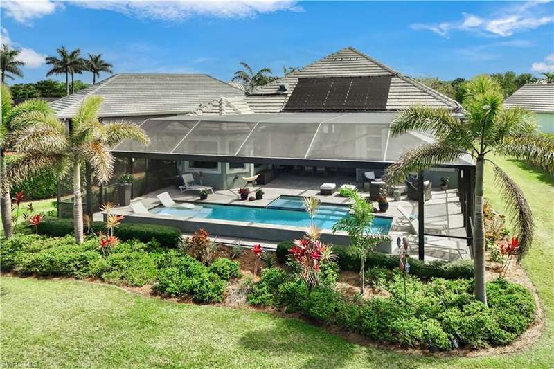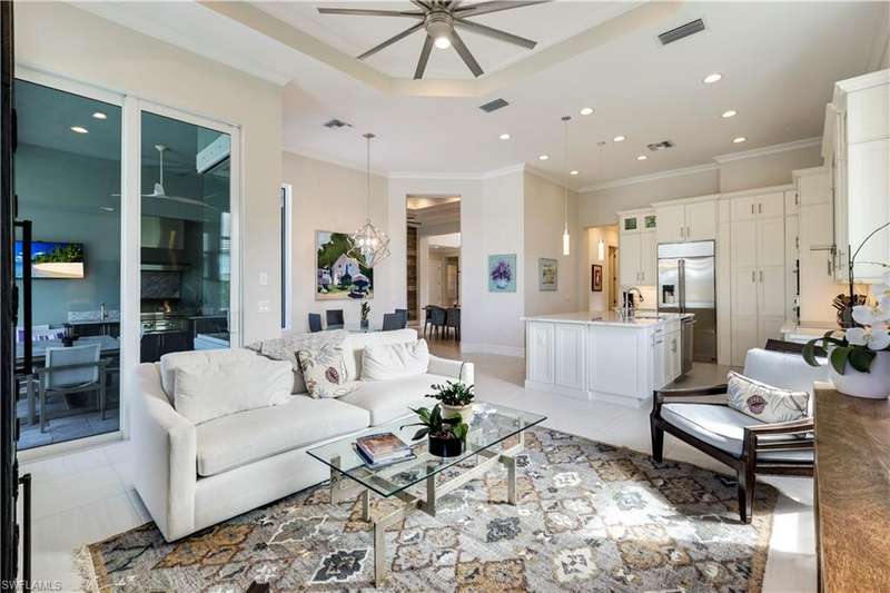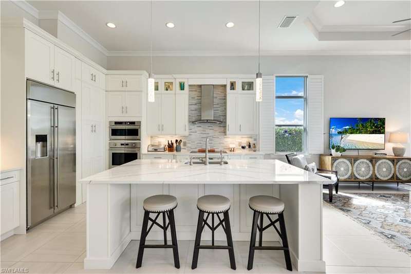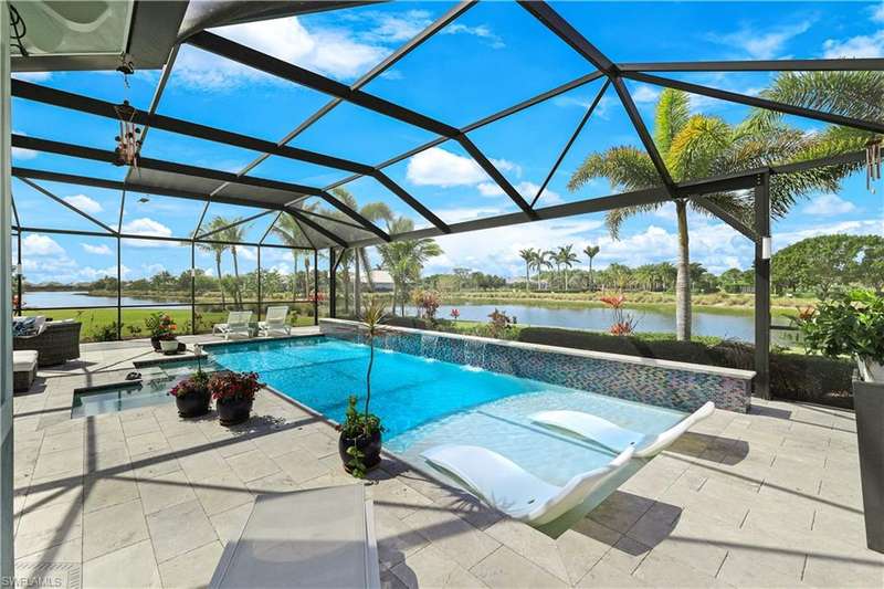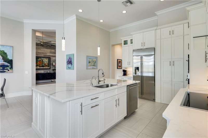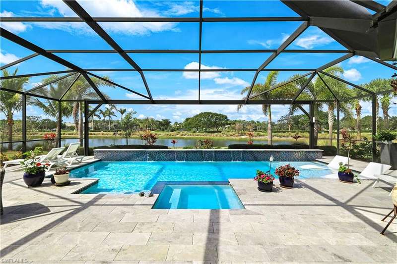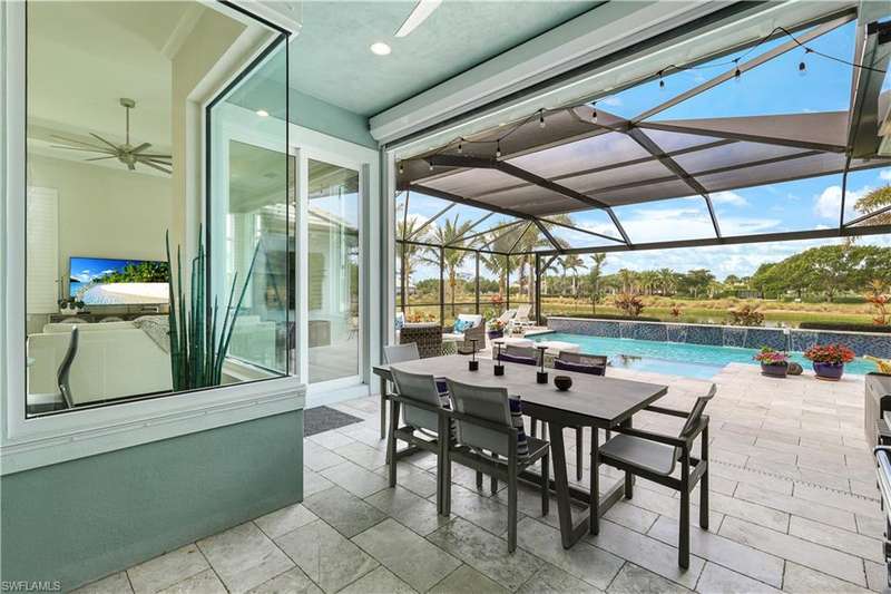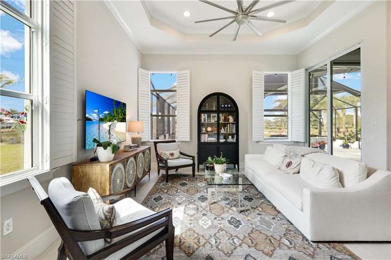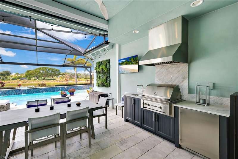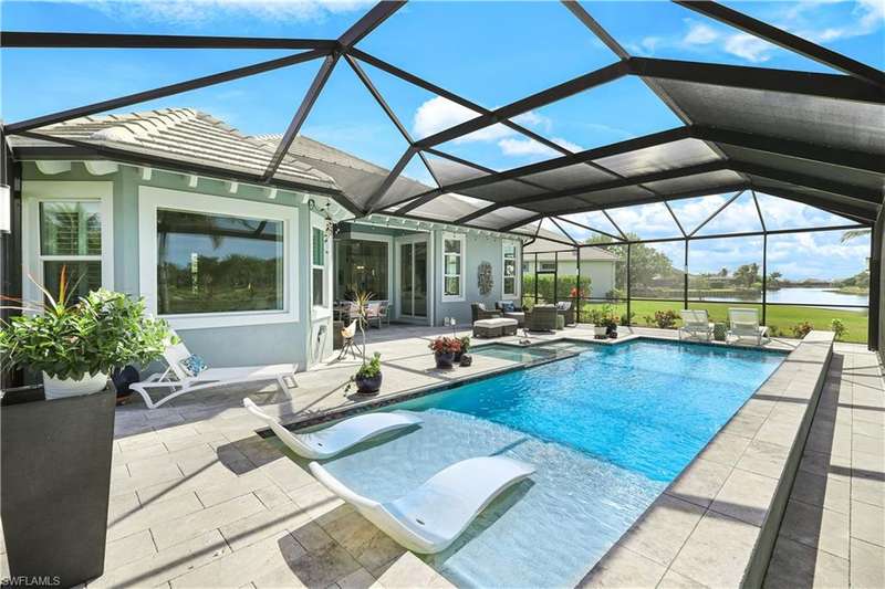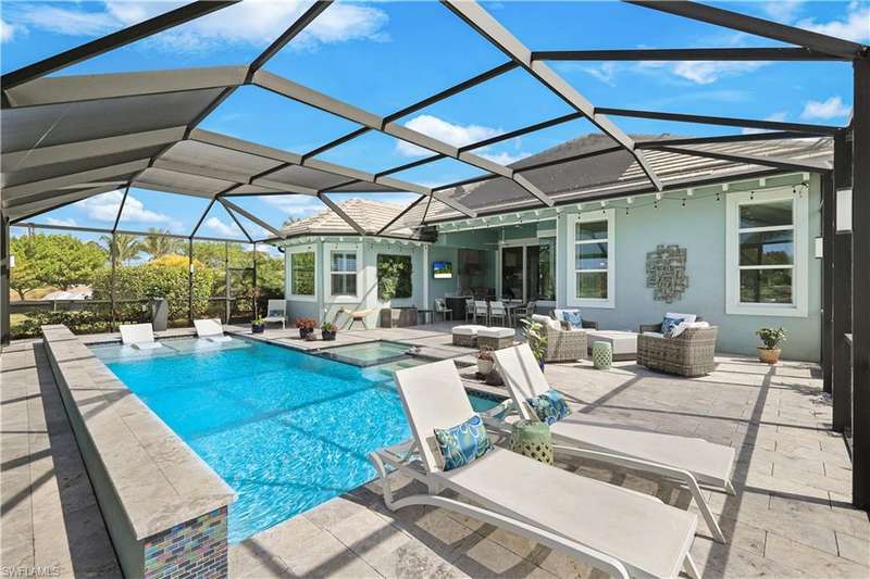 Welcome to your dream home, the Jacaranda floor plan in the Isles of Collier Preserve, now reimagined with an open floor plan for modern living. This exquisite three-bedroom plus den residence boasts three en-suite bathrooms and one powder room, seamlessly blending contemporary style with unparalleled comfort. Step outside to your private outdoor screened-in oasis. The western-facing lanai is perfect for viewing exceptional sunsets. Looking south, you have a long unobstructed view of the waterway. The oasis is complete with an outdoor kitchen, pool, and spa ideal for relaxation and entertaining while enjoying breathtaking sunsets. Nestled on a private cul-de-sac with a pie-shaped lot spanning .37 acres, this home exudes elegance. The expansive open layout connects the living room, dining area, and gourmet kitchen, creating an inviting space filled with abundant natural light from large windows. The gourmet kitchen features state-of-the-art appliances, quartz countertops, and an overs