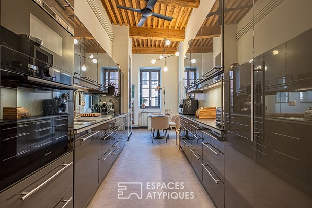 The fully equipped contemporary kitchen, laid out lengthwise with high-end materials, highlights the property's character.
