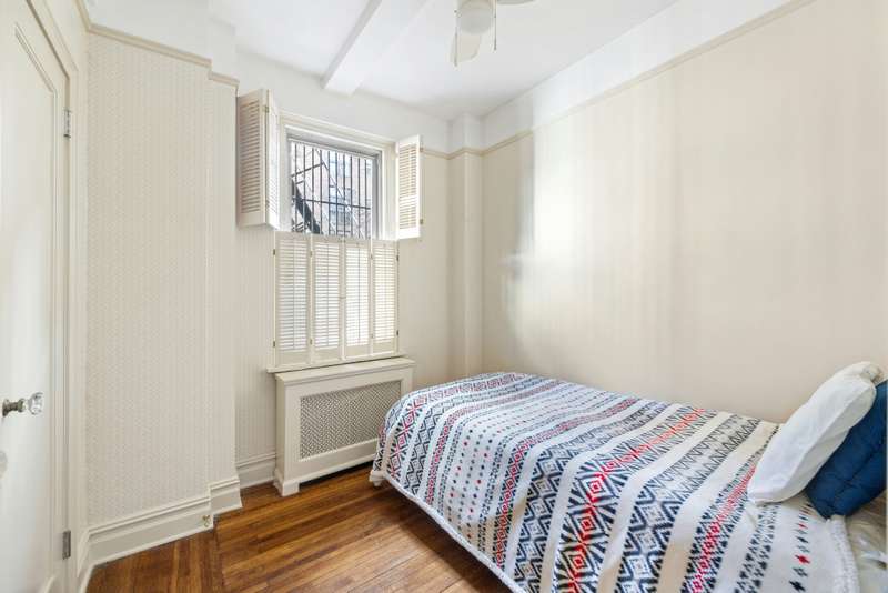 A gracious foyer opens to an oversized living room of almost 25ft and a primary bedroom of almost 20ft - both looking out west to the tree-lined West End Avenue. The dining room is a healthy 16ft, and the second bedroom is nearly as large as the primary bedroom. The large staff room has been used as a third bedroom. The renovated kitchen enjoys good southern light. True to form, the design and construction includes abundant closet space, hardwood floors, pre-war details and high ceilings in excess of 9ft.