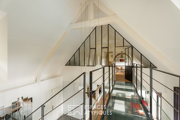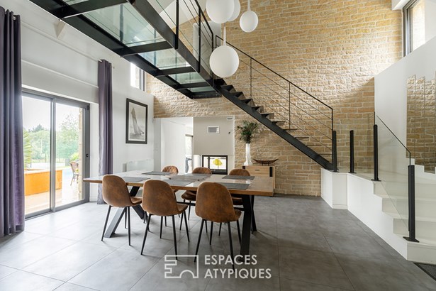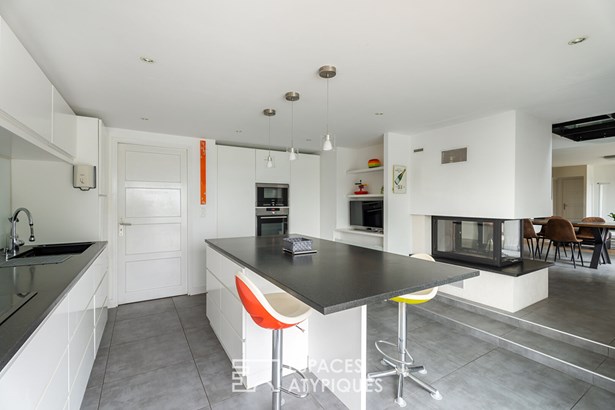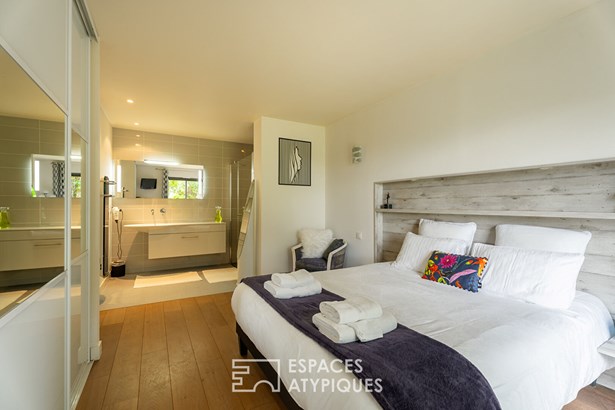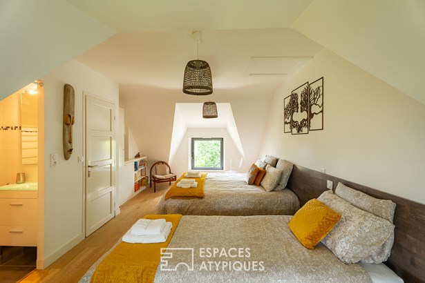 Crossing the threshold, the generous volumes are fully revealed. The living room, bathed in light, enchants with its high ceilings and contemporary ambiance. Natural materials harmoniously blend with bolder design elements, such as the metal staircase or the sculptural light fixtures. The kitchen, open to the outside, extends the inviting space. At night, several comfortable bedrooms are spread across two levels, including a suite nestled under the eaves, conducive to relaxation. Each room has been thoughtfully designed, combining functionality and aesthetics. A property where every detail tells a story.