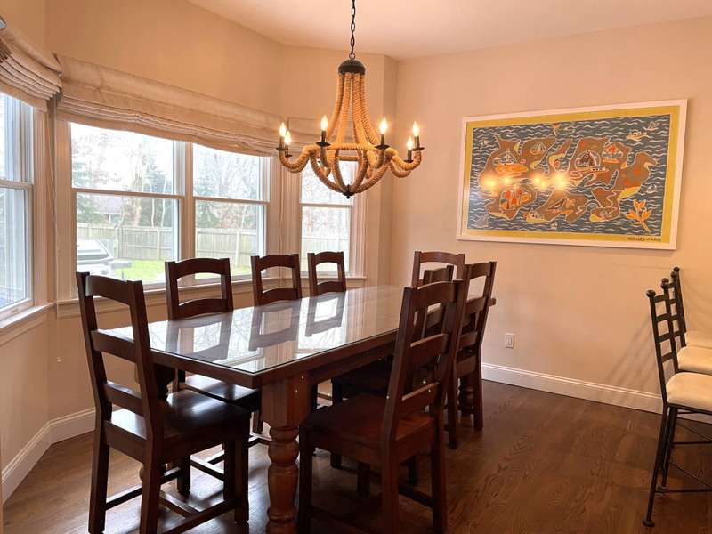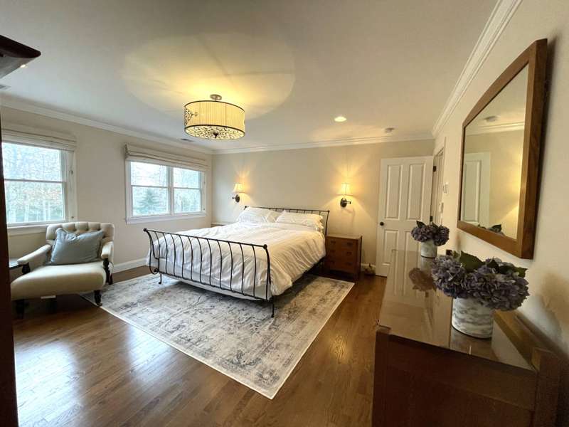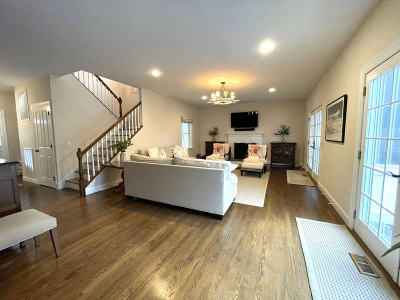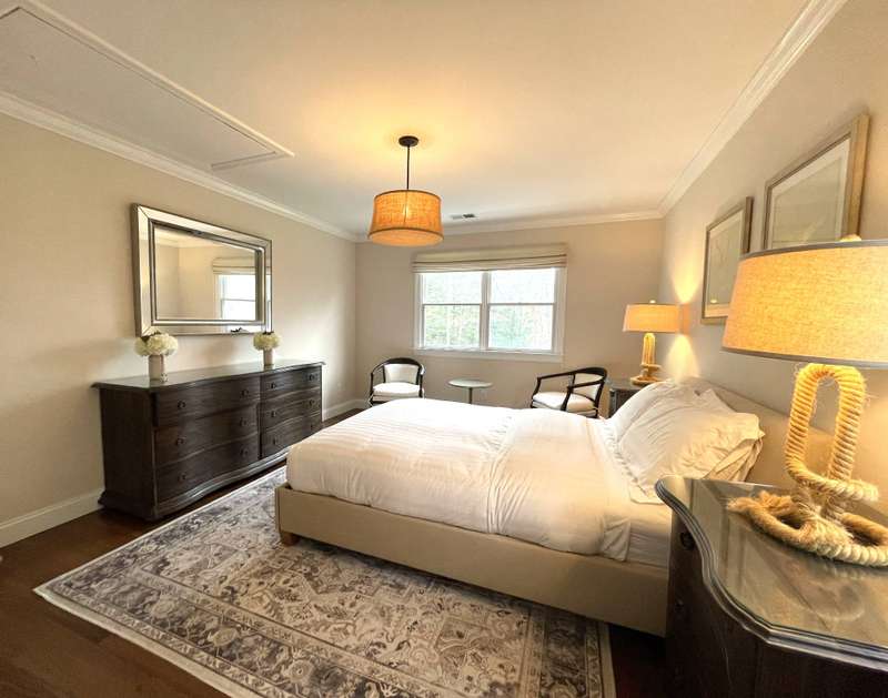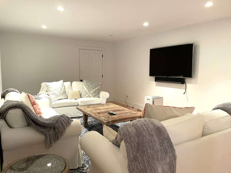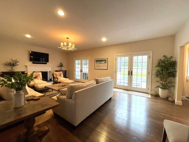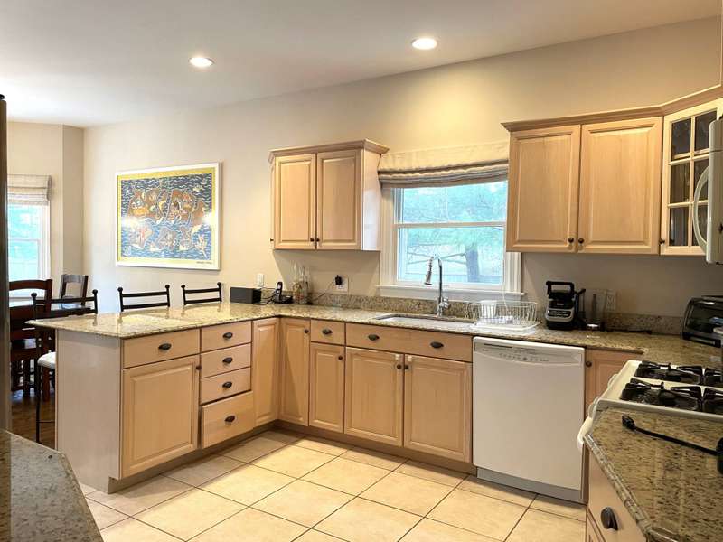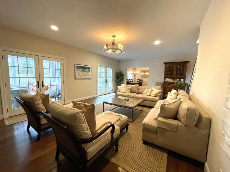 Rental Registration # 23-0,473 - Recently completed renovations provide enhanced brightness with the addition of a wall of French doors opening to the backyard and allowing sunlight to flood the communal living space. The newly completed screened-in porch is perfect for summer dinner parties and leads to the fenced-in heated pool and well-manicured lawn. This bright and well-maintained home offers three bedrooms on the 2nd floor (including primary and two guest rooms) and two and one-half baths, with a brand-new marble primary bathroom, complete with separate tub and sit-in shower. On the first floor there is also a den which could serve as a fourth bedroom with its pull-out couch, eat-in kitchen with granite counter tops and living room with all new furniture, a 55-inch flat screen TV and a fireplace. The recently finished lower level offers additional recreation space with a wet bar, a 60-inch TV and sofa-bed. This home also offers central air and is a 0.3-mile distance to Three Mile Harbor in the Northwest Woods.
