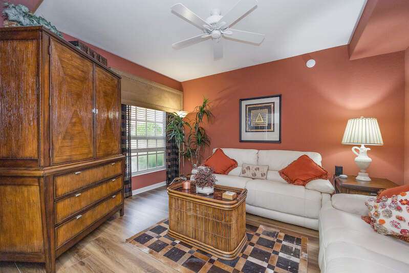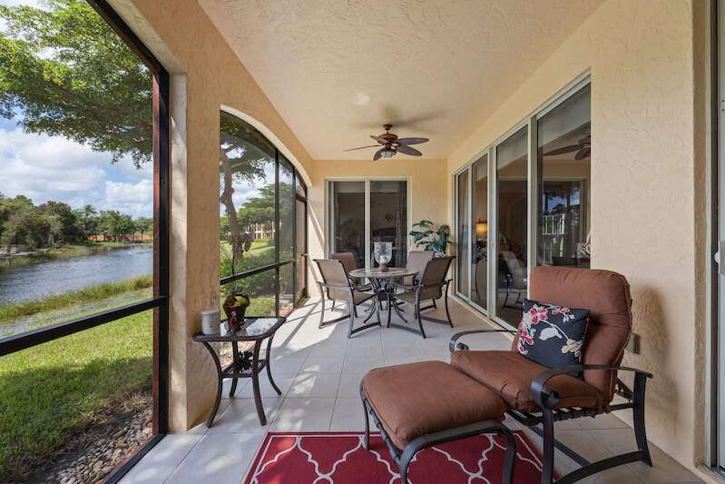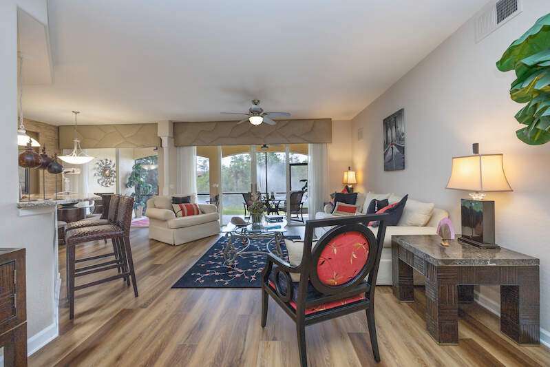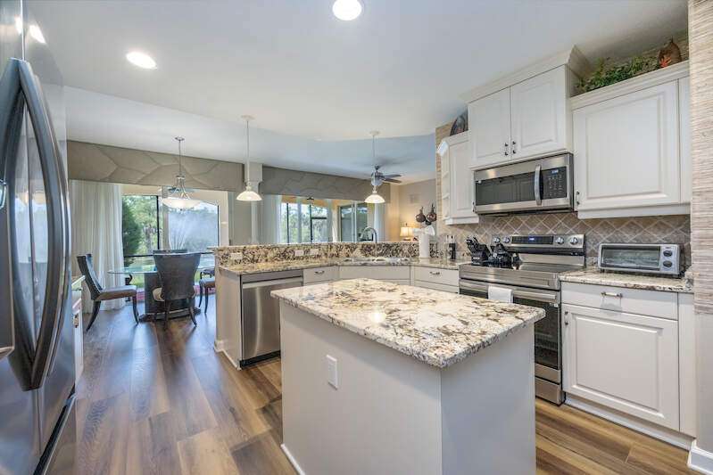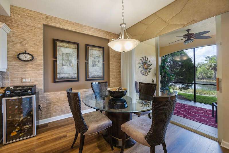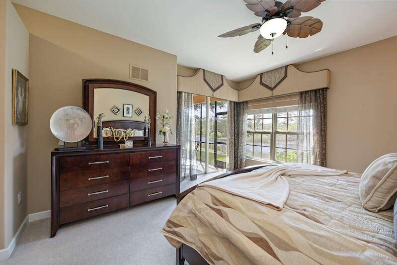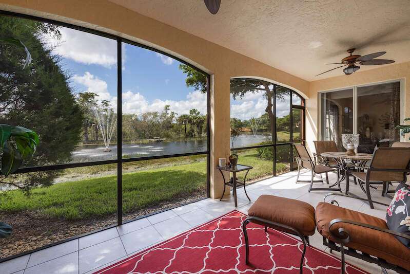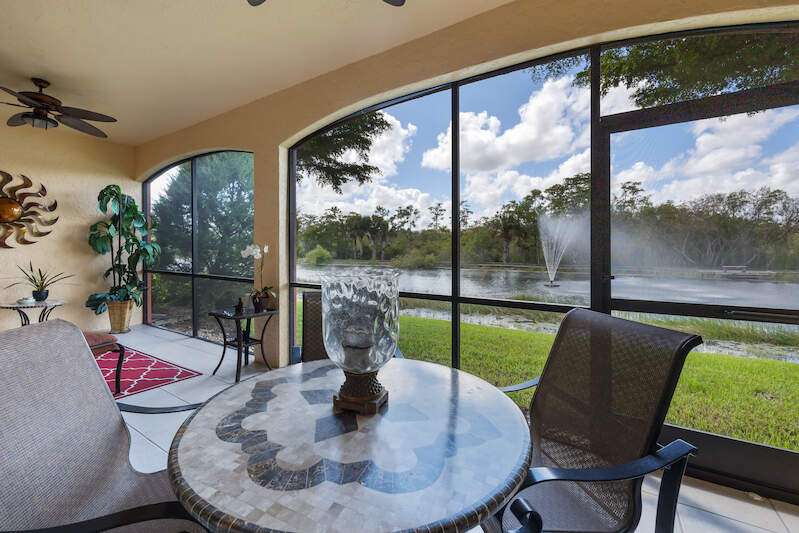 LAKE AND FOUNTAINS IN THE BACK AND FRONT! Rarely available, this gorgeous home is on the first floor, a Southern exposure with a large Lanai overlooking the South lake, fountain, and preserve in the main section of the community. NEW in 2024, custom closet organizers, all new kitchen appliances, several new ceiling fans, a new water heater, a new HVAC system, new GORGEOUS granite countertops, backsplash, kitchen sink and faucet, garbage disposal, and stunning wood laminate flooring throughout. All new matching granite countertops and tub surround in the primary suite with new sinks and faucets there too! This beauty comes artfully and tastefully furnished by a local decorating firm. Move in ready! The 2-car garage is oversized with incredible amounts of storage room for a workbench, motorcycle, long truck, or SUV as well. Rapallo sits in the main hub of Estero within walking distance to Coconut Point Mall, shops, dining, the new Williams Road Sports Park, and indoor pickleball at the nearby Estero Community Rec Center. Rapallo has its own clubhouse, 2 resort-style pools, a lap pool, a hot tub, tennis, fitness, bocce, and a walking path. If you missed your opportunity to own one of these homes last year, don't snooze this time!