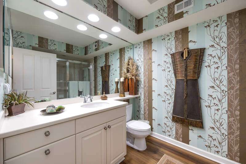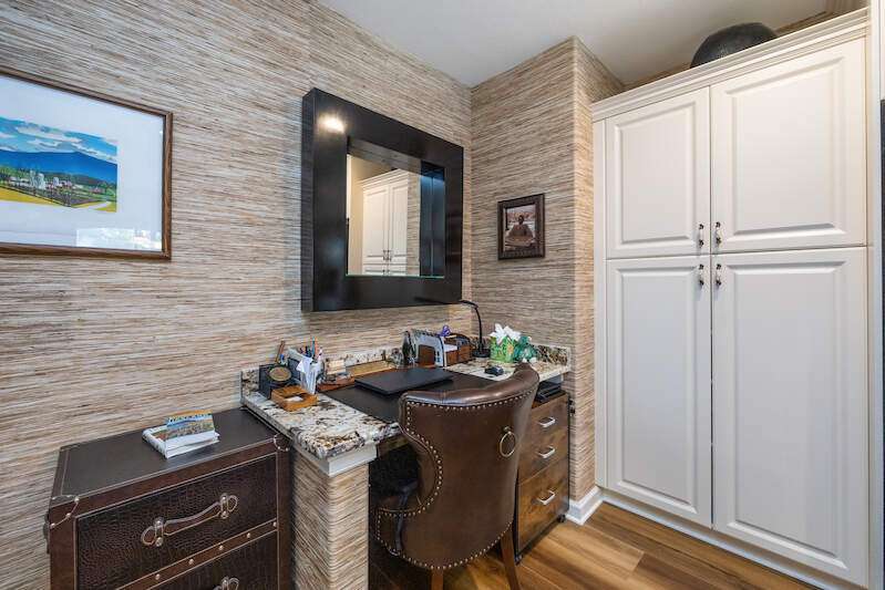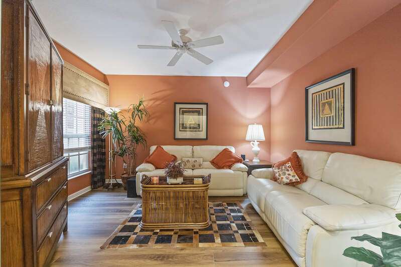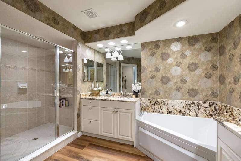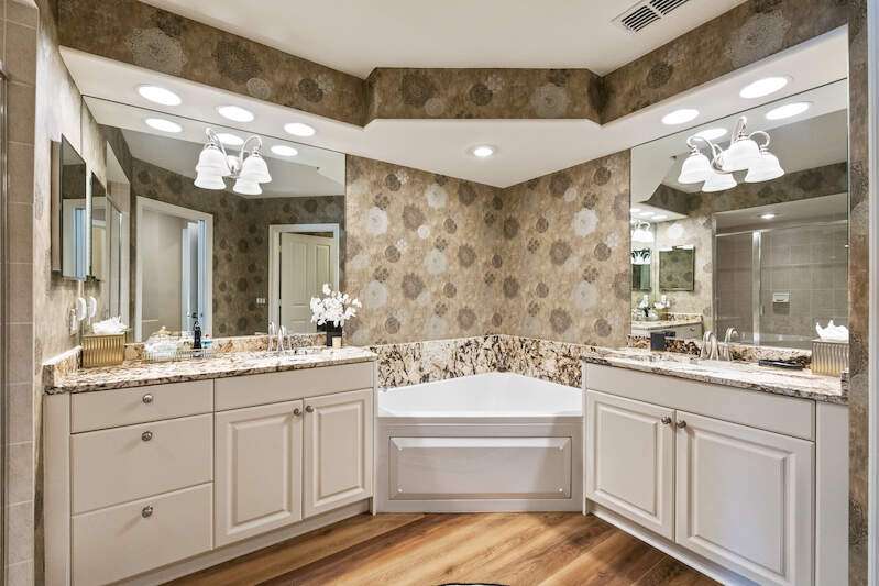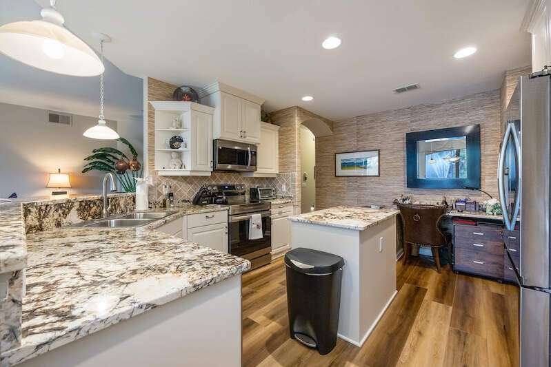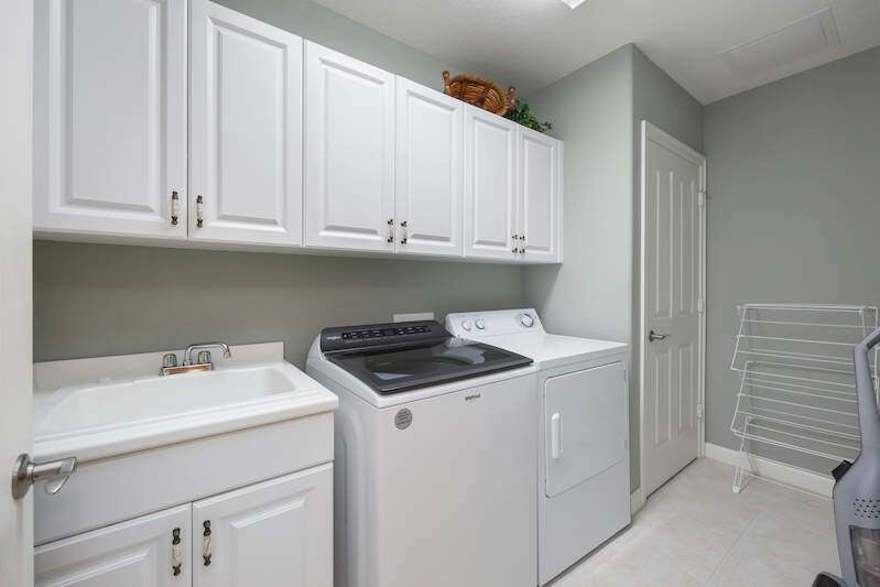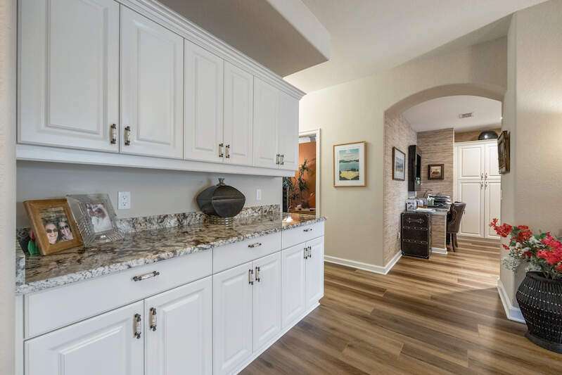 LAKE AND FOUNTAINS IN THE BACK AND FRONT! Rarely available, this gorgeous home is on the first floor, a Southern exposure with a large Lanai overlooking the South lake, fountain, and preserve in the main section of the community. NEW in 2024, custom closet organizers, all new kitchen appliances, several new ceiling fans, a new water heater, a new HVAC system, new GORGEOUS granite countertops, backsplash, kitchen sink and faucet, garbage disposal, and stunning wood laminate flooring throughout. All new matching granite countertops and tub surround in the primary suite with new sinks and faucets there too! This beauty comes artfully and tastefully furnished by a local decorating firm. Move in ready! The 2-car garage is oversized with incredible amounts of storage room for a workbench, motorcycle, long truck, or SUV as well. Rapallo sits in the main hub of Estero within walking distance to Coconut Point Mall, shops, dining, the new Williams Road Sports Park, and indoor pickleball at the nearby Estero Community Rec Center. Rapallo has its own clubhouse, 2 resort-style pools, a lap pool, a hot tub, tennis, fitness, bocce, and a walking path. If you missed your opportunity to own one of these homes last year, don't snooze this time!