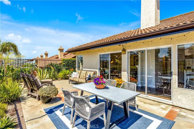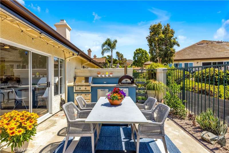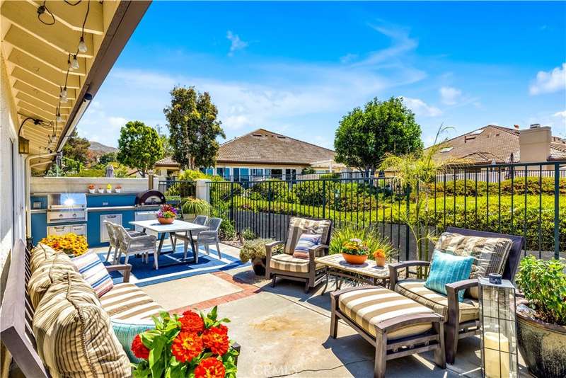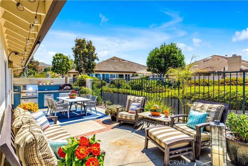 Hear the Mission Bells and enjoy the cool Coastal Breezes from this upgraded 3 bed | 2 bath + loft townhome in the sought-after community of Mesa Vista in beautiful San Juan Capistrano. Ideally situated in a private, interior location, this home lives like a single level with all the bedrooms on the main floor and a spacious, flexible layout throughout. Step through the gated front courtyard into an open living area filled with natural light and accented with a gas fireplace and tile floors. Sliding glass doors lead to a beautifully landscaped wraparound patio with golf course, city lights, and Mission views--perfect for indoor/outdoor living. Custom built outdoor kitchen and grill area includes a stainless gas barbecue, refrigerator and custom drawers and makes this back yard a perfect place to entertain. Spacious, comfortable and with room for multiple seating areas, it is the perfect spot to enjoy sunset views looking out to the historic San Juan Capistrano Mission. The interior kitchen is upgraded with granite countertops, wood cabinetry, recessed lighting, tile flooring and at counter seating and is open to the eating nook with patio access. Separate dining room offers the perfect entertaining area or it can be an ample flex space for more modern use of space. All 3 bedrooms are located on the main floor which allows for ultimate single level living. Main-floor primary suite offers a private patio and a renovated en-suite bath with step-in shower, custom vanity, tile flooring, and walk in closet. Two secondary bedrooms are large enough for queen sized beds and a large loft provides space for guests, a home office, or bonus area. Other highlights include an attached 2-car garage with direct access, garage overhead storage, washer and dryer, newer air conditioner (2023), furnace (2023), newer window shades (2023), modern light fixtures (2025), bathroom fixtures (2025), newer interior paint and carpets (2022). Nestled in the rolling hills of historic San Juan Capistrano, Mesa Vista offers 3 pools/spas, and optional RV parking. Enjoy the lifestyle this home offers being just minutes away from award-winning schools, shopping, hiking trails, world-class beaches, fine dining, equestrian facilities, golf courses, and the charming downtown area. All this and easy freeway access! WELCOME HOME!