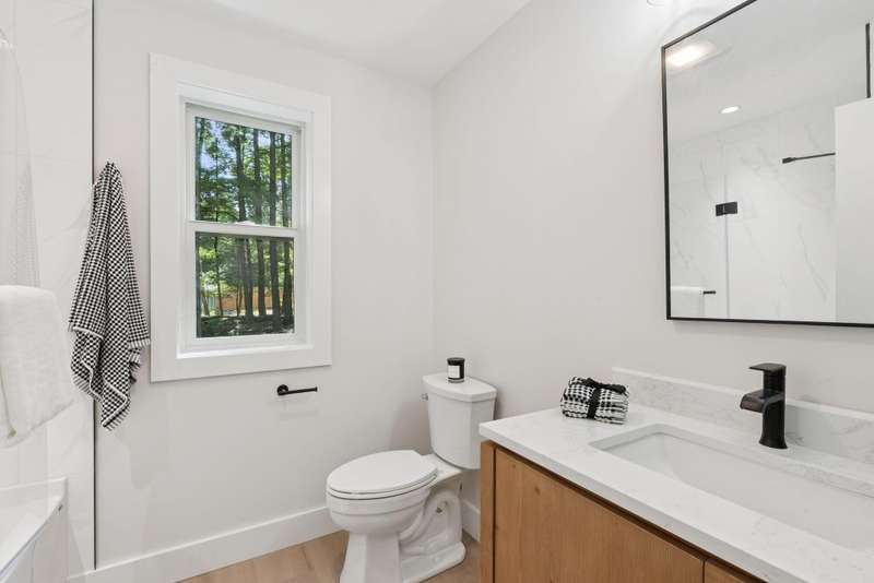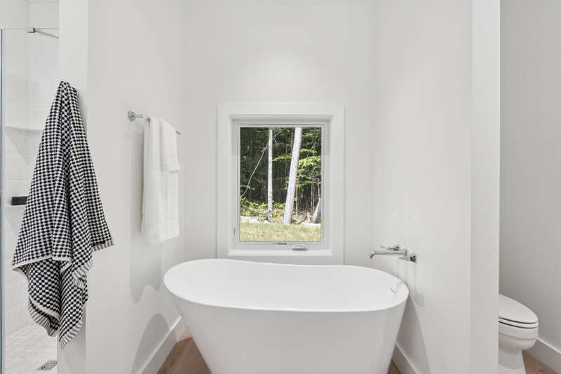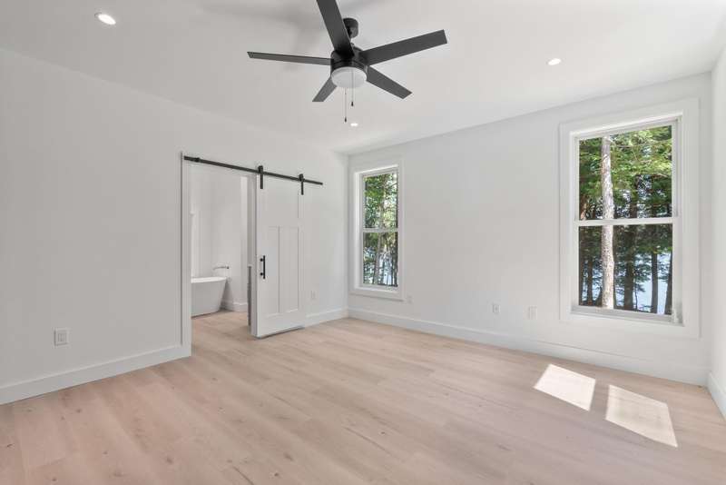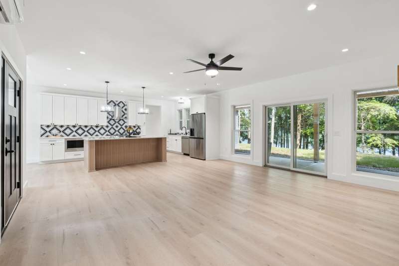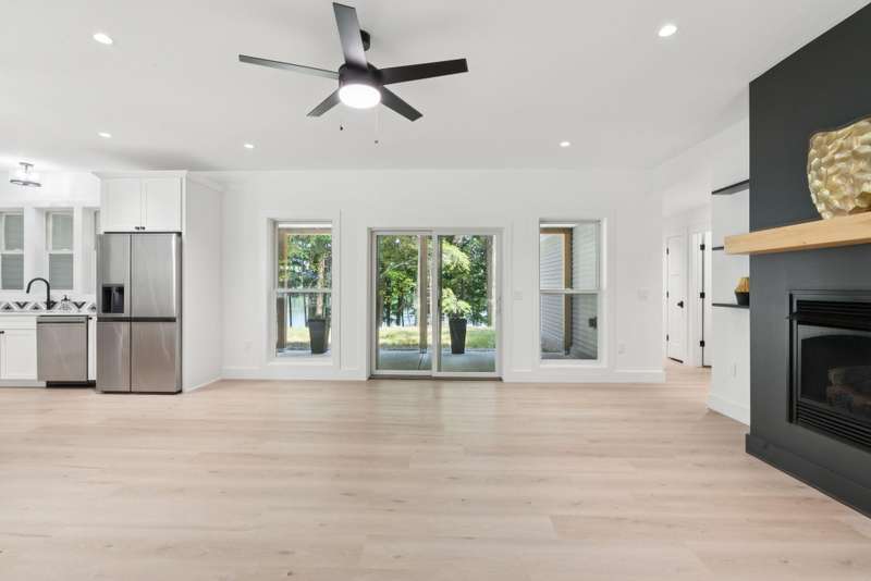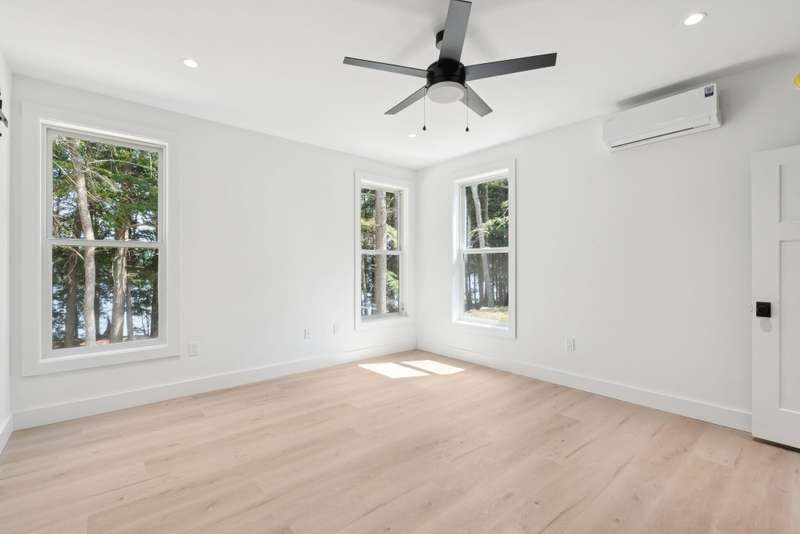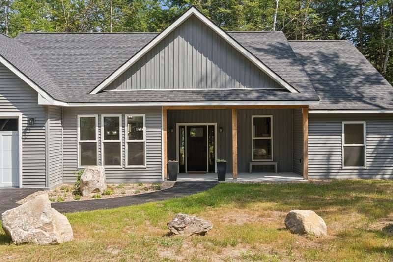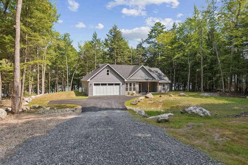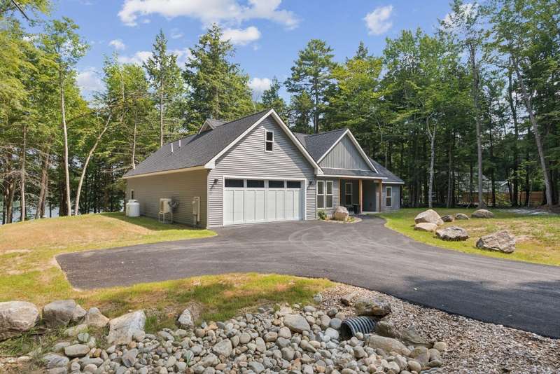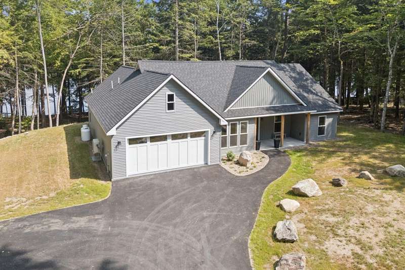 Welcome to Echo Lake! This brand new home has so much to love. This home has 4 bedrooms and 2.5 baths with a modern layout. The open kitchen, dining, and living room give you a spacious feel while focusing your attention toward the lake with all the large windows. The kitchen features quartz countertops, a beautiful island, and stone tile backsplash. The living room features a gas fireplace to warm the home on a cozy winter night. The primary bedroom faces the lake and has a gorgeous en suite bathroom. The bathroom features dual separate vanities, a glass and tile shower, large soaking tub next to a large window, and a private flush. This home is incredibly energy efficient with radiant heat (including the garage), heat pumps, and a heat recovery ventilation system to maintain perfect indoor air quality. The large sliding glass door leads to a covered patio and backyard space. Granite steps lead you to the flat entry into the lake. This 4 acre parcel is nearly completely flat making it extremely private with lots of usable space. The shoreline is a stabile mix of cobble, boulders, and gravel. The clean lake bottom is perfect for swimming. Echo lake is a deep glacial till lake that is surrounded by a hemlock lined shoreline, giving you that Maine feel that we all love! Properties with this space and privacy do not come along often. Only the best quality materials were used for the fit and finishes. This property checks all the boxes!