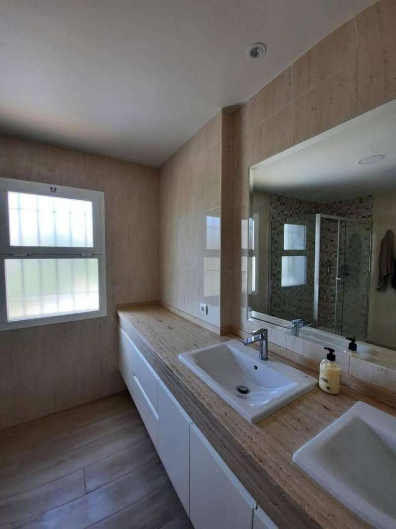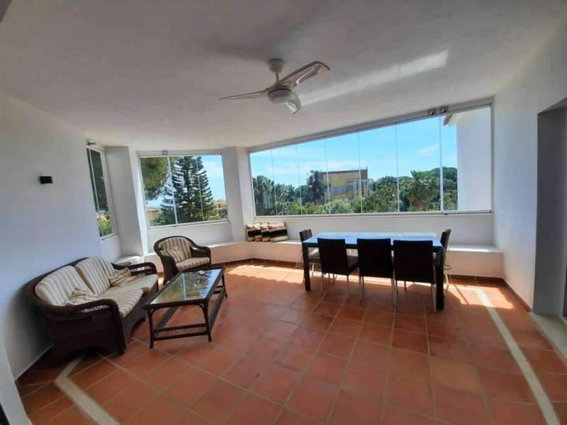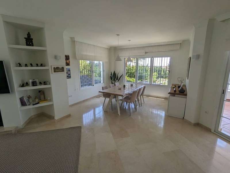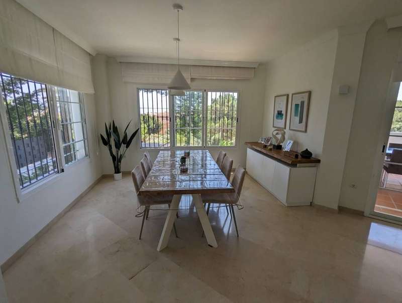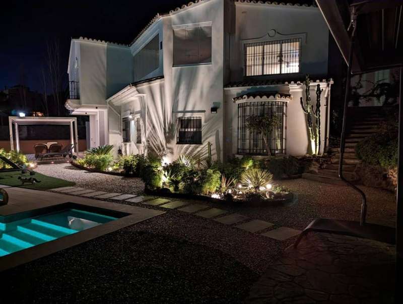 Located in a peaceful area of Elviria and surrounded by nature, this recently renovated villa offers a comfortable and luxurious living experience. With 5 bedrooms and the possibility to expand to 6, this property combines Mediterranean style with contemporary interiors. Upon entering, you will be greeted by a modern, fully equipped kitchen with a breakfast area and direct access to a charming terrace. The spacious open-plan living room features a cozy fireplace, while the open dining area extends to a beautiful enclosed terrace with panoramic and partial sea views. On the main floor, you will find three bedrooms, a shared bathroom, and a guest toilet. The sustainable garden level hosts two additional bedrooms, both with en-suite bathrooms and direct access to the garden from the terrace. The terrace also includes an elegant electric pergola, ideal for enjoying the outdoor space year-round. The meticulously designed and fully sustainable garden offers a heated pool, a gazebo with a
