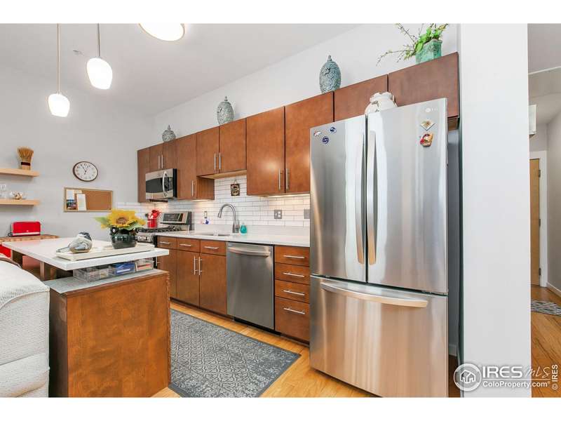 Lock-n-leave lifestyle in Old Town Fort Collins at an affordable price at this wonderful Penny Flats condo! The balcony of this home faces south so you'll enjoy plenty of natural light and sunshine while relaxing and enjoying the Old Town vibe and views of the city. So close to shopping and dining, the MAX transit bus for an easy ride to CSU and south Fort Collins, plus easy access to medical facilities and Highway 287 and I-25. Urban, contemporary loft with dark maple cabinetry, quartz counter tops and custom island, 10 ft ceiling adds to the feeling of space and airiness, engineered hardwood flooring, custom closet organizer in the primary suite and remodeled baths. Second bedroom/office is a great flex space you can set up however you'd like. It has a large closet for storage and is currently shown in the photos as a bedroom. Underground secure parking, 4' x 7' storage space, and lots of closet space within the home. Enjoy everything that Old Town Fort Collins can offer including Lee Martinez Park, local breweries, festivals and farmers markets, the Discovery Museum and numerous local eateries, entertainment venues and boutiques. Very affordable living - the HOA includes gas and water. Perfect option for both a full time home or a 2nd home in this great city.