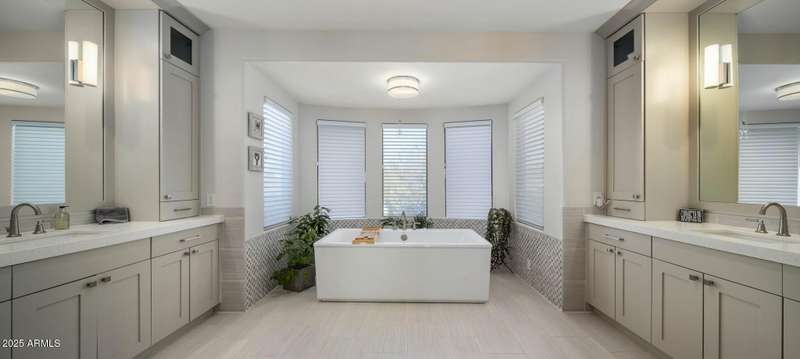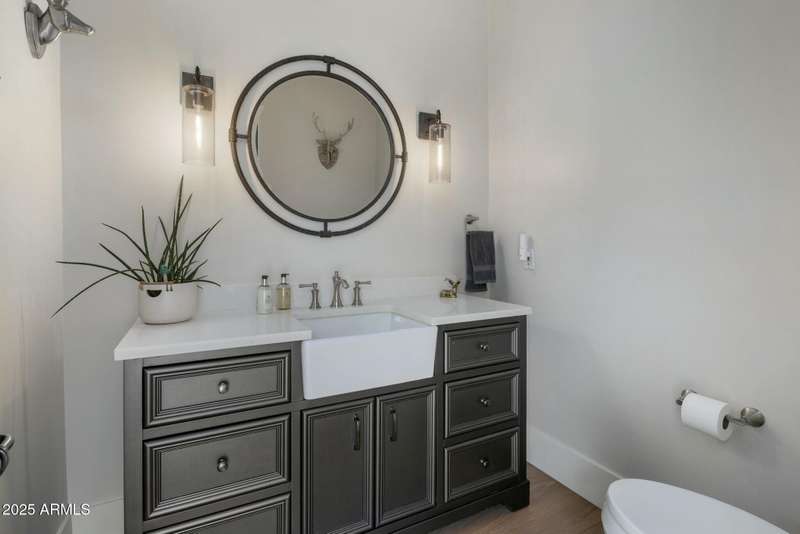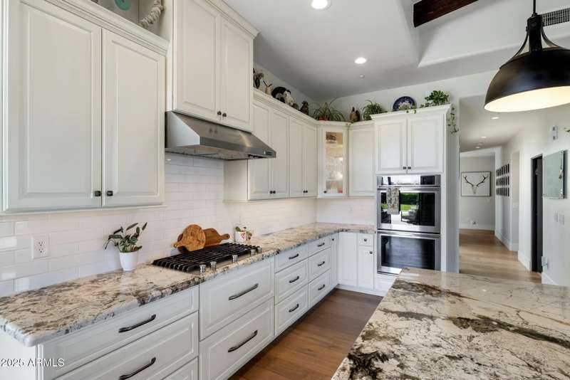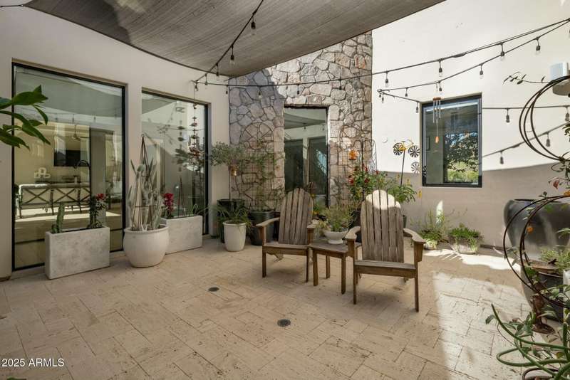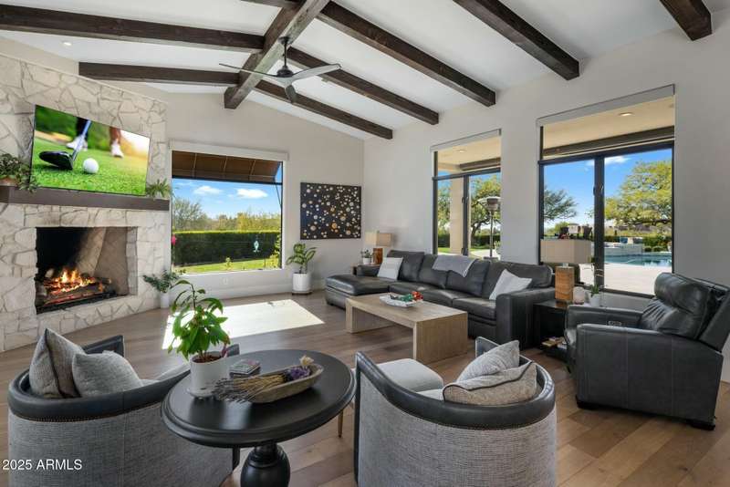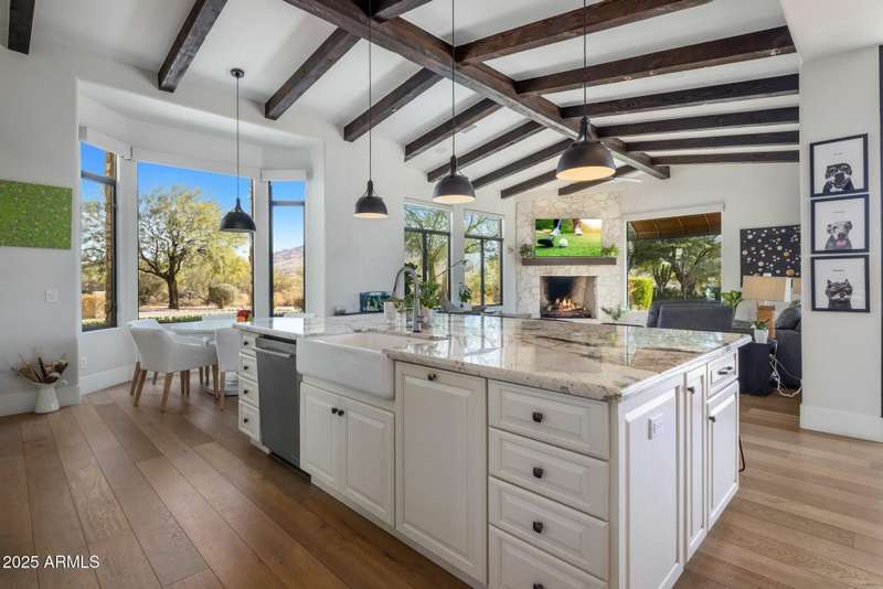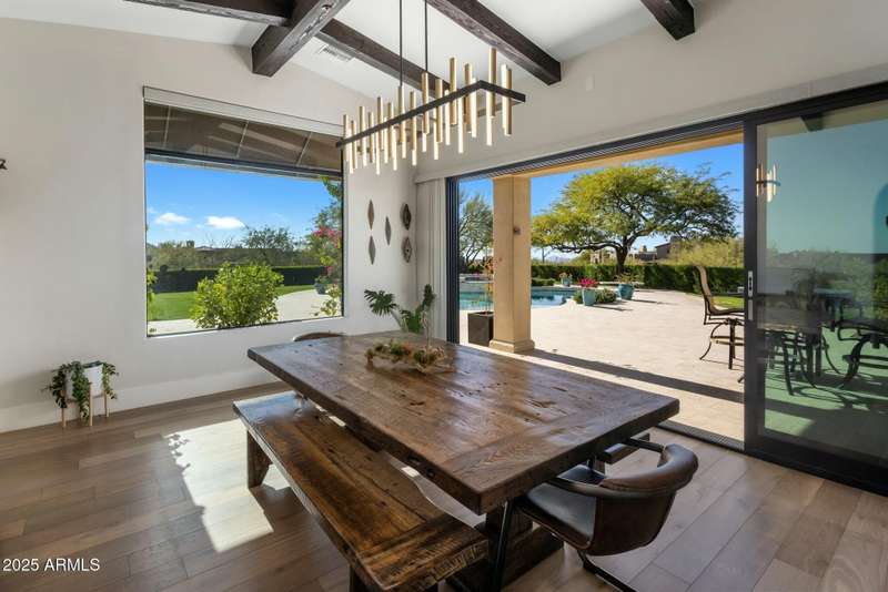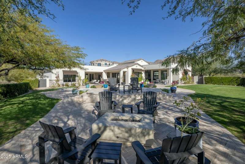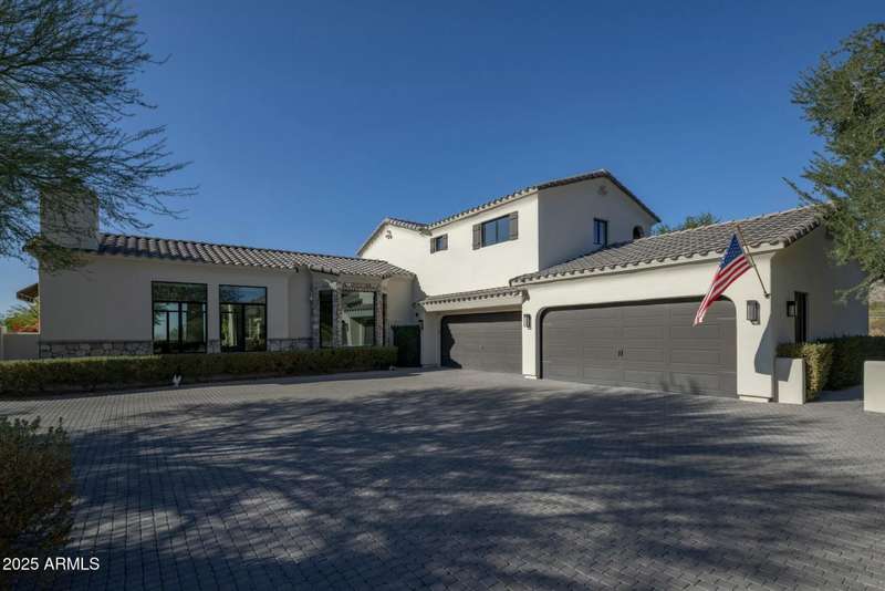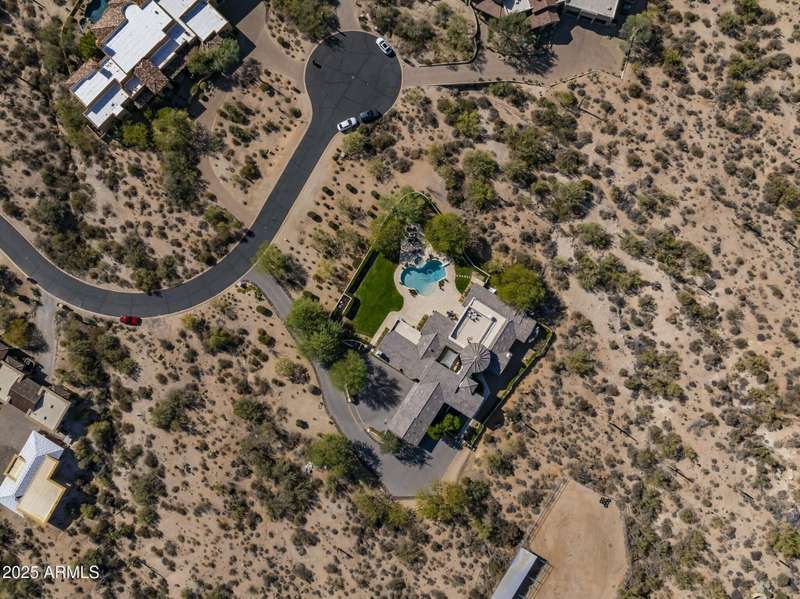 Private estate with 360 degree views on a 2.5 acre lot in the gated community of Ladera Vista. Remodeled in 2020, sits 4 bedrooms with 4.5 baths, plus an office, second family room and bonus room with a total of 5,509 sqft. The property captures views of the McDowell Mountains, Troon Mountain and Pinnacle Peak out any of the floor to ceiling windows or the multiple glass sliding walls throughout the home that brings to life the indoor/outdoor living. The kitchen sets the focus with custom cabinetry, JennAir and Subzero appliances, double ovens, gas cooktop, oversized kitchen island and a custom stone wall fireplace leading into the formal living room. A walk-in pantry separates your kitchen from your formal dining room which also has its own butler's pantry perfect for hosting. The downstairs master bedroom showcases views of the Southwest and is oversized to accommodate the sitting room and gas fireplace. The primary bathroom features double vanities, soaking tub, with wood and tile flooring throughout. Powder bath, two offices, second formal living space and another ensuite bedroom with French doors are all downstairs. Step up the hand forged spiral staircase to two more ensuite bedrooms, loft and an additional bonus room. Rooftop deck has sweeping views and captures the city lights at night! Dip in your spa that overflows into your heated pool, which features a Baja deck and fire pit with large mature trees and Ficus for extra privacy surrounding. The multiple covered patios make entertaining seamless. The 4-car garage is temperature controlled with built in cabinets for extra storage. Quick 5 minutes to Scottsdale Quarter, Kierland and local grocery store AJ's Fine Foods. Minutes away from Pinnacle Peak and Tom's Thumb Trailhead.