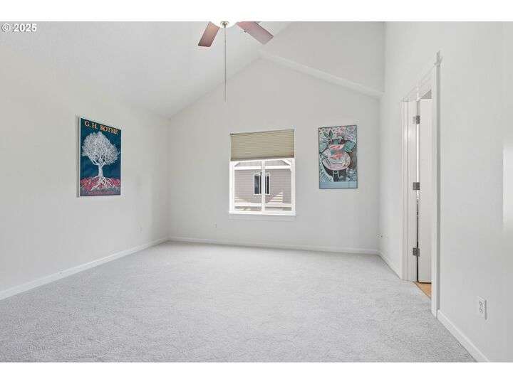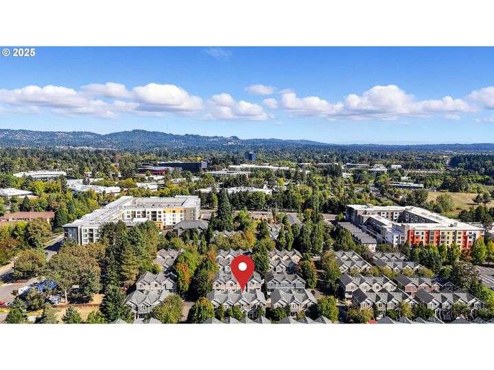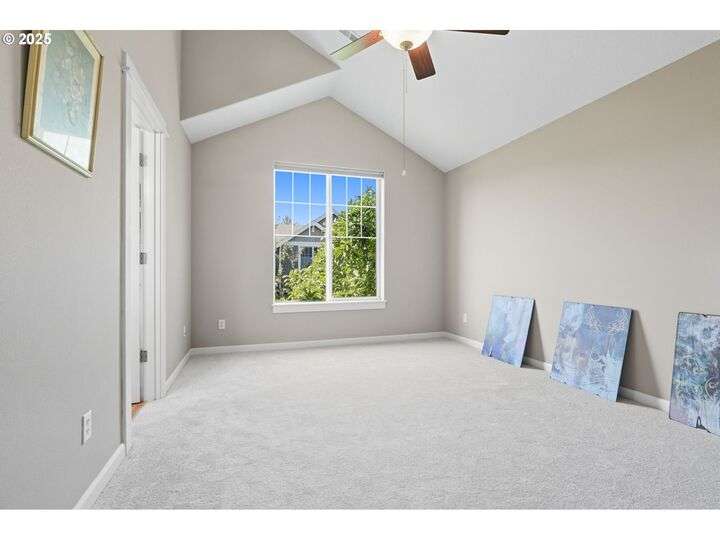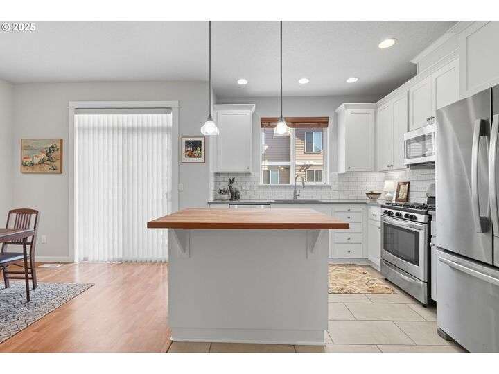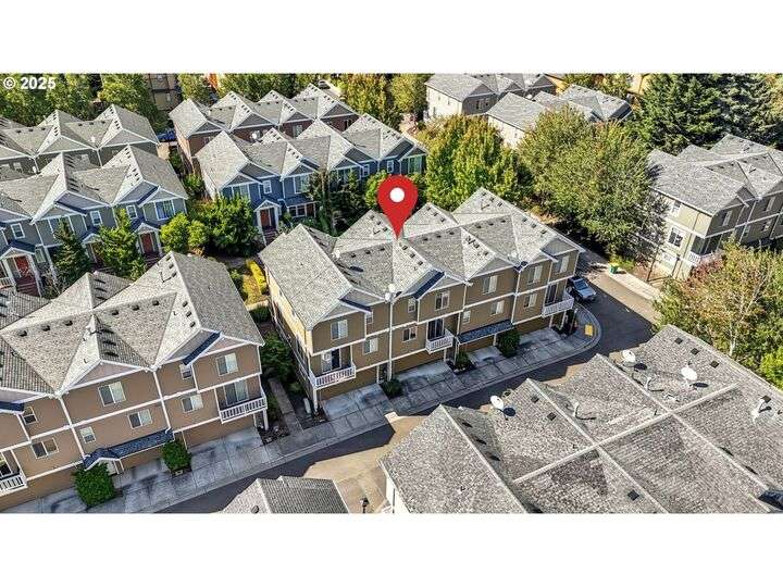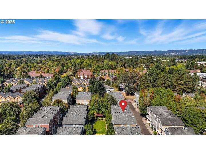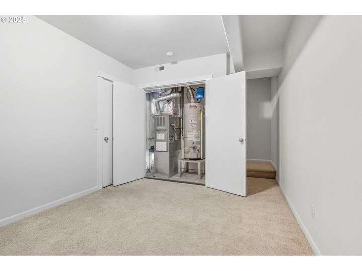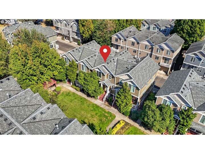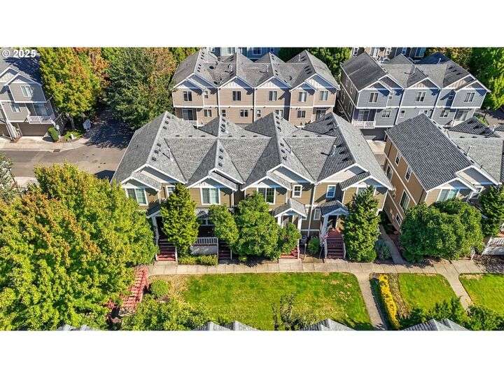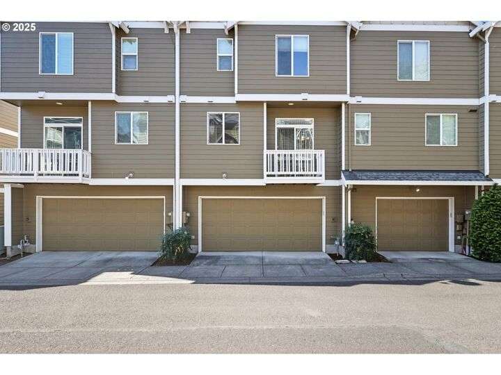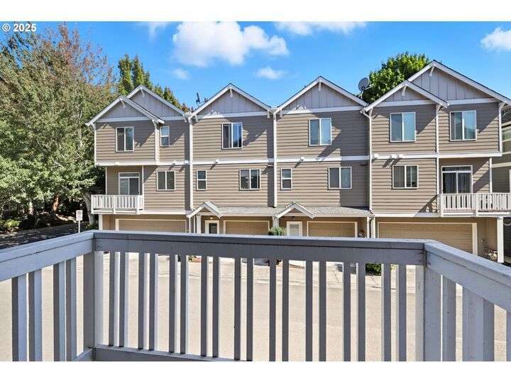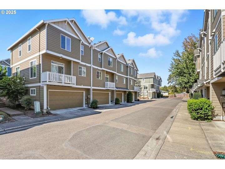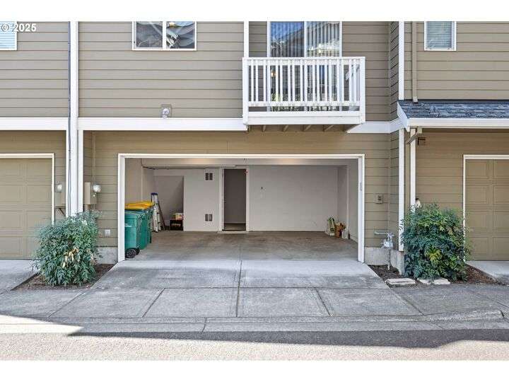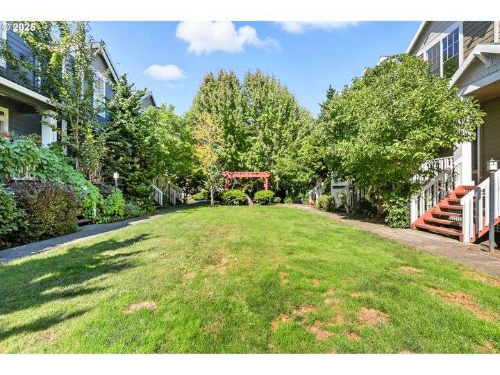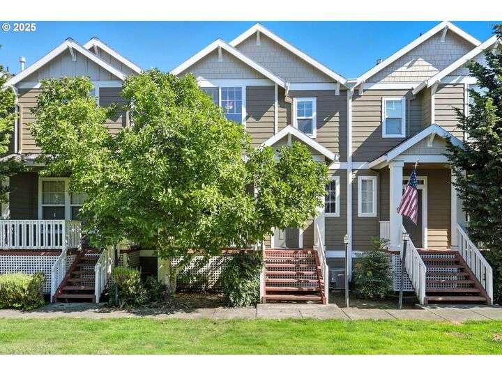 One super-cool thing about THIS townhome is the lush and beautifully landscaped courtyard entrance, a rare feature in an urban location. Enjoy a green view from the covered front porch and living room (many townhomes overlook the parking lot!) Upgraded interior space features BRAND NEW CARPETING up the stairs, and the entire upper level. High ceilings and towering vaults in the TWO ensuite bedrooms are crowned with handsome ceiling fans. Oversized bedroom closets - the primary has two closets! Handy upstairs laundry, too. The kitchen's ceramic tile flooring, timeless butcher-block wood island and white subway tile backsplash create a quality, classic look. Bonus room on the lower level is ideal for extra work-space, exercise, game room or an additional family room. The 2-car attached garage has roomy, easy street access. Central location is very bike-able. Affordable, comfortable living in this plum, southwest Portland location awaits.