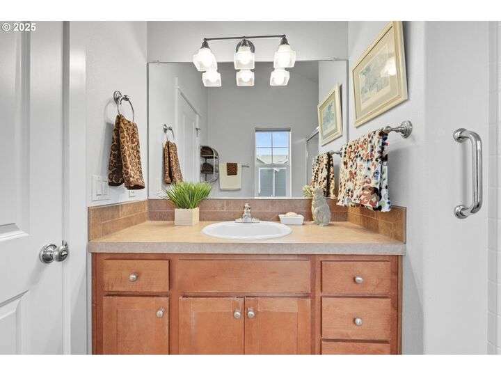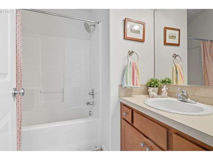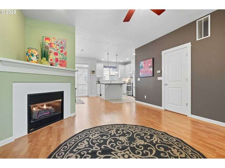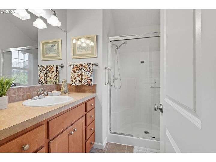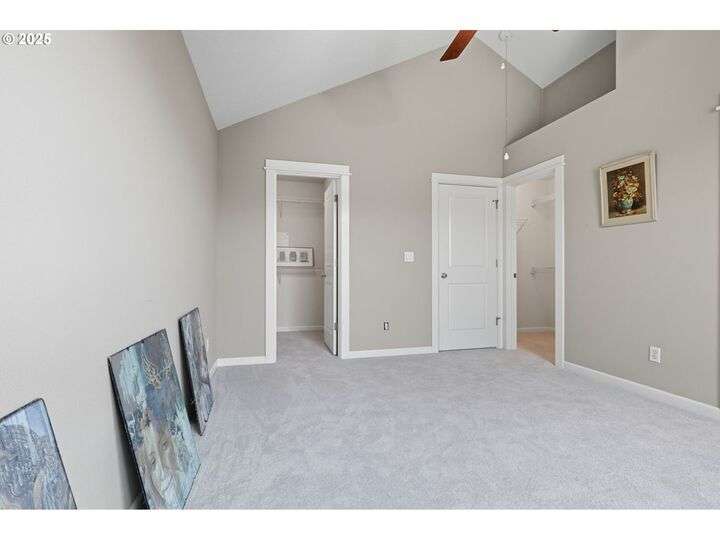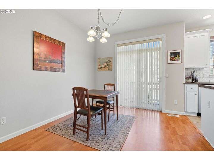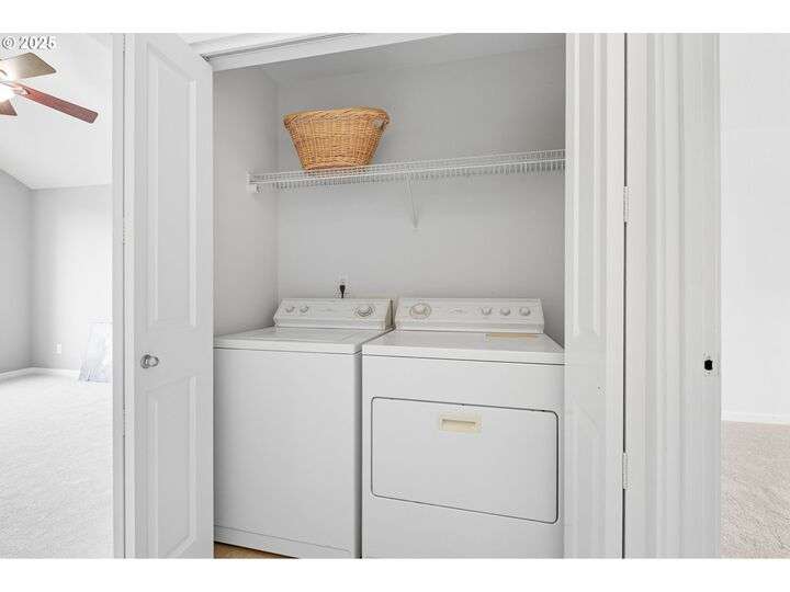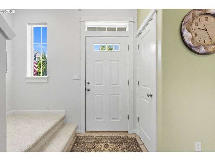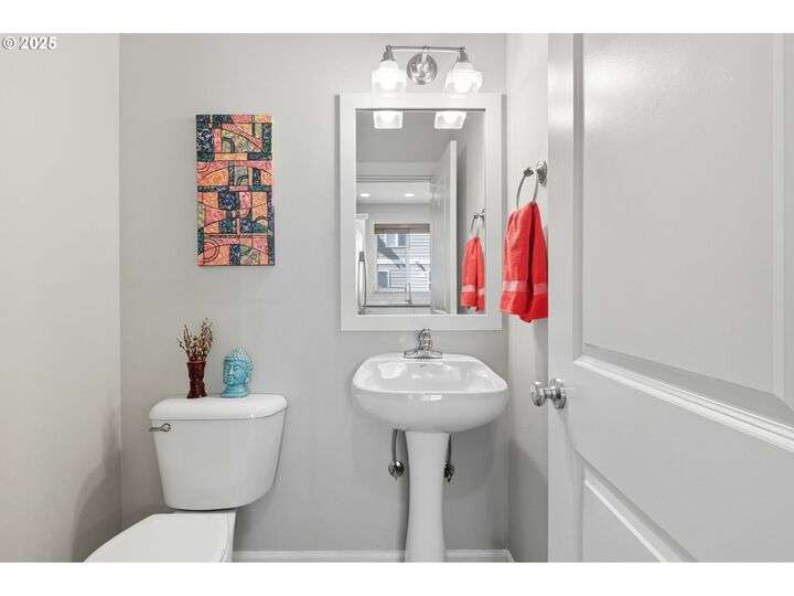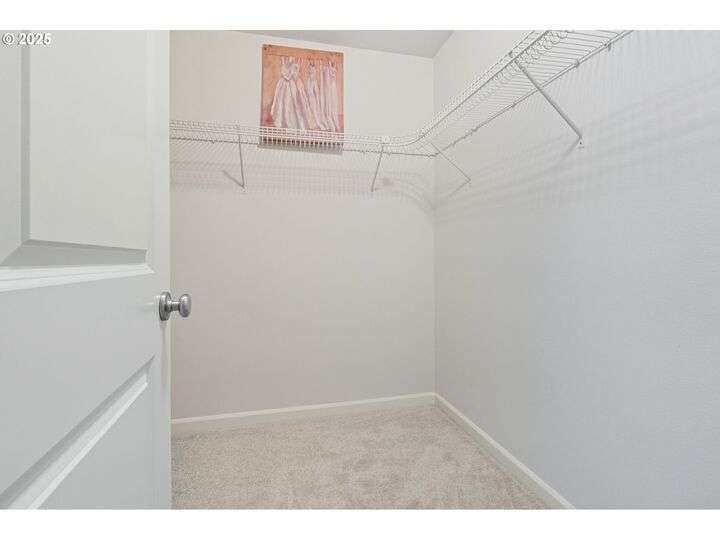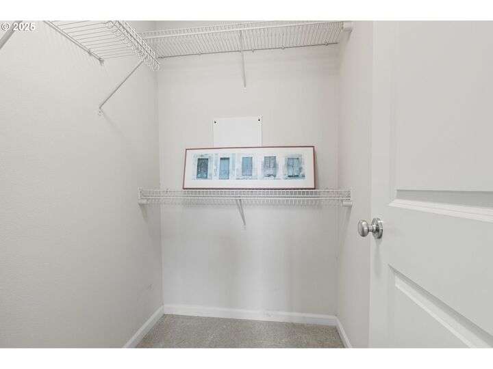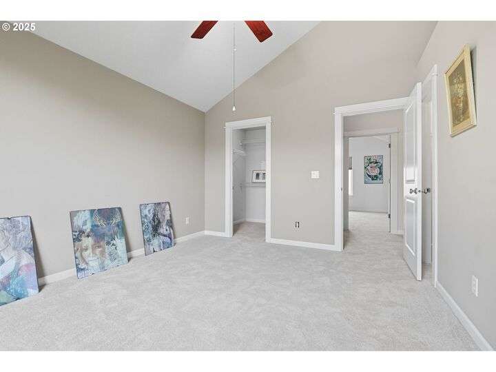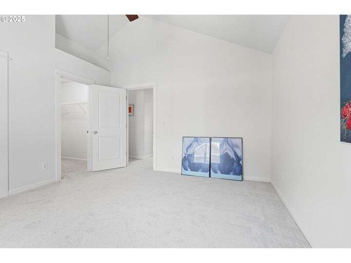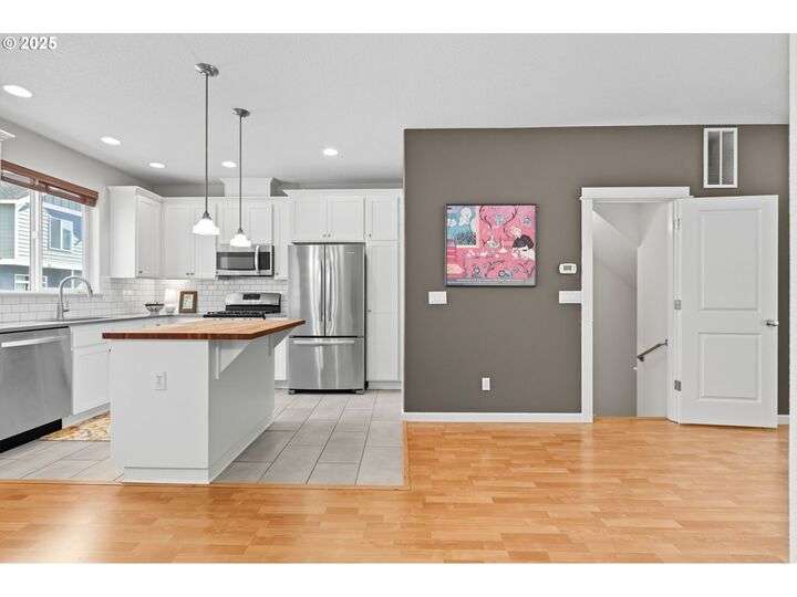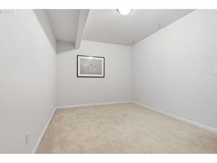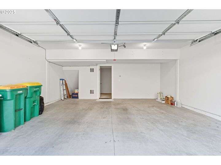 One super-cool thing about THIS townhome is the lush and beautifully landscaped courtyard entrance, a rare feature in an urban location. Enjoy a green view from the covered front porch and living room (many townhomes overlook the parking lot!) Upgraded interior space features BRAND NEW CARPETING up the stairs, and the entire upper level. High ceilings and towering vaults in the TWO ensuite bedrooms are crowned with handsome ceiling fans. Oversized bedroom closets - the primary has two closets! Handy upstairs laundry, too. The kitchen's ceramic tile flooring, timeless butcher-block wood island and white subway tile backsplash create a quality, classic look. Bonus room on the lower level is ideal for extra work-space, exercise, game room or an additional family room. The 2-car attached garage has roomy, easy street access. Central location is very bike-able. Affordable, comfortable living in this plum, southwest Portland location awaits.