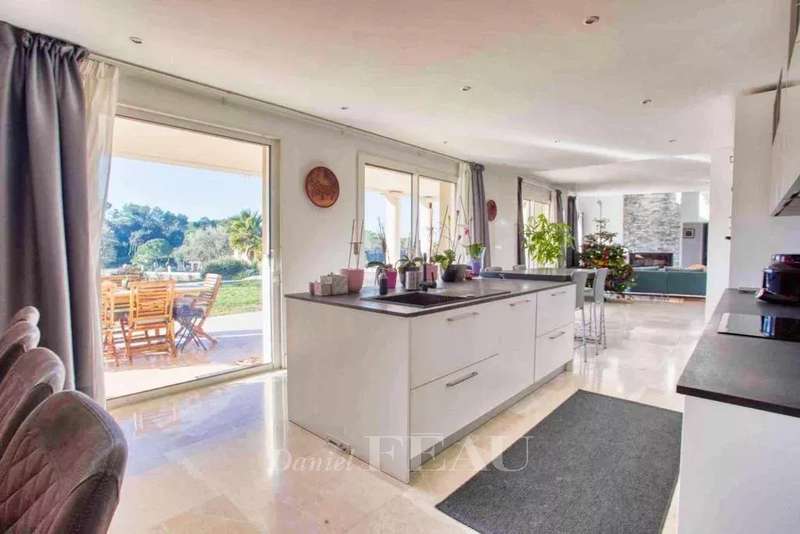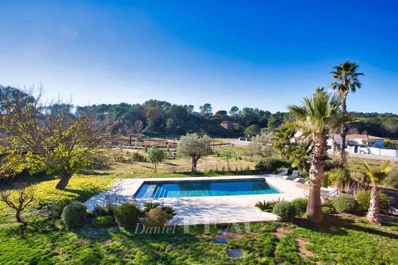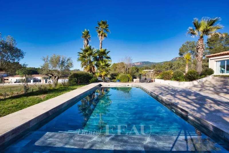 In an exceptional and unique environment, superb high-end villa of 259 m2 on a large landscaped plot of 4033 m². It offers neat and very high quality services such as: stone columns, artistic ironwork, Italian marble on the floor, underfloor heating, high-end insert of 1.20m on stone facing wall, aluminum joinery, central vacuum, alarm, etc... The main house offers on the ground floor, in an open and very bright loft style : - an entrance with large custom-made wardrobe and guest toilet, - a large living room of 85 m², with fully equipped open kitchen, opening onto a large partly covered summer terrace, - a cellar communicating with the garage of 36 m², - a master suite with custom-made wardrobe and large bathroom with bath, shower and toilet, - a bedroom currently used as an office, The first floor hosts : - a mezzanine overlooking the living room, - two bedrooms opening onto a large terrace, - a shower room with toilet. There is also a very well appointed independent apartment offering a beautiful living room, an equipped kitchen, a bedroom, a shower room with toilet and a private terrace. In the garden, a beautiful swimming pool surrounded by a huge terrace of 100 m² takes place. The large plot with century-old trees allows you to enjoy it while remaining completely out of sight. It benefits from automatic watering (connected to a historic stone well and the domestic network) and lighting. The house benefits from the possibility of extending more than 30 m² and from a very low electrical operating cost due to very good insulation of the building. In a unique and very private living environment, this property is located 20 minutes from three renowned golf courses (Terre blanche, Saint-Raphaël and Roquebrune-sur-Argens), 15 minutes from the beaches and 10 minutes from all amenities ( shops, schools, highway).