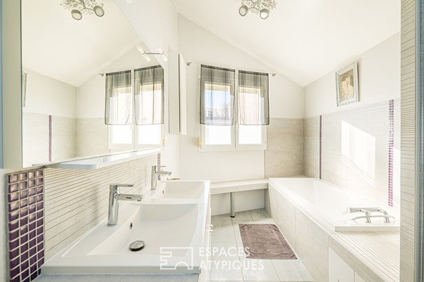 Upstairs, two bedrooms of nearly 15 m2 and another bedroom with a walk-in closet share a large bathroom with both a shower and a bathtub.