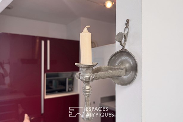 From the entrance, a hallway with a dressing room and a toilet leads to a spectacular living area, bathed in sunlight by large openings and a skylight. The spaces flow naturally into one another: a living area, a friendly dining room, and an open kitchen with a welcoming counter. The sense of space and the fluidity of the volumes give this interior an atmosphere that is both peaceful and inspiring.