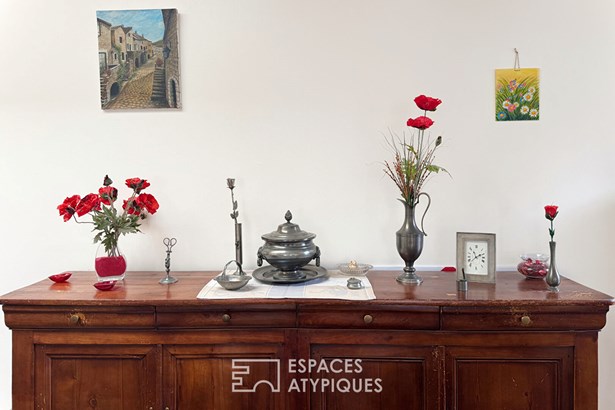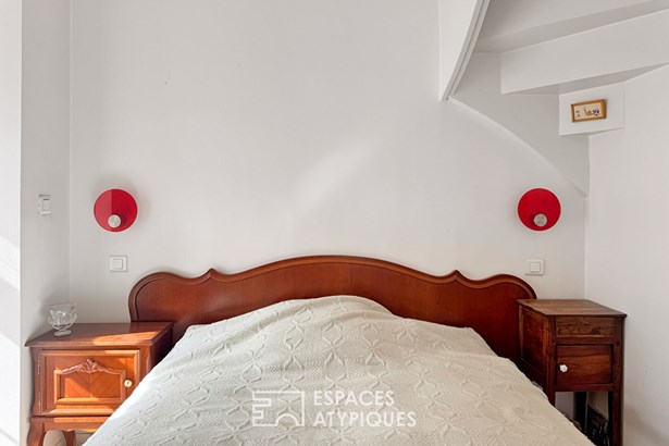 A first bedroom completes this level, offering a sleeping space or an office as needed. Upstairs, under exposed beams, there is a main bedroom and an office, in a cozy and charming atmosphere. A bathroom and a shared interior courtyard complete the set, while a parking space can also be added.