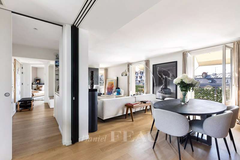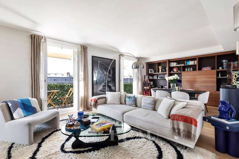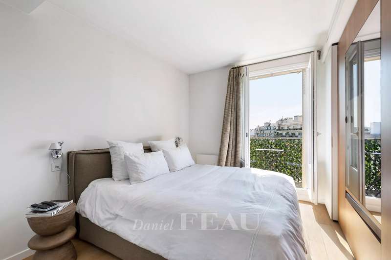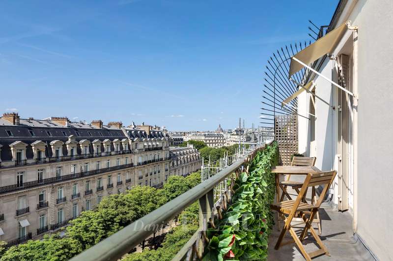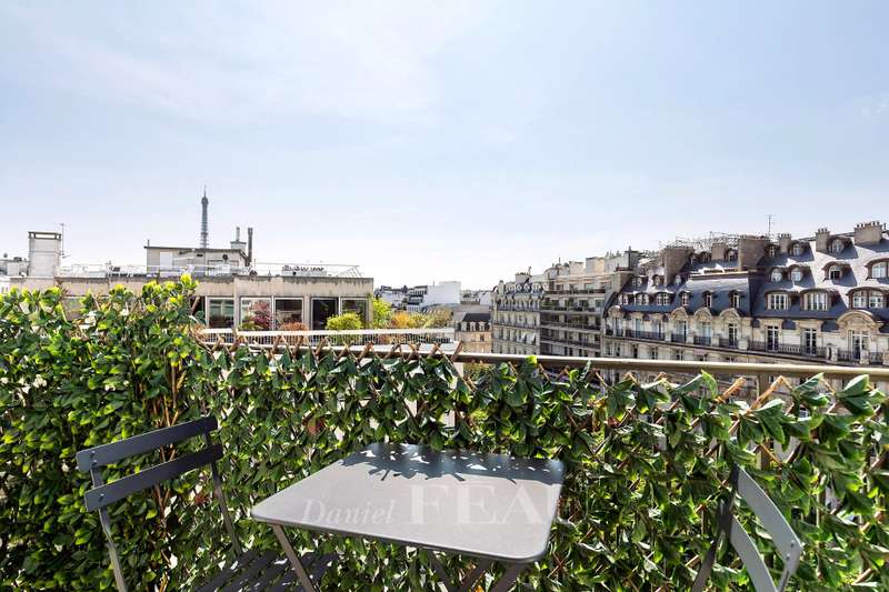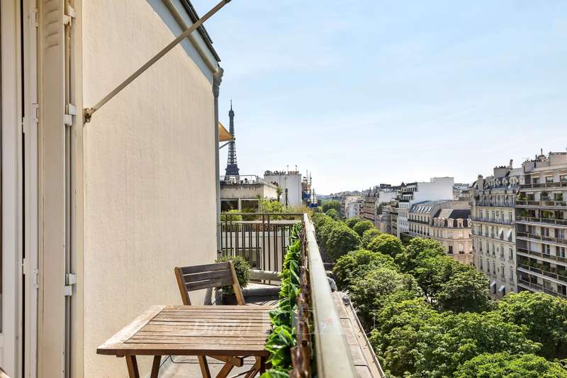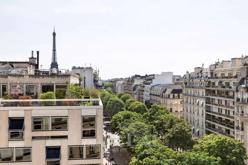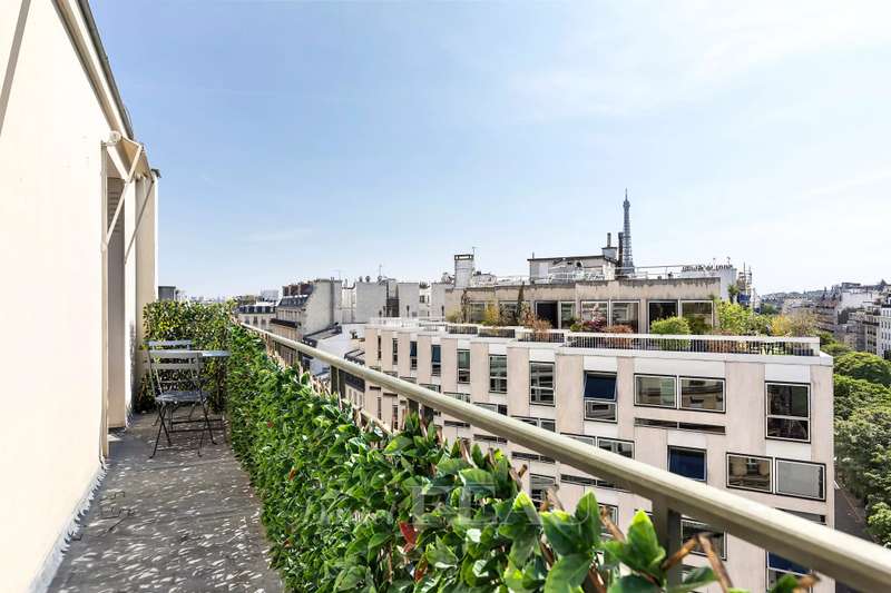 Prestigious avenue Montaigne. This recently renovated apartment benefiting from an excellent floor plan is on the top floor of a fine mid 19th century building with elegant common areas. Commanding panoramic views from Sacré Coeur Basilica to the Eiffel Tower, it includes a double living/reception room, a kitchen, a master suite with a bathroom and dressing room, a second bedroom with a shower room, and a guest wc. All rooms except the kitchen open onto a 20 sqm continuous balcony. With a 50 sqm attic and a vaulted cellar. A 35 sqm lock-up garage may be acquired at extra cost.
