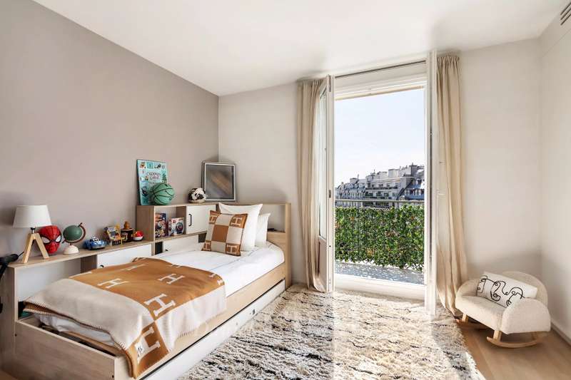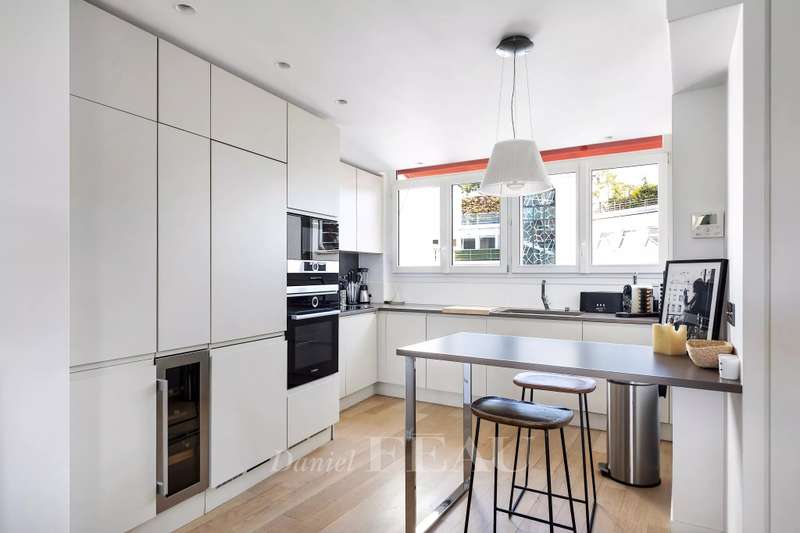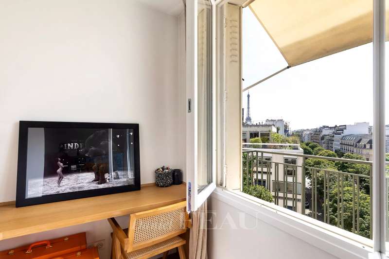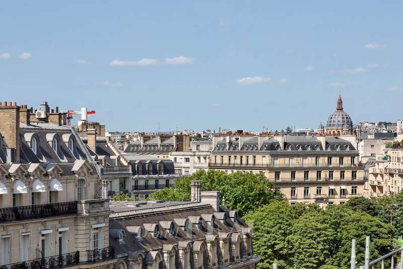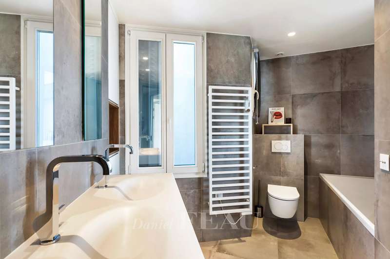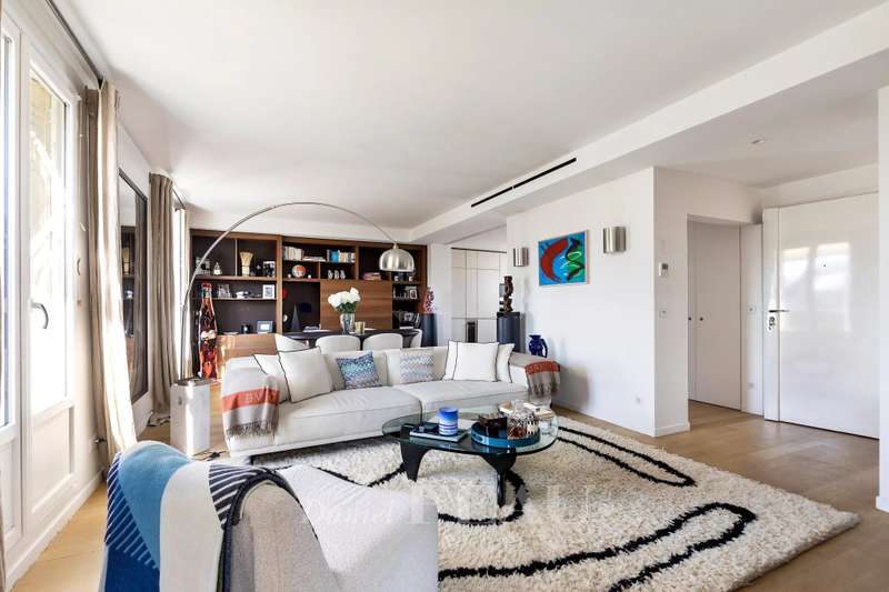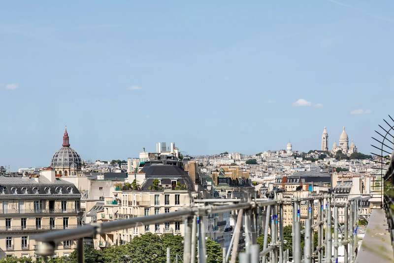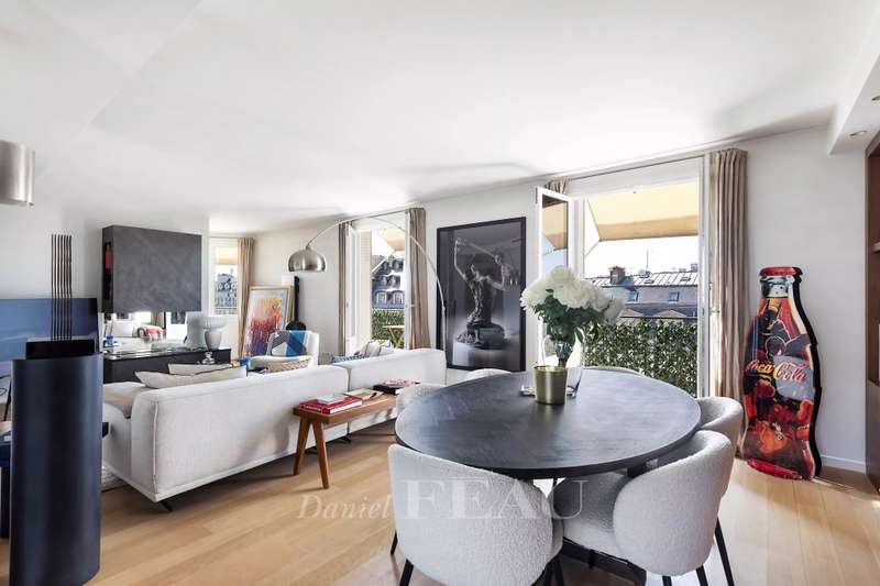 Prestigious avenue Montaigne. This recently renovated apartment benefiting from an excellent floor plan is on the top floor of a fine mid 19th century building with elegant common areas. Commanding panoramic views from Sacré Coeur Basilica to the Eiffel Tower, it includes a double living/reception room, a kitchen, a master suite with a bathroom and dressing room, a second bedroom with a shower room, and a guest wc. All rooms except the kitchen open onto a 20 sqm continuous balcony. With a 50 sqm attic and a vaulted cellar. A 35 sqm lock-up garage may be acquired at extra cost.