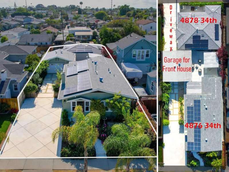 Turn-key; 2-on-1 property in Normal Heights is perfect for multi-generational living or income-producing investment. LIVE IN ONE AND RENT THE OTHER OR RENT BOTH, or create the ideal setup for extended familythis property offers flexibility and value in one of San Diegos most sought-after neighborhoods. North of Adams Avenue, in the heart of Normal Heights, this unique offering features a charming 1927 Craftsman home and a MODERN DETACHED ADU BUILT IN 2022, each with owned solar systems, private outdoor space, and separate parking. The front home is a classic 2-bedroom, 2-bath Craftsman, thoughtfully renovated to blend timeless character with modern updates. Improvements include a new roof, dual-pane windows, updated electrical and sewer lines, refreshed kitchen and baths, fresh interior and exterior paint, a newly poured garage slab, and professional landscaping. A new driveway and patio enhance curb appeal and functionality. The rear unit is a spacious, detached 2-bedroom, 2-bath ADU with alley access, its own private driveway, and a dedicated entranceoffering complete privacy and convenience. With 856 sq. ft. of living space, this light-filled home features an open-concept design, a private patio, and parking for two. Additional highlights include a large 460 sq. ft. detached two-car garage with potential for conversion (buyer to verify), and a detached shed ideal for a home office or creative space. The extra-wide driveway is a rare find in this neighborhood and adds exceptional value. Walk to coffee shops, restaurants, yoga studios, live music venues, and all the energy