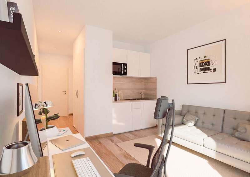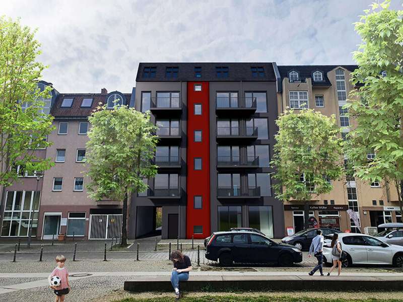 Fox Cube 5 offers a modern living experience for singles, students and couples on six floors. An elevator takes residents to the desired floor. The light-flooded studios from the ground floor to the 4th floor impress with their efficient floor plans, balcony or terrace, real wood parquet flooring with underfloor heating and modern bathrooms. Highlights include the two 2-room apartments on the top floor with floor-to-ceiling windows to the south-facing terrace and an open-plan living/kitchen and dining area. The building is certified to the KfW Efficiency House 55 standard and is therefore particularly energy-efficient.