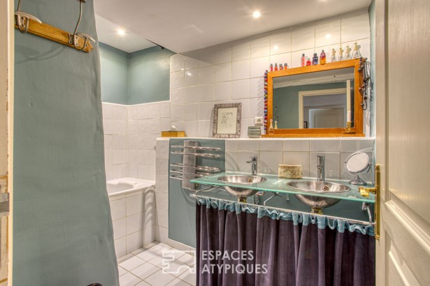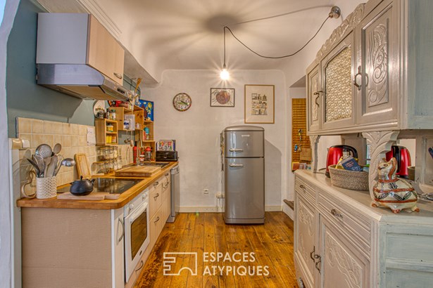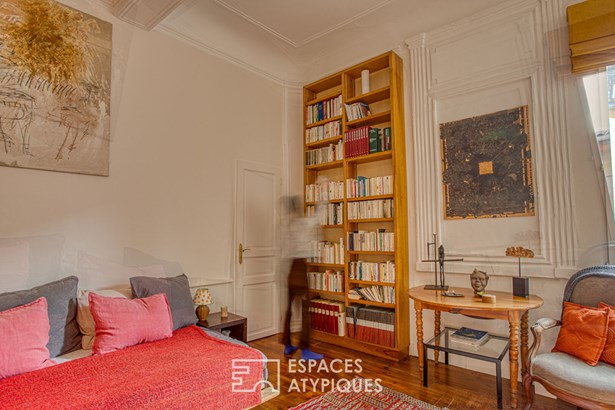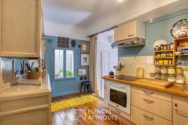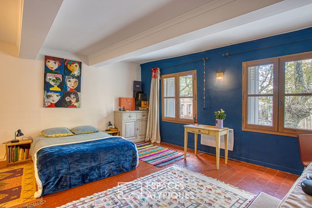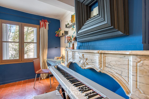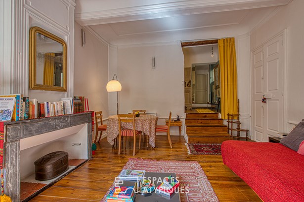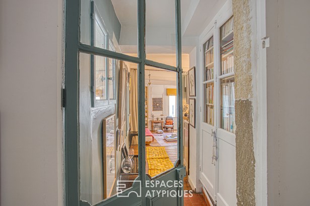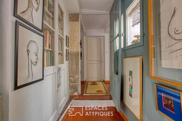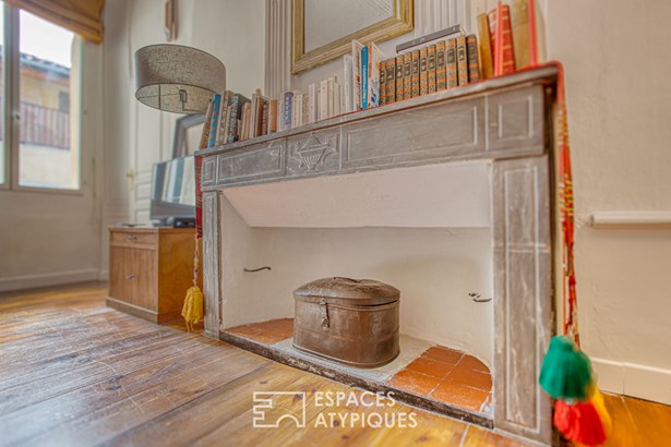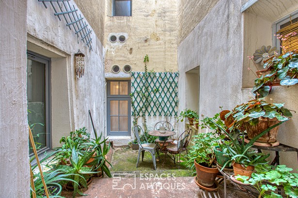 The entrance, secured by a digital code, opens onto a hall with a stone floor and decorated tiles. You will have the impression of entering into the history of the City itself. On the second floor is this apartment, full of light and charm. Access is via a hall, with storage, opening directly onto the kitchen which is very functional. This central space benefits from the light filtering through the windows of the private patio. Below, and on the courtyard side, is the magnificent living room bathed in natural light. A pretty corridor converted into a library leads us to the very large bedroom of 25m2. Hidden behind old doors a bathroom and a small laundry room are revealed. A custom-made dressing room by a craftsman carpenter offers all the necessary storage.