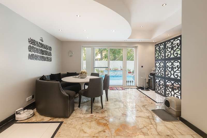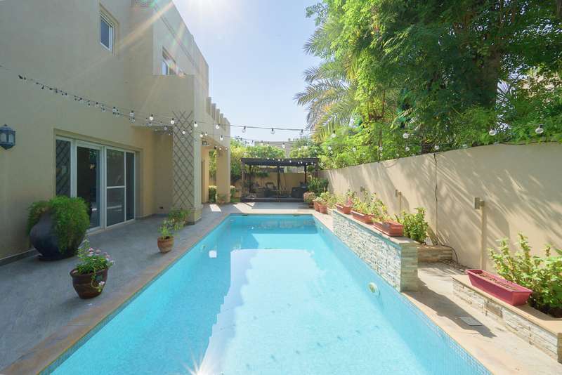 Leo and Betterhomes are pleased to bring to market this refurbished Type 11 5 bedroom Villa in the sought after community of Al Mahra in Arabian Ranches. Set on a generous plot, this home combines contemporary upgrades with the charm of Arabic architecture, offering both comfort and elegance in every detail. The villa has been thoughtfully transformed, boasting spacious living areas enhanced by high ceilings and an abundance of natural light. The open-plan layout seamlessly connects formal and informal spaces, perfect for both family living and entertaining. A sleek, modern kitchen with premium finishes flows into a bright dining area overlooking the landscaped garden. Upstairs, the bedrooms are all generously proportioned, with the master suite offering a private retreat complete with a luxurious en-suite and ample wardrobe space. Every bathroom has been tastefully upgraded, reflecting a sophisticated yet timeless design. Outside, the meticulously maintained garden offers multiple seating areas, ideal for hosting or unwinding in total privacy. This rare home is move-in ready, located within walking distance to community parks, pools, and schools—making it an ideal option for families seeking space, style, and serenity in one of Dubai’s most established neighborhoods. - BUA: 4,799 sq.ft. - Plot: 6,803 sq.ft. - 5 beds + Maids - Extended - Modern Kitchen - Pool - Gazebo - Vacant on Transfer