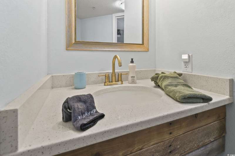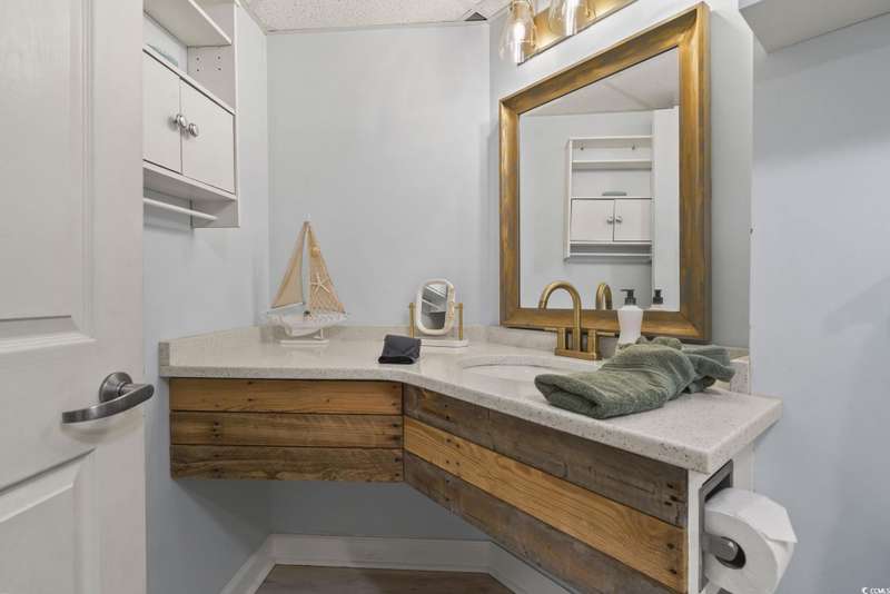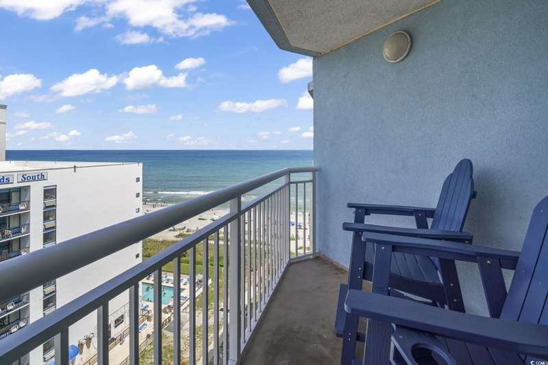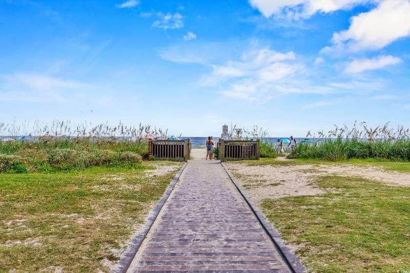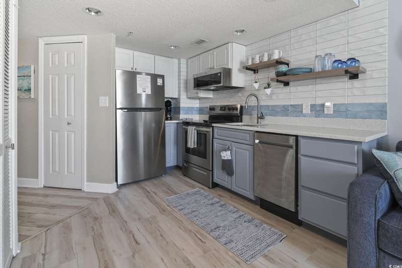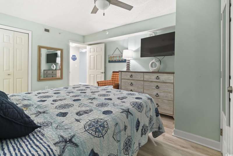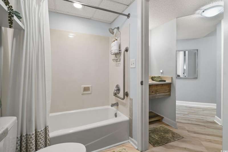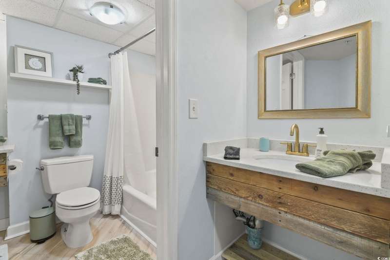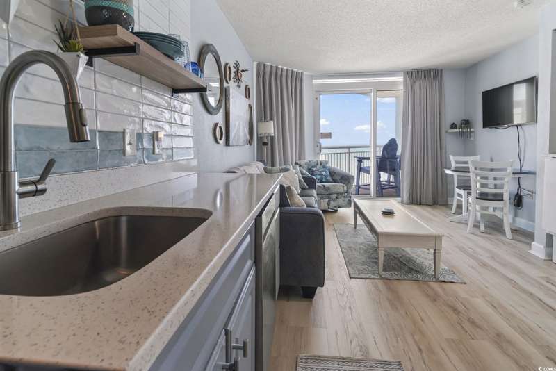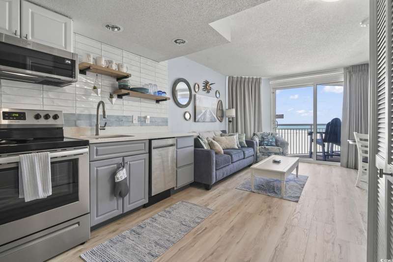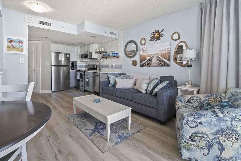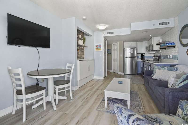 Welcome to Holiday Sands South! This beautifully updated 1-bedroom, 1-bath condo offers everything you need for the perfect coastal getaway or investment property. Thoughtfully designed, it features two custom vanities with quartz countertops—one inside the bathroom and one conveniently outside. The brand-new light LVP flooring flows seamlessly throughout the unit, creating a fresh, modern feel. The primary bedroom is plenty big for a king-size bed, walk-in closet, and large owner’s closet for extra storage. In the kitchen, you’ll find quartz countertops, a stylish tile backsplash, stainless steel appliances, pantry, and coastal-inspired finishes. Extra sleeping space comes from a tucked-away Murphy bed. Step onto your 10th-floor balcony, complete with Polywood captain’s chairs, and soak in the breathtaking ocean views—perfect for morning coffee or afternoon cocktails. Holiday Sands South offers top-notch amenities, including an oceanfront pool, indoor pool, lazy river, hot tub, fitness center, and oceanfront café. You’re just minutes from Myrtle Beach International Airport, The Market Common, and the iconic Myrtle Beach Boardwalk. HOA covers all utilities, exterior insurance, and H06 policy for peace of mind. Additional perks include an in-unit washer/dryer. Don’t miss your chance to own a turn-key ocean-view retreat in one of the Grand Strand’s most desirable oceanfront resorts!
