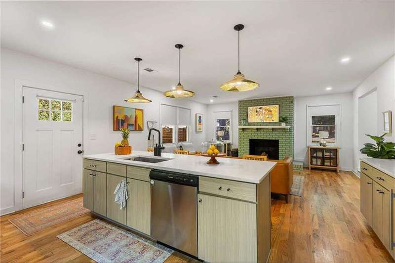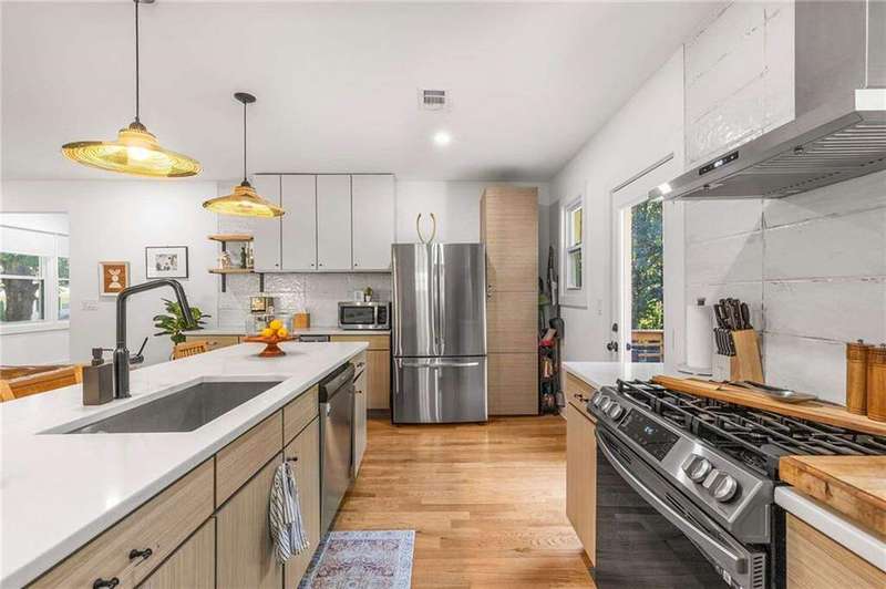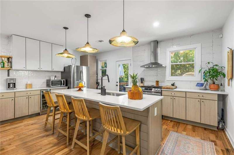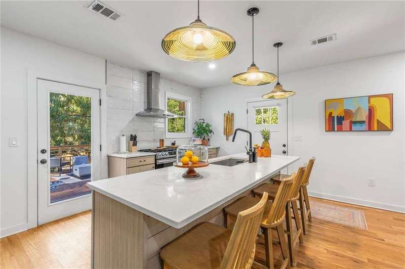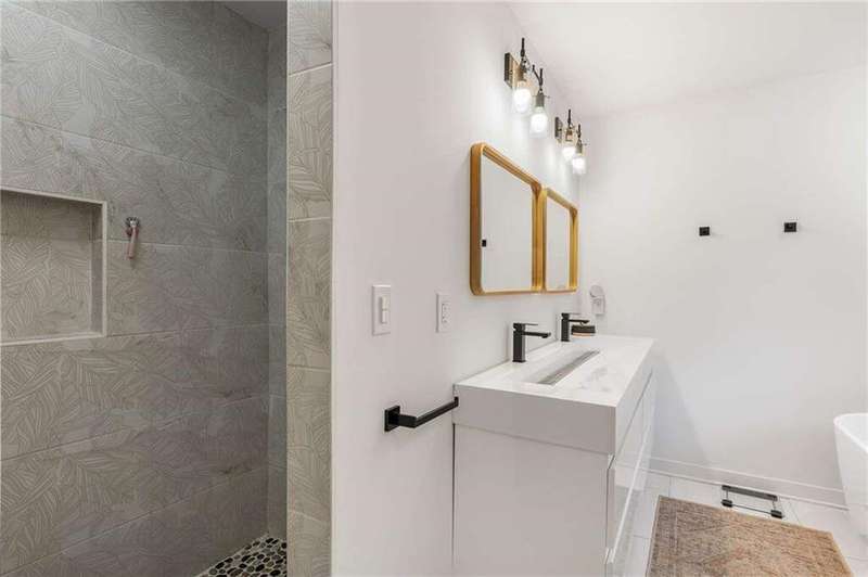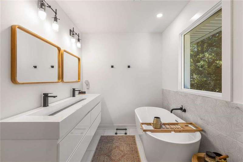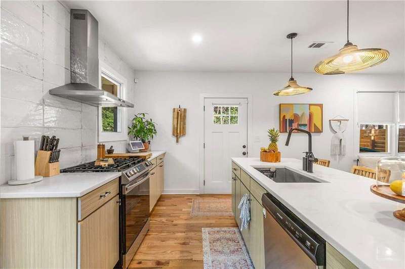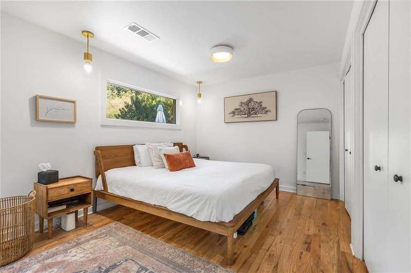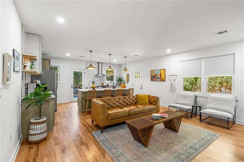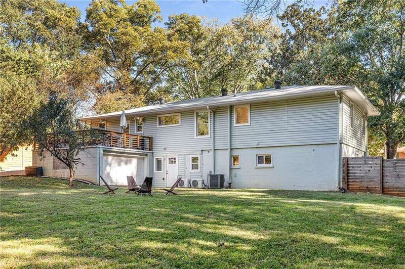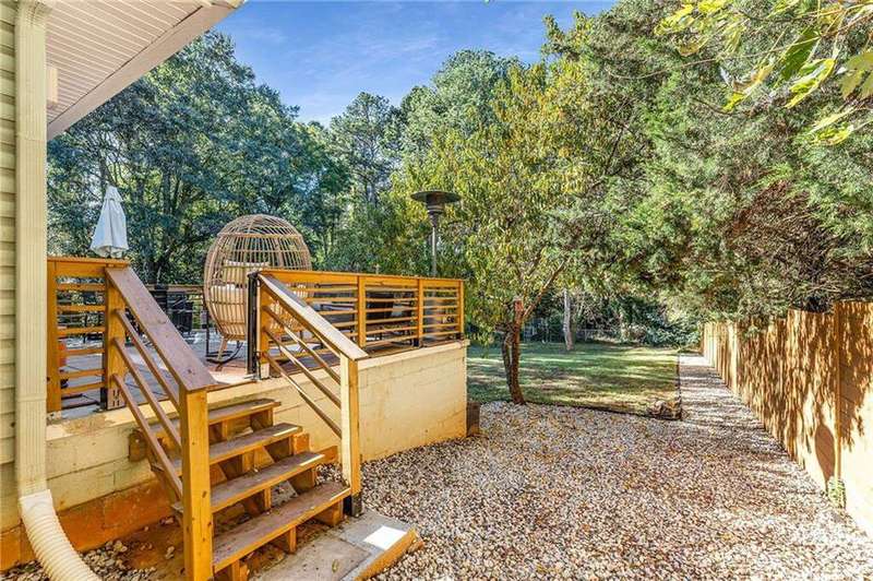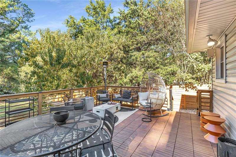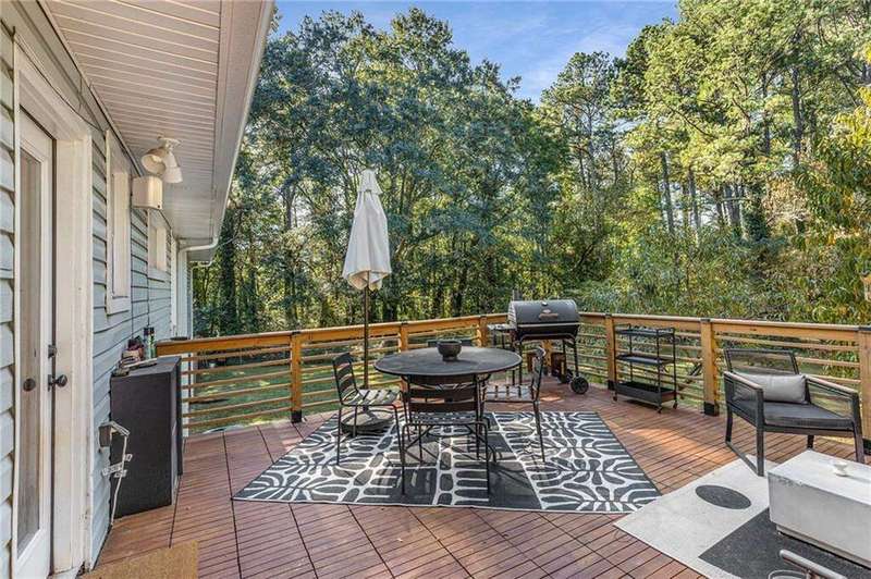 An architectural-modern showpiece on an expansive double lot, this residence marries relaxed sophistication with luminous, open-concept living and a floor plan made for gathering. A dramatic central core showcases a sunken living room anchored by clean lines and generous glazing, flowing seamlessly into a designer kitchen with statement island, premium finishes, and purposeful storage. Multiple doors open to outdoor living-including a treehouse-style deck nestled in the canopy creating effortless indoor-outdoor continuity for morning coffee, weeknight dinners, and weekend entertaining. The luxury-inspired owner's suite is a private retreat, appointed with a beautifully tiled bath featuring a soaking tub, oversized walk-in shower, and a sleek floating double vanity. Throughout the main level, hardwood floors and curated lighting elevate the ambiance, while sightlines extend to the grounds, emphasizing space and serenity. Down a wide, elegant staircase, the finished terrace level functions as a true second living zone-perfect for multi-gen living, guests, or an epic media/game area-with two additional bedrooms, a full bath, and a large living/rec room with flexible zones for work and play. A second driveway simplifies access and parking, and a bonus garage offers limitless potential for a studio, gym, she-shed, or workshop. Thoughtful design, abundant natural light, and versatile spaces culminate in a rare, refined retreat crafted for elevated everyday living and unforgettable gatherings. Located in the highly desired King Springs School District. Close to Silver Comet Trail, Food Trucks, Smyrna Market Village and The Battery.